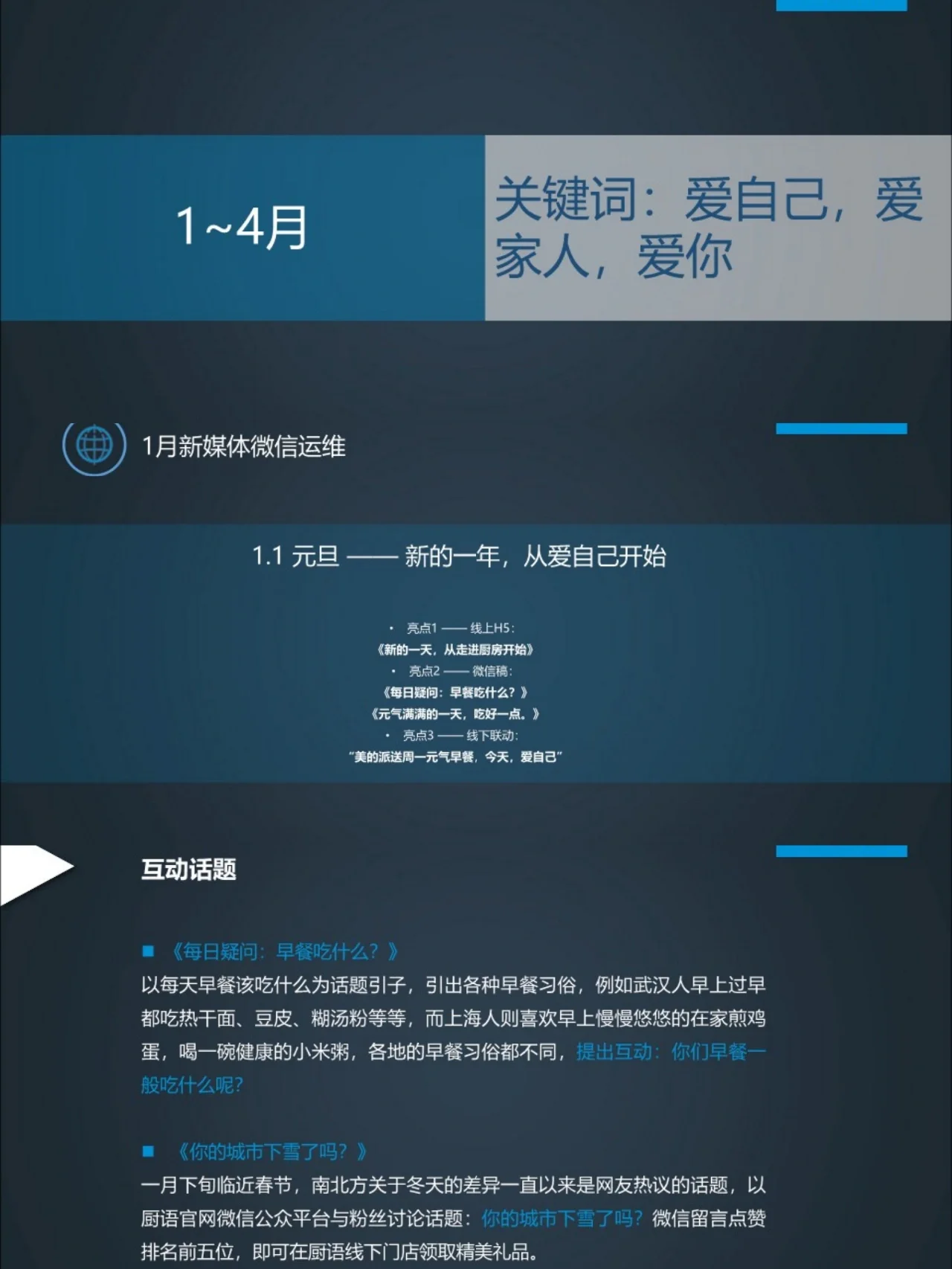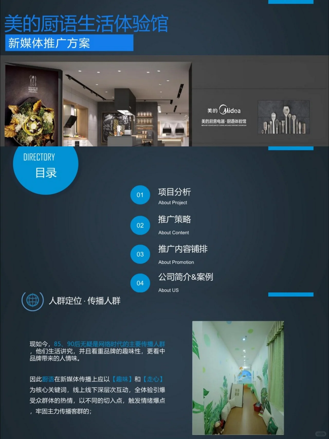 ? 今天我們來分析一下美的廚語生活體驗(yàn)館的新媒體推廣計(jì)劃 ?? 項(xiàng)目分析 ·項(xiàng)目定位 ·人口分析:傳播者與消費(fèi)者 ·競(jìng)爭(zhēng)分析 ?? 推廣策略 ·創(chuàng)建平臺(tái)角色 ·建立粉絲心態(tài) ·移動(dòng)新媒體內(nèi)容為王 ?? 推廣內(nèi)容布局 ·思路建設(shè) ·營(yíng)銷布局 ·分階段關(guān)注運(yùn)營(yíng)和互動(dòng) 空間有限,內(nèi)容呈現(xiàn)不完整