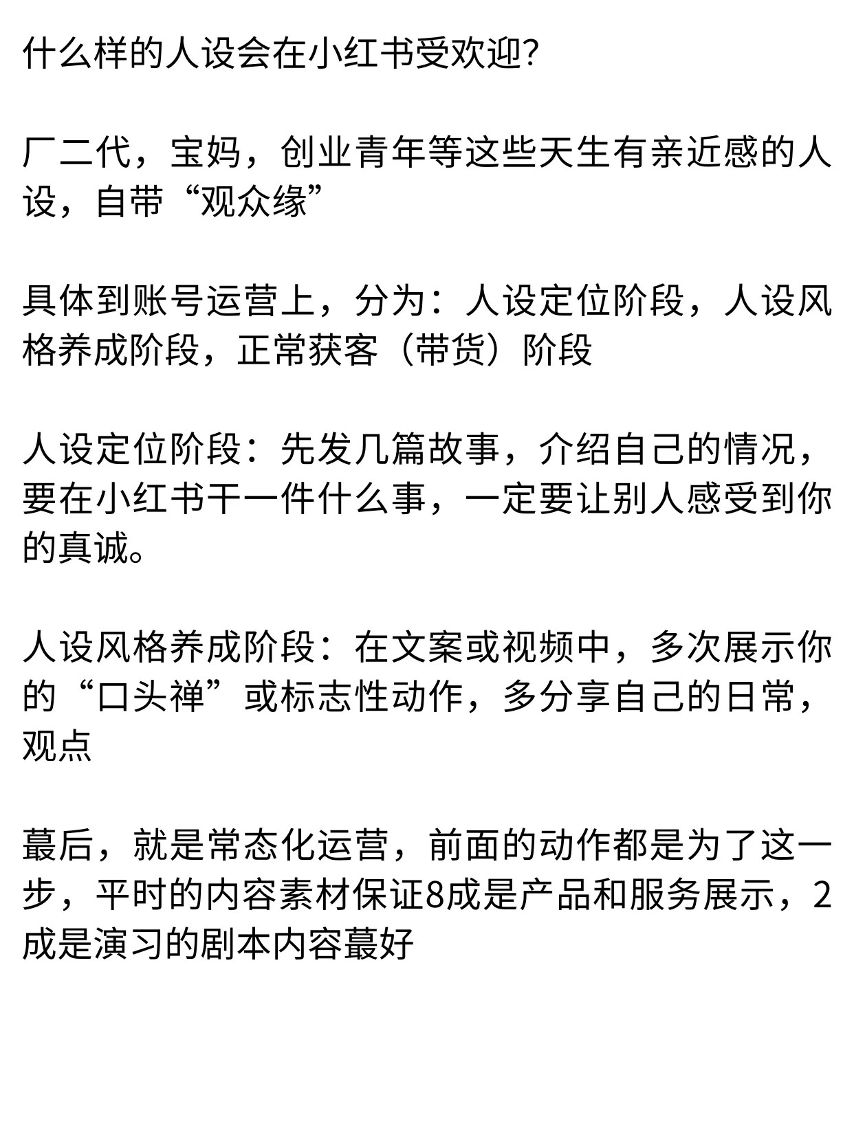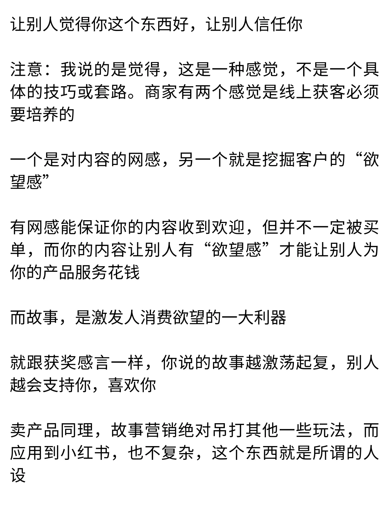 要在小紅書做生意,你需要能夠行動(dòng)。在生活中進(jìn)入戲劇完全取決于演技,做小紅書也是如此。我們該怎么說呢 在昨天的筆記中,我提到了一個(gè)在小紅書上找客戶賣牛肉丸的案例。幾個(gè)月前,我還分享了第二代工廠銷售絲綢產(chǎn)品的案例。他們都有一個(gè)特點(diǎn):擅長講故事??! 小紅書用戶以女性為主,這意味著紅書的消費(fèi)群體是在購買東西或服務(wù)。你談?wù)摰膬?nèi)容越具體、越客觀,你可能會(huì)覺得越冗長。 當(dāng)然,你需要對產(chǎn)品有基本的專業(yè)水平,但這不需要一直反映在你的筆記中。完成筆記后,實(shí)現(xiàn)一個(gè)目標(biāo)就足夠了: 讓別人認(rèn)為你是件好事,讓他們信任你 注:我想說的是,這是一種感覺,而不是一種特定的技巧或慣例。為了在網(wǎng)上吸引客戶,企業(yè)必須培養(yǎng)兩種感情。一種是對內(nèi)容的網(wǎng)絡(luò)感,另一種是挖掘客戶的欲望。擁有網(wǎng)絡(luò)感可以確保你的內(nèi)容受到歡迎,但不一定是付費(fèi)的。你的內(nèi)容可以讓別人產(chǎn)生欲望,從而讓別人在你的產(chǎn)品和服務(wù)上花錢 故事是激發(fā)人們消費(fèi)欲望的有力工具,就像演講和演講一樣。你講的故事越精彩,別人就會(huì)越支持你,越喜歡你銷售產(chǎn)品。同樣,故事營銷肯定勝過其他游戲,當(dāng)應(yīng)用于小紅書時(shí),它并不復(fù)雜。這就是所謂的人物設(shè)計(jì) 什么樣的人物形象會(huì)在小紅書上流行二代工廠、媽媽、創(chuàng)業(yè)青年等具有天然親近感的人,都有自己的“受眾吸引力”。具體來說,在賬戶運(yùn)營方面,可以分為三個(gè)階段:角色定位階段、角色風(fēng)格發(fā)展階段和正常的獲客(銷售)階段 個(gè)性定位階段:首先,分享一些關(guān)于自己的故事,介紹自己的情況,在小紅書上做點(diǎn)什么,確保別人感受到你的真誠。 個(gè)性風(fēng)格發(fā)展階段:在文案或視頻中,多次展示你的“流行語”或標(biāo)志性動(dòng)作,更多地分享你的日常生活和觀點(diǎn) 之后,它是規(guī)范化操作。前面的操作都用于此步驟,確保80%的內(nèi)容和材料用于產(chǎn)品和服務(wù)顯示,20%用于練習(xí)腳本。