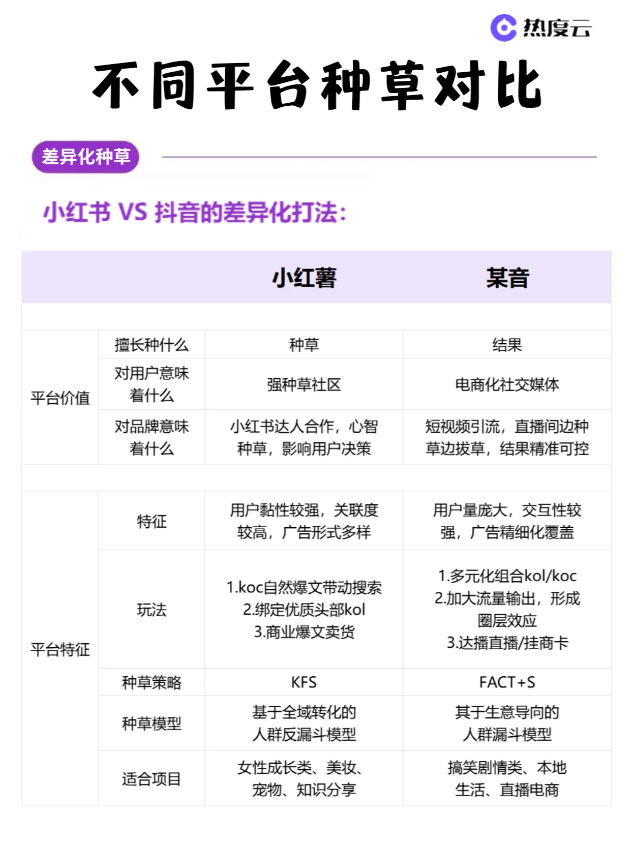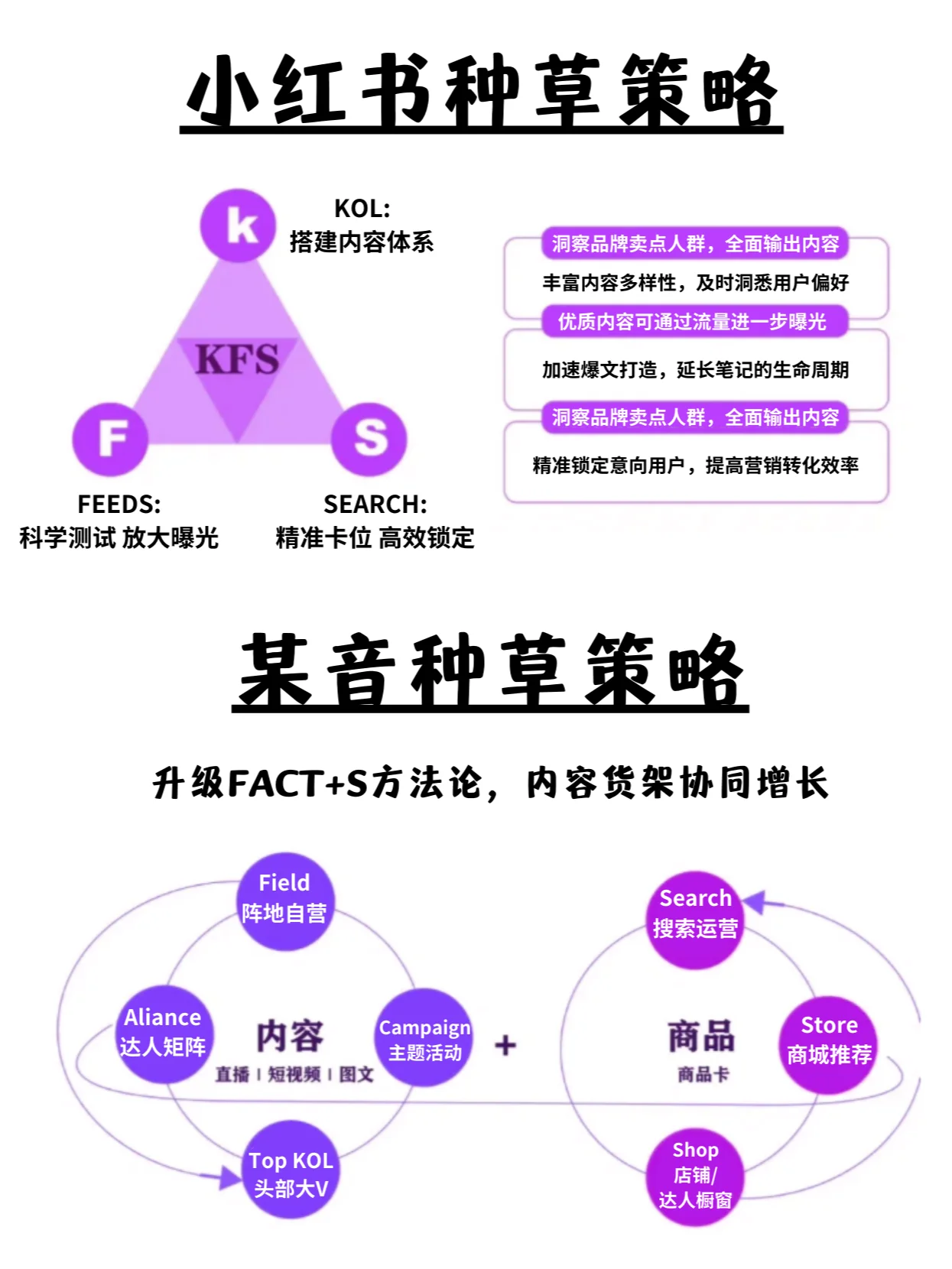 如何選擇植草平臺(tái) 如何在不同平臺(tái)上創(chuàng)建“差異化”種子 有什么區(qū)別 這些一直都是品牌方關(guān)心的問(wèn)題 其實(shí)很簡(jiǎn)單,你能用一塊手表處理所有事情嗎 小紅書(shū)(強(qiáng)種草社區(qū)),用戶在這里分享生活經(jīng)驗(yàn)、使用技巧、購(gòu)物體驗(yàn)等信息,為其他用戶種草 種草策略:KFS營(yíng)銷(xiāo)組合策略 抖音(電商社交媒體),通過(guò)“人、貨、場(chǎng)”三要素實(shí)現(xiàn)種草,滿足和激發(fā)用戶潛在的購(gòu)物興趣 種草策略:FACT+S綜合管理方法論 這兩個(gè)主要平臺(tái)是否有不同的種草策略及其適用的游戲性,在選擇不同的廣告平臺(tái)時(shí),考慮廣告目的、目標(biāo)受眾特征等也很重要 選擇合適的平臺(tái),做好差異化播種,長(zhǎng)期的品牌管理已經(jīng)成功了一半