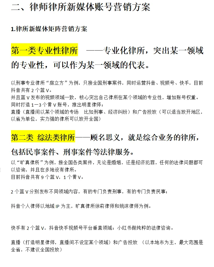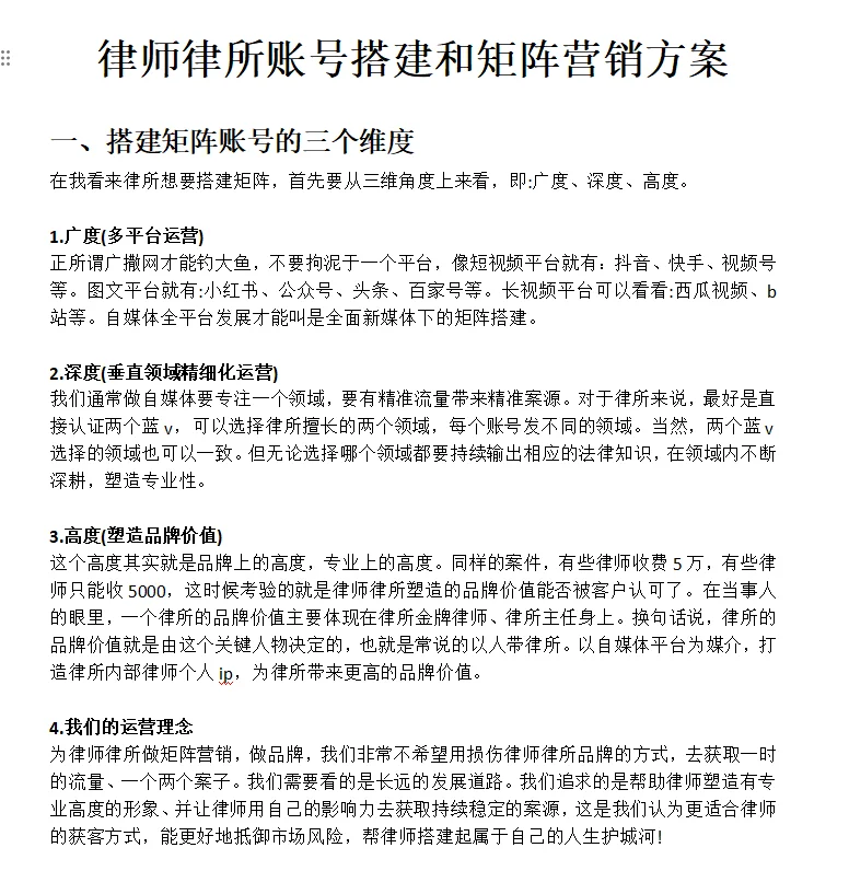 在我看來,如果一家律師事務(wù)所想要構(gòu)建一個矩陣,首先必須從三維的角度來看待,即廣度、深度和高度。 1。廣度(多平臺操作) 2。深度(垂直字段中的精細(xì)操作) 3。身高(塑造品牌價值) 二、律師事務(wù)所新媒體賬號營銷計劃 第一類專業(yè)律師事務(wù)所——專業(yè)化律師事務(wù)所,突出某一領(lǐng)域的專業(yè)性,可以作為某一領(lǐng)域代表。 第二類綜合性律師事務(wù)所——顧名思義,是一家為民事和刑事案件提供法律服務(wù)的綜合型律師事務(wù)所。 第三類律師——不是與律師事務(wù)所打包,而是建立在自己的個人知識產(chǎn)權(quán)之上。