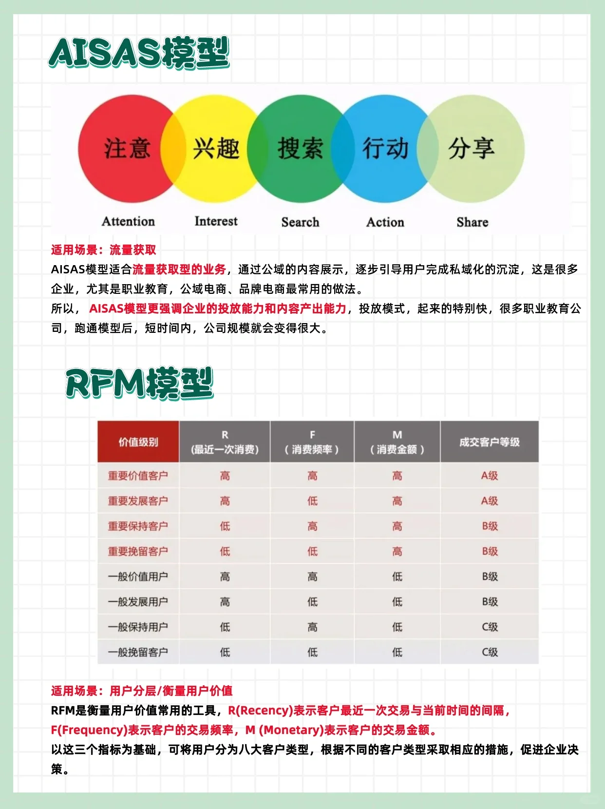 ? 你好,這里是一個(gè)私域深度運(yùn)營(yíng)的干貨分享~ - 私人領(lǐng)域已經(jīng)成為一種標(biāo)準(zhǔn)游戲。我之前分享過(guò)ALi的絕密運(yùn)作模式:AIPL模式。今天,在這篇筆記中,我將同時(shí)與大家分享六款車型。 - AISAS模型 ? AISAS模型適用于流量采集業(yè)務(wù)。通過(guò)公域內(nèi)容的展示,逐步引導(dǎo)用戶完成私域的沉淀。這是許多企業(yè)的普遍做法,尤其是職業(yè)教育、公共領(lǐng)域電子商務(wù)和品牌電子商務(wù)。 - RFM模式 ? RFM是衡量用戶價(jià)值的常用工具,其中R(Recency)表示客戶上次交易與當(dāng)前時(shí)間之間的間隔,F(xiàn)(Frequency)表示用戶的交易頻率,M(Monetary)表示客戶的交易金額。 - AARR模型 ? AARRR模型是私域流量運(yùn)營(yíng)中常見(jiàn)的模型之一。通過(guò)獲客、激活、留存、貨幣化和傳播五個(gè)流程,協(xié)助商家發(fā)現(xiàn)來(lái)自公域的新流量,建立自己的“私域流量池”。 - 用戶金字塔模型 ? 在實(shí)際工作中,用戶可以通過(guò)使用得到有效的管理;每個(gè)模塊都可以進(jìn)一步分解成小金字塔作為管理工具,以增加用戶之間的關(guān)系。 - 用戶生命周期模型 ? 簡(jiǎn)單地說(shuō),用戶的生命周期是從用戶開(kāi)始接觸私有域到離開(kāi)的整個(gè)過(guò)程。可分為:引進(jìn)期、成長(zhǎng)期、穩(wěn)定期、衰退期和虧損期。 - 用戶成癮模型 ? 設(shè)計(jì)用戶成癮模型的目的是引導(dǎo)用戶養(yǎng)成積極的行為,并習(xí)慣于游戲或系統(tǒng)。 - ? 案例分享|運(yùn)營(yíng)經(jīng)驗(yàn)|個(gè)人提升 ? 點(diǎn)擊我的個(gè)人資料圖片查看更多知識(shí)筆記~