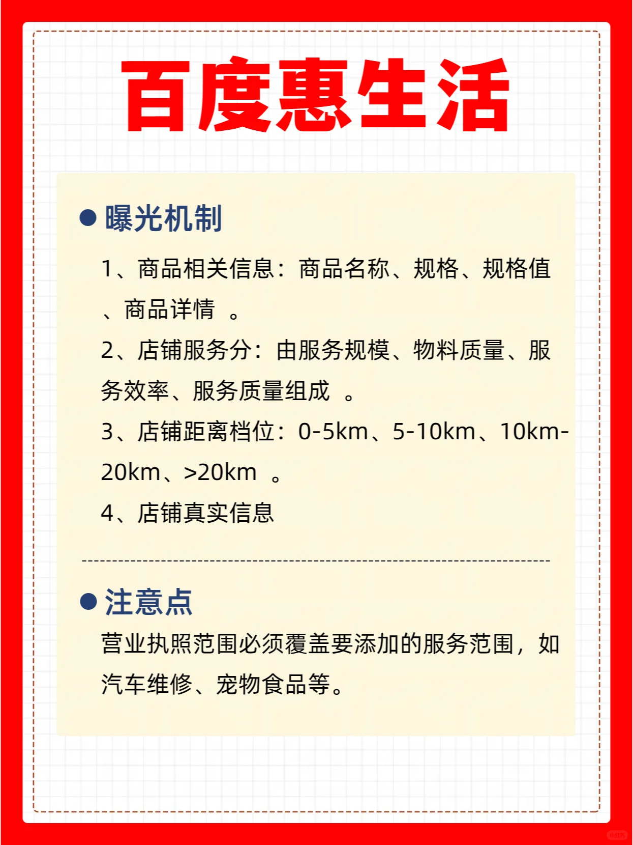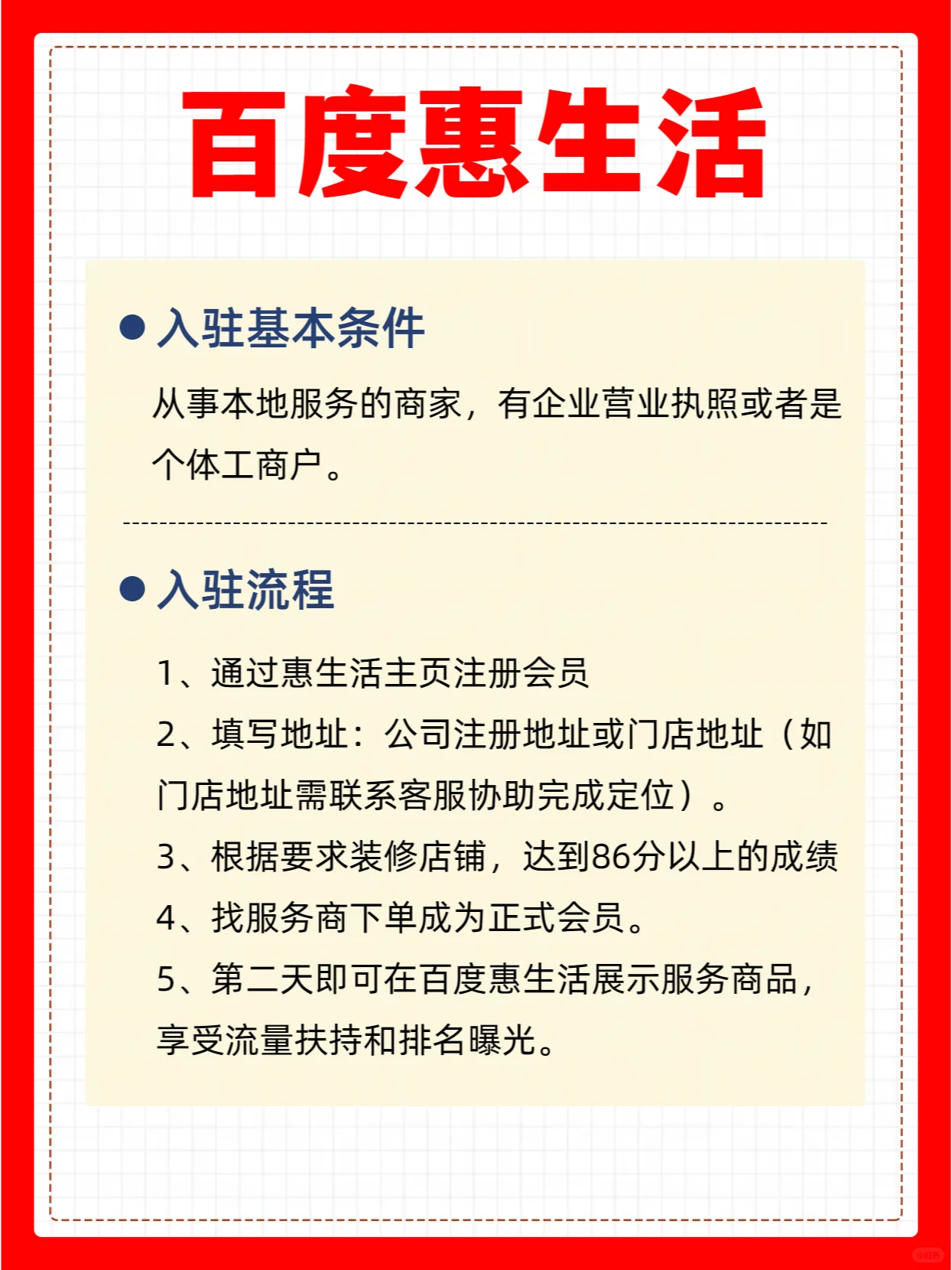 ? 基本條件 從事本地服務(wù)的商戶有營業(yè)執(zhí)照還是個體工商戶 ?? 是否注冊為會員 通過惠生活主頁注冊成為會員 填寫地址:公司注冊地址或店鋪地址(如果需要聯(lián)系店鋪地址以獲得客服幫助以完成本地化) 建門店,門店質(zhì)檢得分超過86分后 服務(wù)提供商下訂單成為正式會員什么 第二天,你可以在百度匯生活上展示你的服務(wù)產(chǎn)品,享受流量支持和排名曝光。 ?? 準(zhǔn)備信息 產(chǎn)品相關(guān)信息:產(chǎn)品名稱、規(guī)格、規(guī)格值、產(chǎn)品詳細(xì)信息 門店服務(wù)分為服務(wù)規(guī)模、物料質(zhì)量、服務(wù)效率和服務(wù)質(zhì)量 : 門店距離范圍:0-5公里、5-10公里、10km-20km、>20km 真實信息 ? 注意點 營業(yè)執(zhí)照的范圍必須包括要增加的服務(wù),如汽車修理、寵物食品等