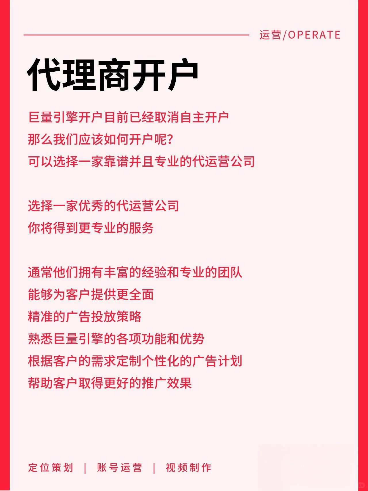 ?? 親愛(ài)的朋友們,今天我想和大家聊一聊為海量引擎開(kāi)戶(hù)的事!你注意到自己為大型引擎開(kāi)戶(hù)和為代理商開(kāi)戶(hù)的區(qū)別了嗎在2022年3月之前,我們?nèi)匀豢梢蚤_(kāi)立自己的賬戶(hù),但現(xiàn)在這個(gè)端口已經(jīng)關(guān)閉,甚至我們之前的自營(yíng)賬戶(hù)也被撤銷(xiāo)了。那么,開(kāi)設(shè)代理賬戶(hù)有什么好處呢接下來(lái),我將為您解開(kāi)這個(gè)謎團(tuán),并幫助您了解自己為大型引擎開(kāi)戶(hù)和為代理商開(kāi)戶(hù)之間的區(qū)別! 自己開(kāi)戶(hù)和代理開(kāi)戶(hù)的區(qū)別 過(guò)去,我們也可以登錄我們的信息和賬戶(hù)申請(qǐng)開(kāi)戶(hù)協(xié)議,并開(kāi)立自己的賬戶(hù)。然而,從2022年3月開(kāi)始,巨人引擎關(guān)閉了這個(gè)自開(kāi)端口,并收回了之前的自開(kāi)賬戶(hù)。這導(dǎo)致許多人考慮開(kāi)設(shè)代理賬戶(hù)。那么,開(kāi)設(shè)代理賬戶(hù)有什么好處呢 第二段中大量身份證代理人的優(yōu)勢(shì) 一個(gè)龐大的身份代理可以開(kāi)設(shè)一個(gè)主賬戶(hù),并擁有無(wú)數(shù)的子賬戶(hù)。這種開(kāi)戶(hù)方式可以更方便地管理不同的賬戶(hù),靈活調(diào)整促銷(xiāo)策略,提高促銷(xiāo)效率。對(duì)于那些需要同時(shí)推廣多個(gè)項(xiàng)目或客戶(hù)的人,代理開(kāi)戶(hù)提供了一個(gè)更方便、更高效的解決方案。 第3款:代理開(kāi)戶(hù)的專(zhuān)業(yè)服務(wù) 選擇一個(gè)龐大的ID代理來(lái)開(kāi)戶(hù),將為您提供更專(zhuān)業(yè)的服務(wù)。代理商通常擁有豐富的經(jīng)驗(yàn)和專(zhuān)業(yè)的團(tuán)隊(duì),可以為客戶(hù)提供更全面、準(zhǔn)確的廣告策略。他們熟悉海量引擎的各種功能和優(yōu)勢(shì),可以根據(jù)客戶(hù)需求定制個(gè)性化的廣告計(jì)劃,幫助客戶(hù)獲得更好的推廣效果。 ?? 嘿基于以上對(duì)比,你應(yīng)該對(duì)自己和代理商為海量引擎開(kāi)戶(hù)有了更清晰的認(rèn)識(shí)吧 代理開(kāi)戶(hù)提供更便捷、更靈活、更專(zhuān)業(yè)的服務(wù),讓您更擅長(zhǎng)廣告投放! 如果您有任何進(jìn)一步的問(wèn)題或需要幫助,請(qǐng)留言并讓老周知道。讓我們一起探索廣告的奧秘!