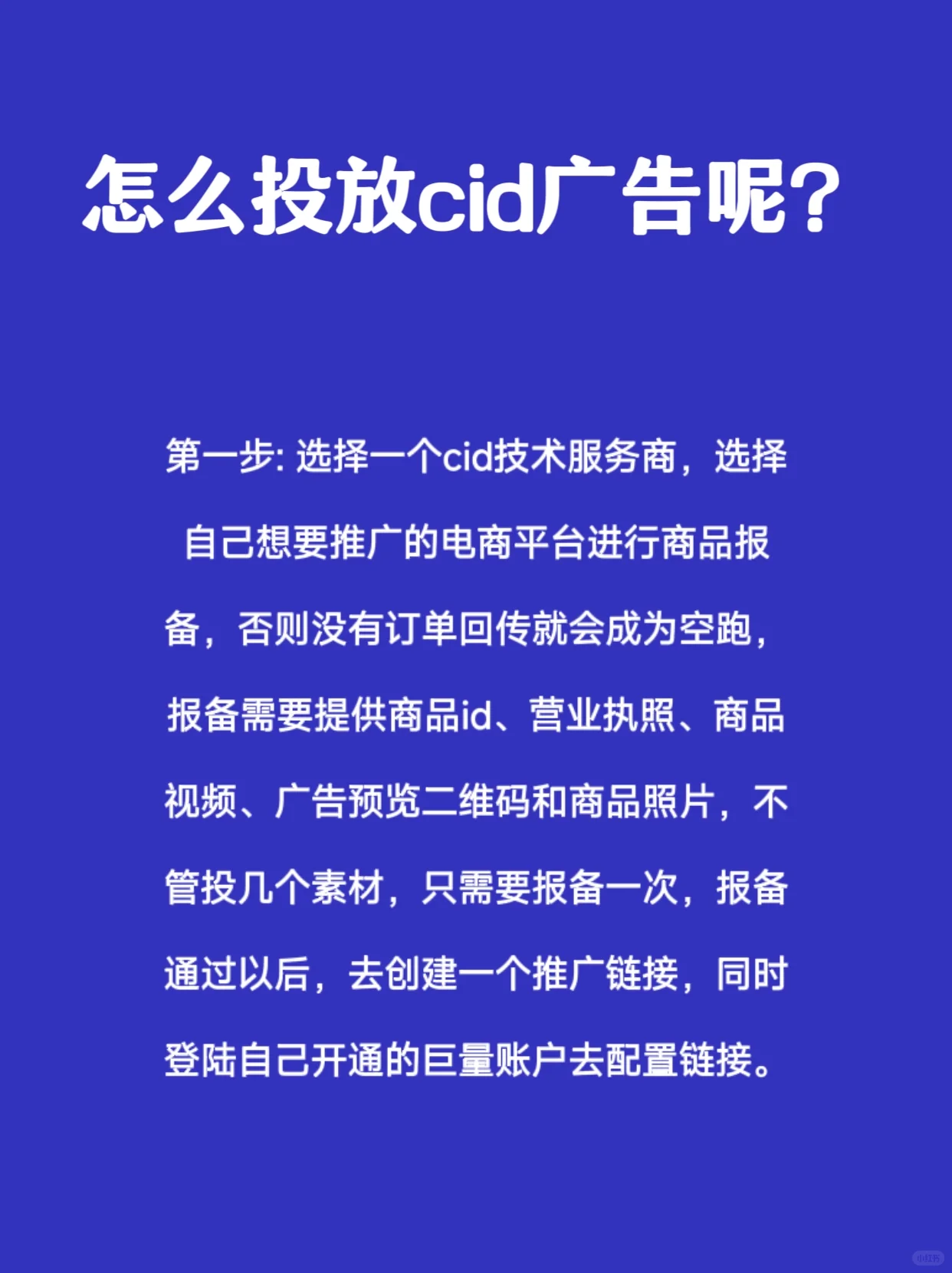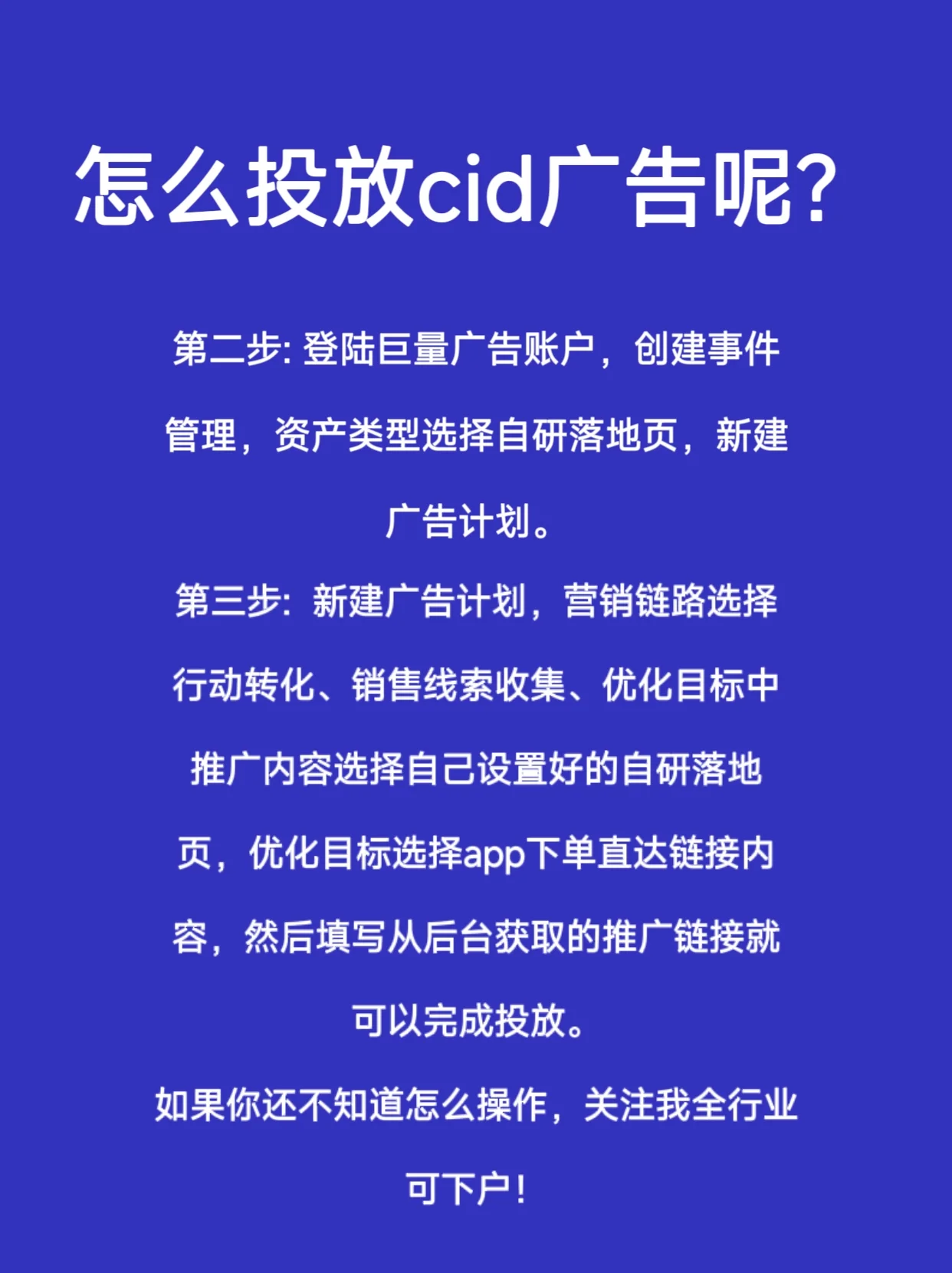 如何放置cid廣告 步驟1:選擇CID技術(shù)服務(wù)提供商,并選擇您想要推廣的電子商務(wù)平臺進(jìn)行產(chǎn)品報(bào)告。否則,如果沒有訂單反饋,它將變成空運(yùn)行。舉報(bào)要求提供產(chǎn)品ID、營業(yè)執(zhí)照、產(chǎn)品視頻、廣告預(yù)覽二維碼、產(chǎn)品照片。無論你提交了多少材料,你只需要報(bào)告一次。報(bào)告批準(zhǔn)后,創(chuàng)建一個(gè)推廣鏈接,并登錄您打開的海量帳戶來配置鏈接 第二步:登錄海量廣告賬號,創(chuàng)建事件管理,選擇自主開發(fā)的資產(chǎn)類型登陸頁面,創(chuàng)建新的廣告計(jì)劃 第三步:創(chuàng)建新的廣告計(jì)劃,為營銷環(huán)節(jié)選擇行動轉(zhuǎn)化,收集銷售線索,優(yōu)化目標(biāo)中的促銷內(nèi)容。選擇您已經(jīng)設(shè)置好的自研登陸頁面,選擇應(yīng)用程序直接向鏈接內(nèi)容下單,然后填寫從后臺獲得的推廣鏈接即可完成下單