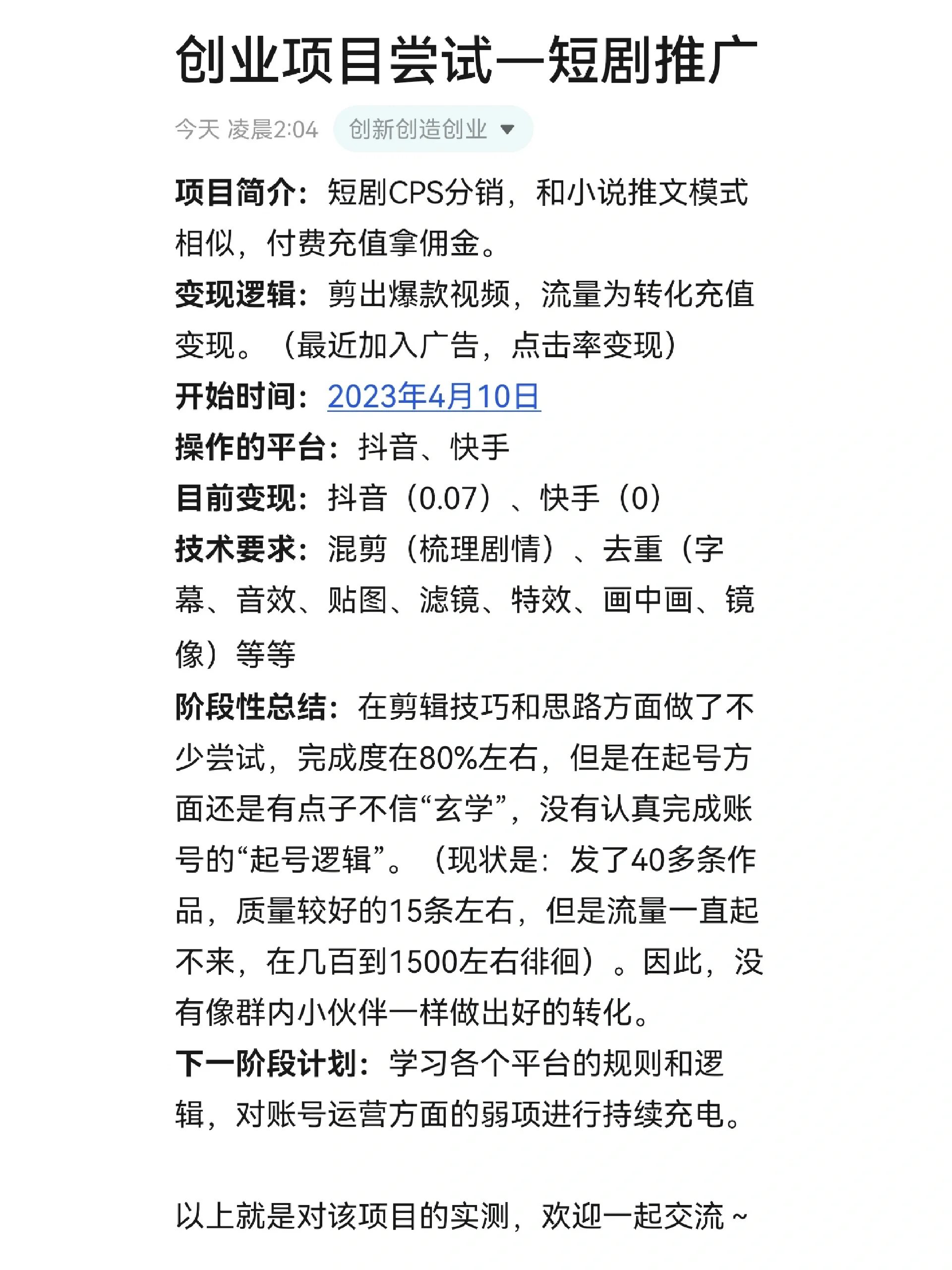 項目簡介:短劇集的CPS發(fā)行,類似于新穎的推特模式,有付費充值和傭金。 貨幣化邏輯:去掉熱門視頻,轉(zhuǎn)換流量進行充值和貨幣化。(最近加入的廣告,貨幣化點擊率) 開始日期:2023年4月10日 運營平臺:抖音、快手 目前變現(xiàn):抖音(0.07)、快手(0) 技術要求:混合裁剪(組織情節(jié))、重復數(shù)據(jù)消除(字幕、音效、紋理、濾鏡、特效、畫中畫、鏡像)等 階段總結:我在編輯技巧和思路上做了很多嘗試,完成率在80%左右。然而,我對帳號的編號仍然有一些想法,我不相信“神秘主義”,也沒有認真完成我?guī)ぬ柕摹熬幪栠壿嫛?。目前的情況是,已經(jīng)出版了40多部作品,其中約15部質(zhì)量良好,但流量一直停滯不前,徘徊在幾百到1500部之間。因此,他們并沒有像小組中的同齡人那樣進行良好的轉(zhuǎn)化。 下一階段計劃:學習每個平臺的規(guī)則和邏輯,不斷為賬戶運營中的弱點充電。 以上是本項目的實際測量結果。歡迎大家一起交流