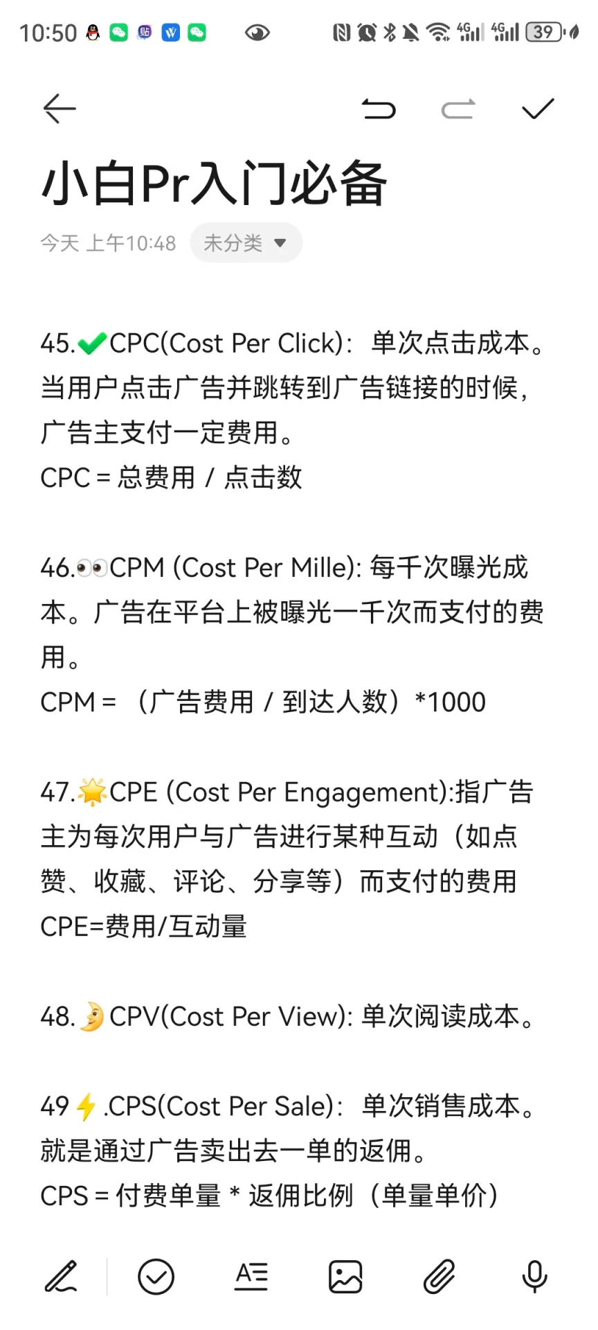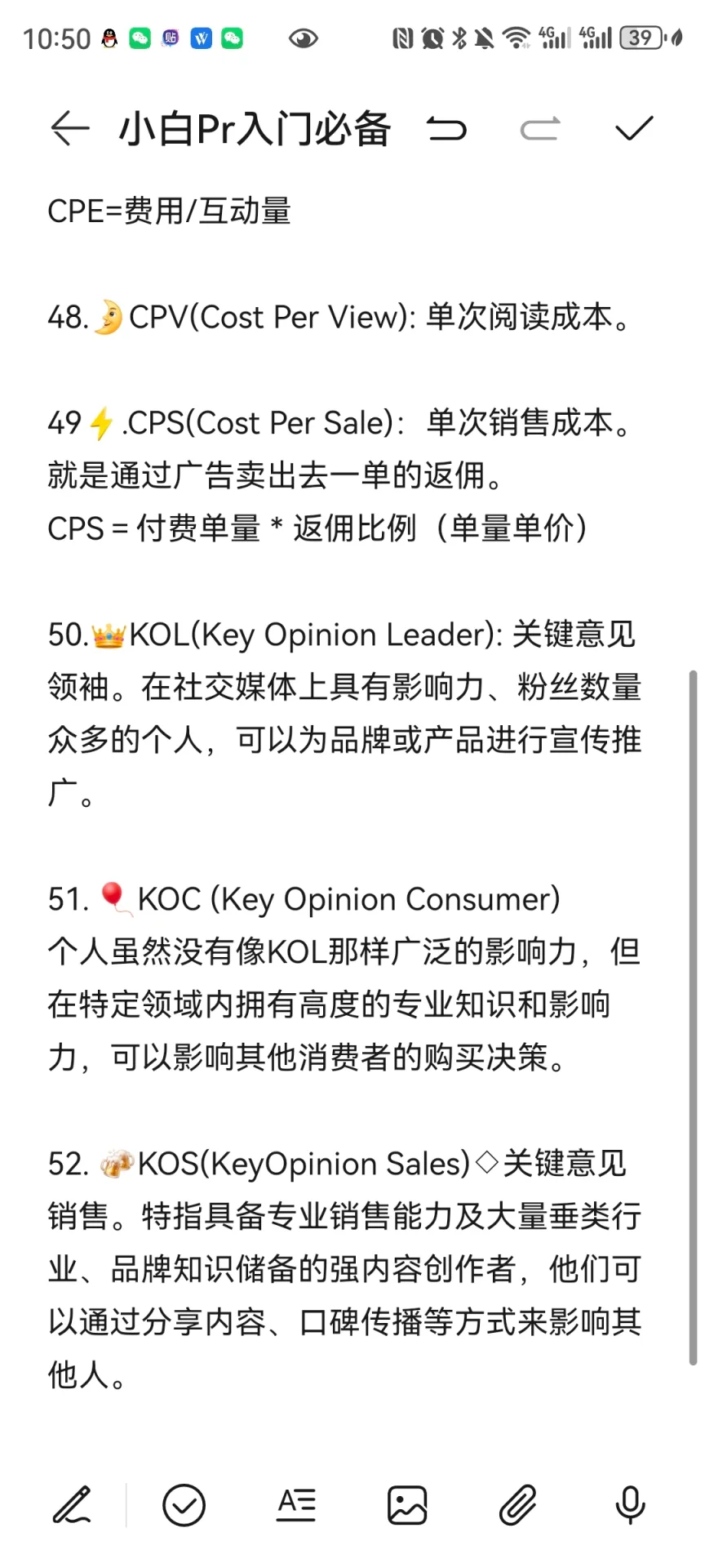 大家好,我是小麒麟, 今天,繼續(xù)前面的內容,讓我們繼續(xù)分享一些關于PR計費方式和專有條款的信息 45? CPC(點擊成本):點擊成本。當用戶點擊廣告并重定向到廣告鏈接時,廣告商支付一定的費用。 CPC=總成本/點擊量 46? CPM(每千年成本):每千次曝光的成本。廣告在平臺上曝光1000次所支付的費用。 CPM=(廣告成本/到達人數(shù))*1000 47? 每次參與成本(CPE):指廣告商為用戶和廣告之間的每次互動支付的費用,如點贊、書簽、評論、分享等 CPE=成本/交互量 48? CPV(每次查看的成本):每次讀取的成本。 49?. CPS(每次銷售成本):每次銷售的成本。它是通過廣告銷售單個訂單的傭金。 CPS=已付款訂單數(shù)量*折扣率(每訂單數(shù)量的單價) 50? KOL(關鍵意見領袖):關鍵意見領袖。在社交媒體上有影響力和大量追隨者的個人可以推廣他們的品牌或產品。 51? KOC(主要意見消費者) 盡管個人可能沒有KOL那么廣泛的影響力,但他們在特定領域擁有高水平的專業(yè)知識和影響力,這可以影響其他消費者的購買決策。 52? 關鍵意見銷售(KOS)◇ 關鍵意見銷售。它專門指在垂直行業(yè)和品牌中具有專業(yè)銷售能力和豐富知識的強大內容創(chuàng)作者。他們可以通過分享內容、口碑傳播和其他方式影響他人。 專家布局|普通店鋪數(shù)量|店鋪專家探索