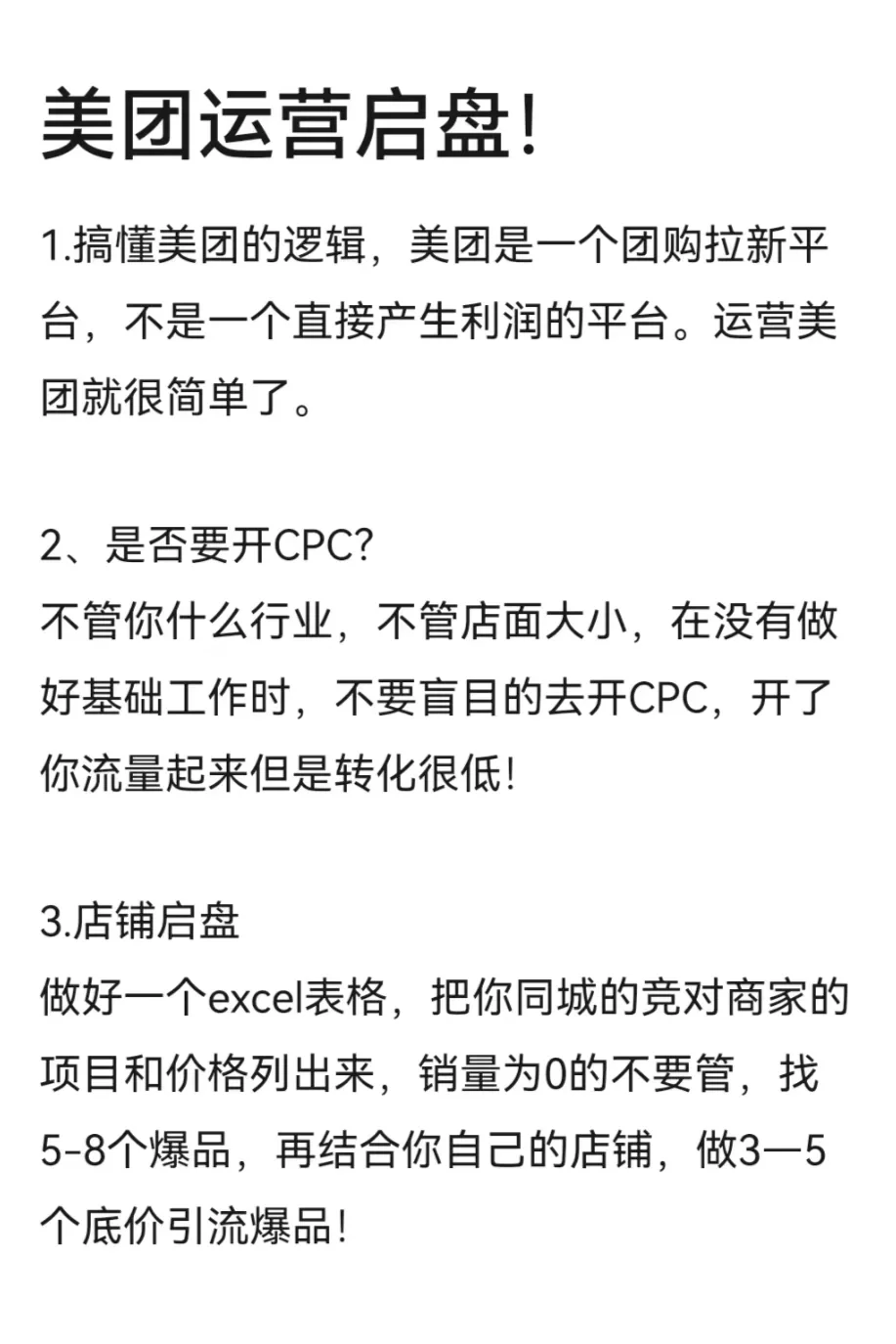 一? 理解美團(tuán)的邏輯。美團(tuán)是一個(gè)團(tuán)購(gòu)和收購(gòu)平臺(tái),而不是一個(gè)直接產(chǎn)生利潤(rùn)的平臺(tái)。運(yùn)營(yíng)美團(tuán)很簡(jiǎn)單 二? 你想打開CPC嗎不管你在哪個(gè)行業(yè),或者你的店有多大,不要在基礎(chǔ)工作沒(méi)有做好的情況下盲目開CPC,一旦開了,流量會(huì)增加,但轉(zhuǎn)化率會(huì)很低! 三? 門店開業(yè) 創(chuàng)建一個(gè)Excel電子表格,列出同一城市競(jìng)爭(zhēng)對(duì)手的項(xiàng)目和價(jià)格。不要擔(dān)心那些零銷售額的,找到5-8個(gè)爆品,并將其與自己的店鋪相結(jié)合,創(chuàng)造3-5個(gè)底價(jià)來(lái)吸引爆品! 四? 如何制作圖片 一定要把你的核心興趣包括在BANNER圖表中!主圖像應(yīng)重點(diǎn)突出項(xiàng)目效益,一目了然! 現(xiàn)在是視覺(jué)經(jīng)濟(jì),圖片看起來(lái)不好看,顧客也不會(huì)點(diǎn)擊進(jìn)去看! 五? 如何評(píng)估 如果你覺(jué)得你的服務(wù)很好,你可以做一頓王餐,基本評(píng)論的星級(jí)就會(huì)出來(lái)!美團(tuán)下的是爆品小訂單,分為兩類訂單。來(lái)店里的可以寫好評(píng),但不來(lái)店里的就不要寫了! 做好這些事情,你的店鋪就會(huì)慢慢成長(zhǎng)起來(lái)!