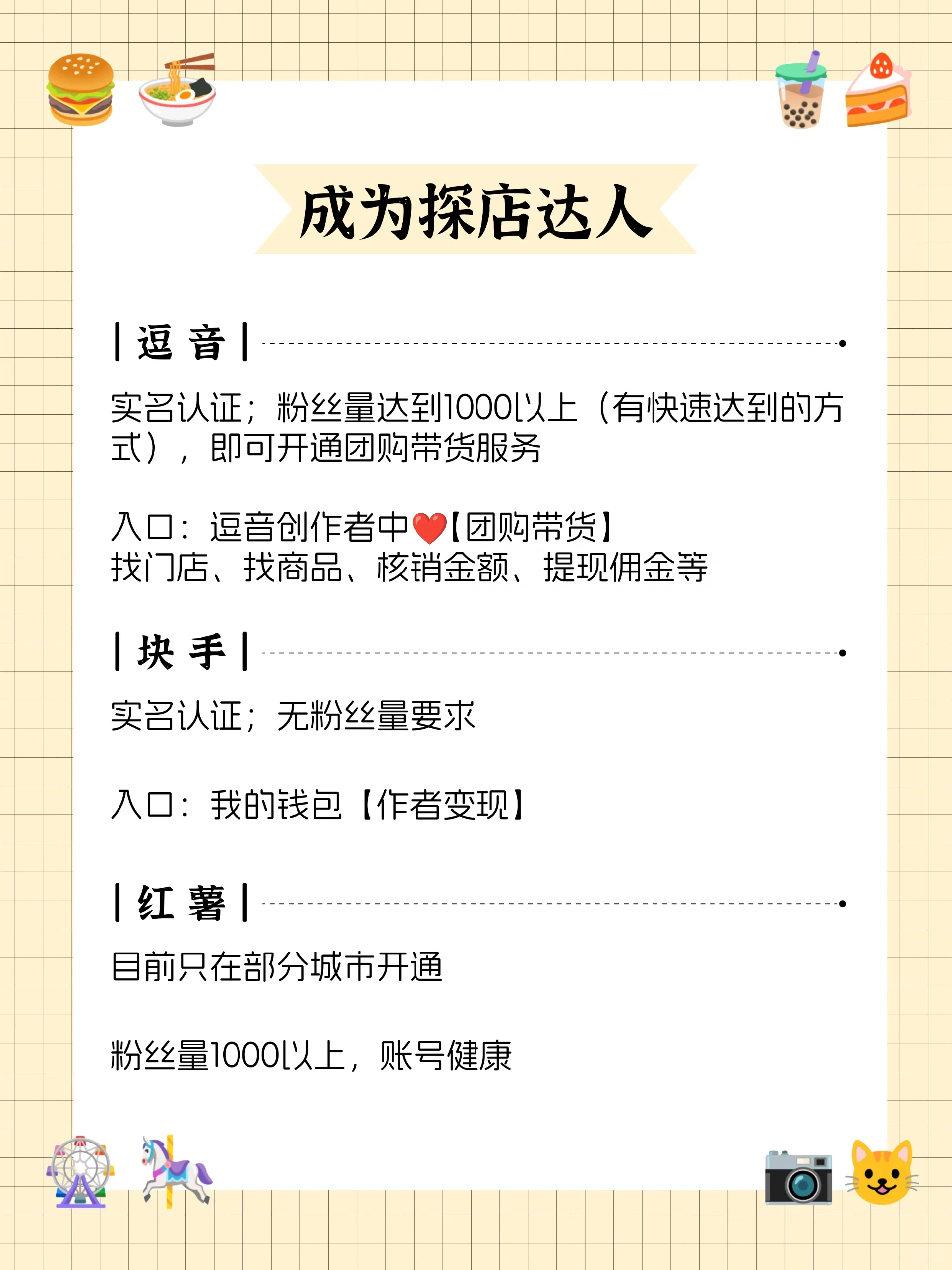 說到餐廳探險專家,很多人會想到那些到處吃吃喝喝的美食專家 —— 事實上,除了食品(餐廳),所有有實體店的線下商家都可以“探索” —— ? 探索商店類別(圖2) 一?? 餐飲 二?? 葡萄酒旅行 三?? 休閑娛樂 四?? 生活服務(wù) ? 統(tǒng)稱為當(dāng)?shù)厣罘?wù) ? 你可以選擇單一的賽道,如專門從事餐飲(美食專家)、白酒和旅游(旅游專家);你也可以選擇一條全面的賽道,做任何事情 —— ? 什么是探索商店 在實體店體驗產(chǎn)品或服務(wù)并分享經(jīng)驗 沒有商業(yè)模式的探店:互聯(lián)網(wǎng)平臺種草或拔草,純內(nèi)容共享 以商業(yè)模式探店:互聯(lián)網(wǎng)平臺種草引流門店,實現(xiàn)內(nèi)容變現(xiàn) —— ? 探索門店商業(yè)模式 一?? 商家或代理運營商可以在平臺上發(fā)起團購,并設(shè)置CPS傭金 二?? 在專家現(xiàn)場參觀商店后,平臺發(fā)布帶有POI(商店位置)的內(nèi)容(視頻或文本) 三?? 用戶可以查看影響者的內(nèi)容,點擊提供的POI,跳轉(zhuǎn)到團購頁面下單,驗證他們在商店的消費,并從影響者那里獲得CPS傭金收入 四?? 商家或代理運營商投資銷售業(yè)績好的有影響力的人的視頻 —— ? 探店收入構(gòu)成 一?? 車馬費 根據(jù)影響者級別、粉絲群等,有50到1000個選項+ 二?? CPS傭金收入 有很多實體餐飲店,銷售額高,傭金低 休閑娛樂,生活服務(wù)高傭金 三?? 商業(yè)訂單 四?? 探索商店直播 五?? 收頭(割韭菜) —— ? 訂單渠道 一?? 平臺商人廣場 二?? 專家組 三?? 本地生活MCN 四?? 第三方代理運營商 ? 訂單流程:注冊->商家反向選擇->參觀拍攝->剪輯成電影->商家審核成電影->審批上映->運輸運輸費用結(jié)算 —— ? 探索存儲方法 一?? 合作探店:免費吃喝玩樂,體驗(交流),收取商家運輸費,發(fā)布需要商家審批的視頻。如果它不好,就不能說它不好 二?? 自費逛店:自己花錢錢坦典,優(yōu)點是發(fā)送視頻不需要商家審核,可以真實 三?? 云探索店:商家或第三方運營商拍好素材照片,云編輯,無需在店內(nèi)實體探索,簡單但低成本 —— ? 如何成為店鋪探索專家(圖3) 主流平臺:豆聲音,塊手,紅的馬鈴薯 —— ? 優(yōu)點和缺點 一?? 優(yōu)點:門檻低,還可以圖文帶貨,任何人都可以做,可以做副業(yè);自由體驗(白色浮子[doge]);它與粉絲數(shù)量無關(guān),因此很容易下單 二?? 缺點:參與人數(shù)過多,頭部相對固定,競爭激烈;但仍有機會認(rèn)真對待? 機會,加入當(dāng)?shù)氐纳罘绞組CN會更好 —— ? 其他相關(guān)職位 一?? 業(yè)務(wù)拓展(BD):與商家洽談合作,在平臺上發(fā)起團購 二?? 專家操作:線上線下團購,招募探店專家?guī)ьI(lǐng)銷售等 ——