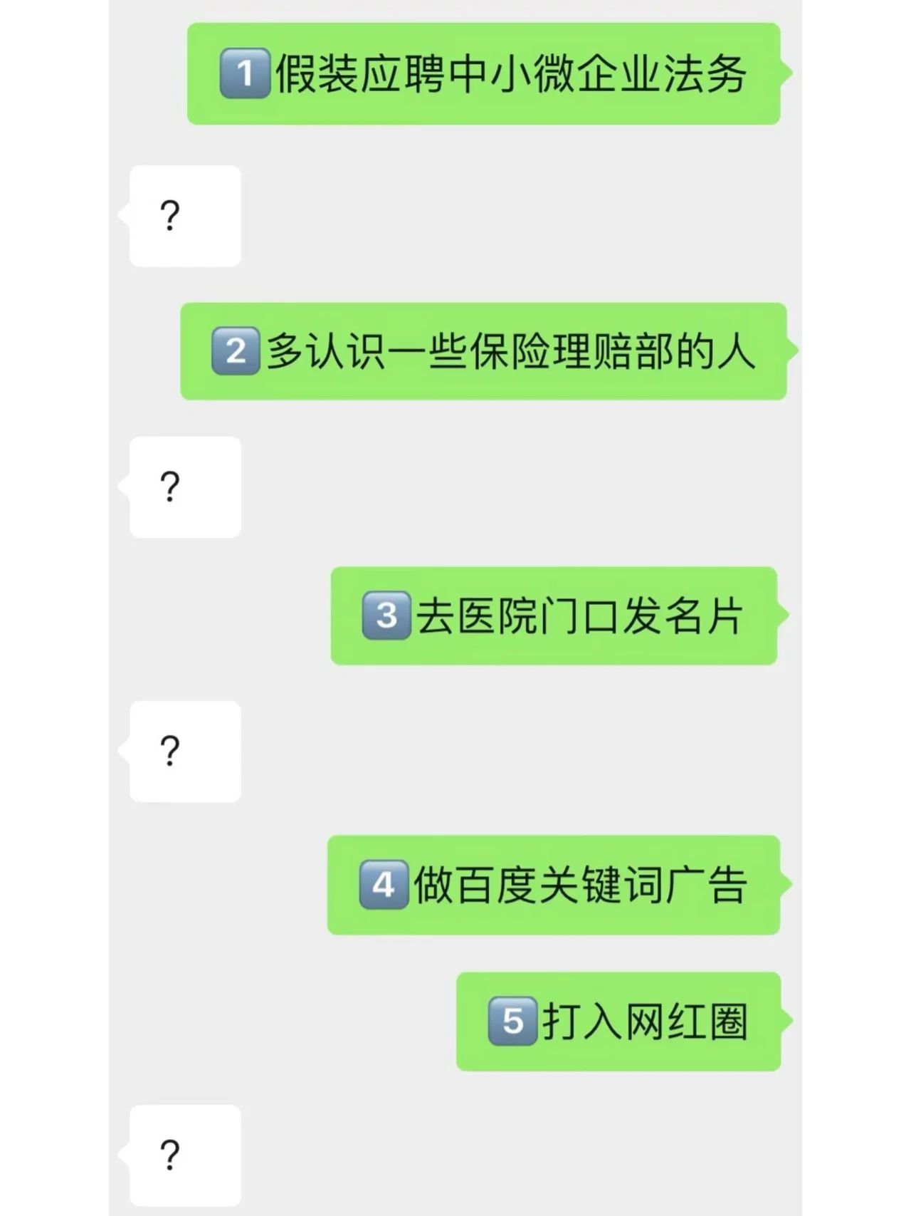 收集我周圍的真實人物和事件或小紅書上的評論區(qū)[偷偷R] 一? 假裝申請中小企業(yè)的法律職位 去求職網(wǎng)站尋找正在招聘法律服務(wù)的中小企業(yè),一定是中小企業(yè) 因為通常老板會直接面試你,但你可能沒有想過聘請外部律師,或者經(jīng)過評估,你可能認(rèn)為聘請法律代表會更劃算 所以你所需要做的就是讓老板相信找到你的好處遠(yuǎn)遠(yuǎn)大于成本 利益 既然他想聘請法定代表人,說明確實有法律需要,而且客戶來源準(zhǔn)確 缺點 這條路對于大企業(yè)來說是不可行的,因為他們通常面試你作為法定董事,而你仍然在與其他人競爭業(yè)務(wù),沒有任何機會 二? 了解更多保險理賠部門的人員 了解更多關(guān)于保險公司理賠部門或與保險公司合作的第三方合作伙伴(如評估師)的信息 他們將有大量客戶拒絕索賠,一旦掌握了合作渠道,他們將繼續(xù)充當(dāng)代理人 利益 這個案子簡單易贏 缺點 代理費不高。。主要是因為交通量大,我們需要足夠的人力,否則我們將無法處理 三? 在醫(yī)院門口寄名片 主要發(fā)生在車禍訴訟/建筑工地傷害案件中 利益 開展交通事故人身傷害案件,證據(jù)來源龐大、準(zhǔn)確 缺點 如果情商不夠高,發(fā)出無聲的聲音,對不對患者的情緒通常不好,他們很容易抗拒莫名其妙的銷售人員 四? 做百度關(guān)鍵詞廣告 尋找外部SEM優(yōu)化器來推廣網(wǎng)站和關(guān)鍵詞 百度作為一個擁有巨大市場份額的搜索引擎 通過關(guān)鍵詞吸引流量的效果依然顯著 利益 盡管大城市競爭激烈,但在二三線城市賺錢的可能性仍然很大 缺點 你正在尋找的SEM優(yōu)化器也應(yīng)該對法律行業(yè)有一些了解,否則這樣做純粹是給百度錢。。 五? 打入網(wǎng)紅圈子 許多年輕的律師已經(jīng)在自媒體上這樣做了,這并不被認(rèn)為是離譜的 但更加小心可以揭示這一點 事實上,仍有一些律師在小紅書、抖音等平臺做直播網(wǎng)紅的垂直流量 利益 事實上,對廣播公司和網(wǎng)絡(luò)名人的法律要求非常高 新興業(yè)務(wù),如與MCN機構(gòu)的勞動關(guān)系以及與影響者銷售相關(guān)的法律問題 缺點 如果你真的根本沒有深入研究過這個領(lǐng)域,那沒關(guān)系。也許我們無法擊敗其他有優(yōu)勢的年輕律師