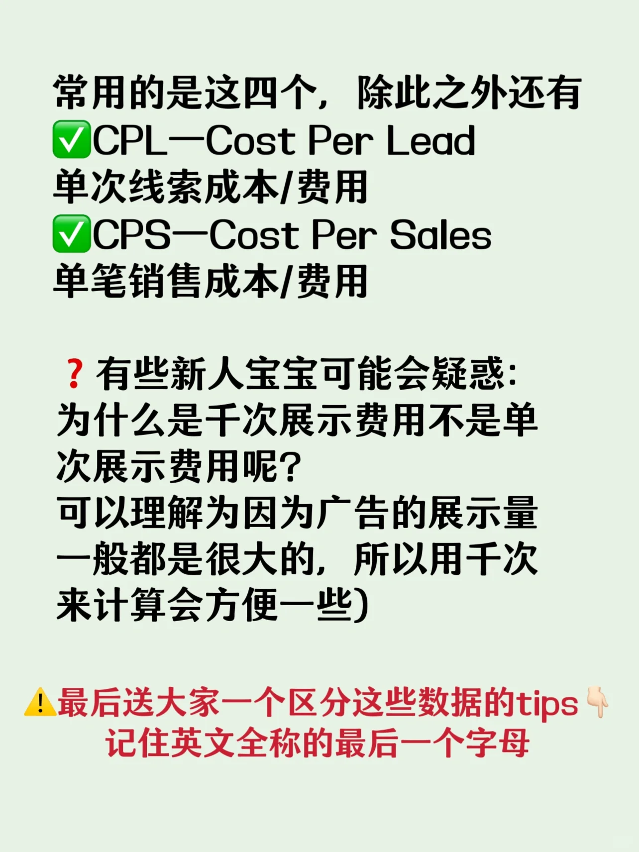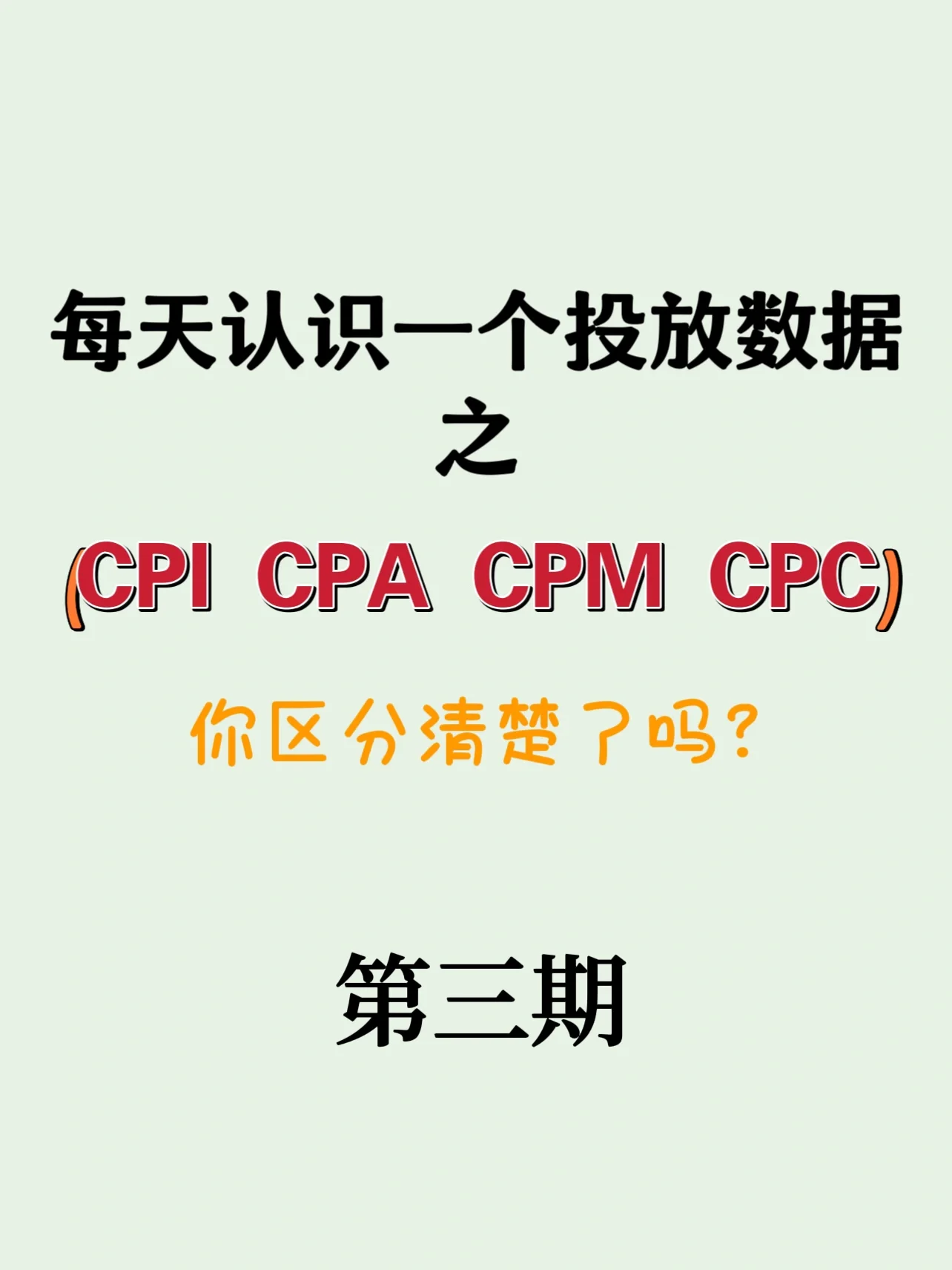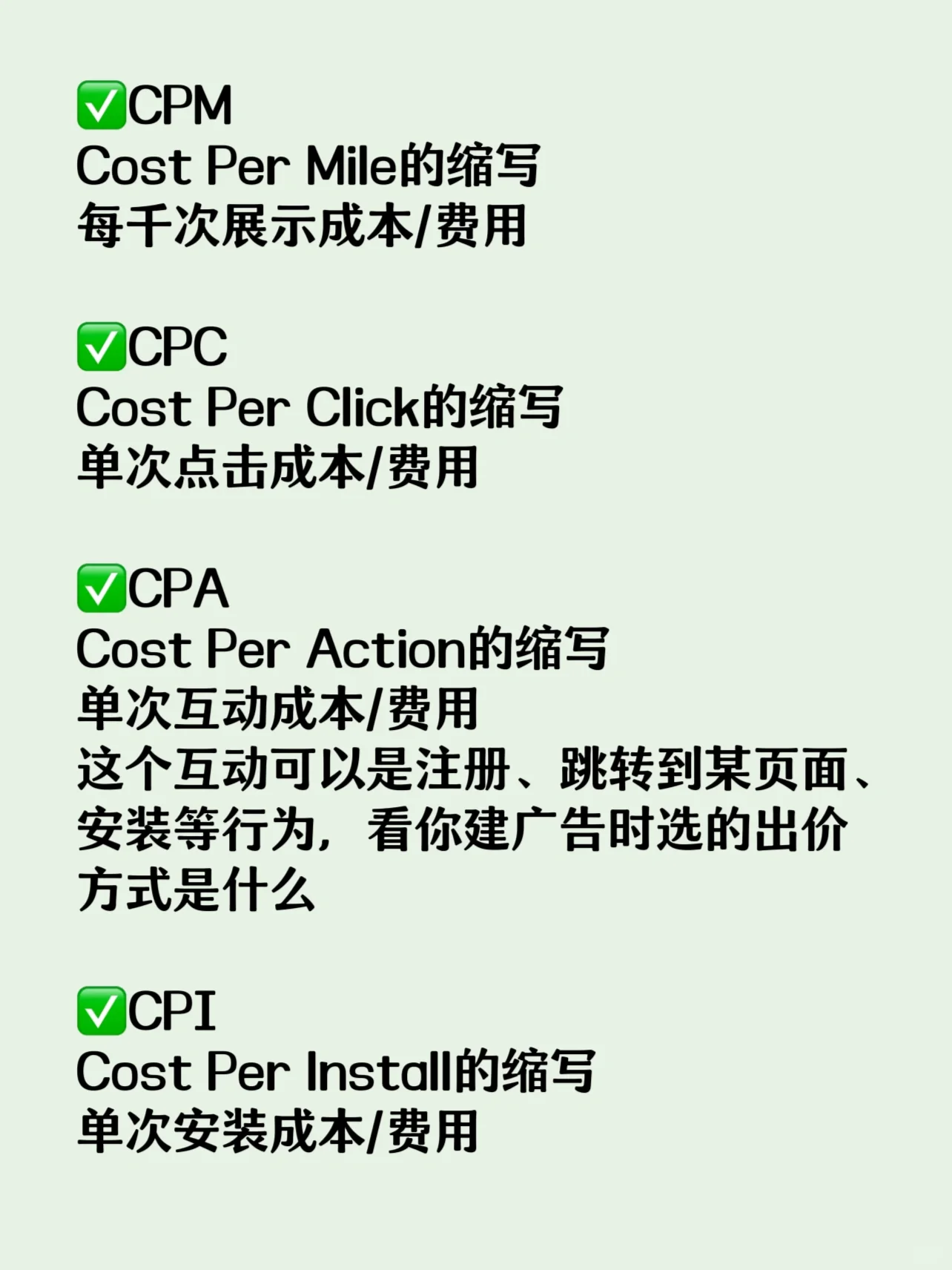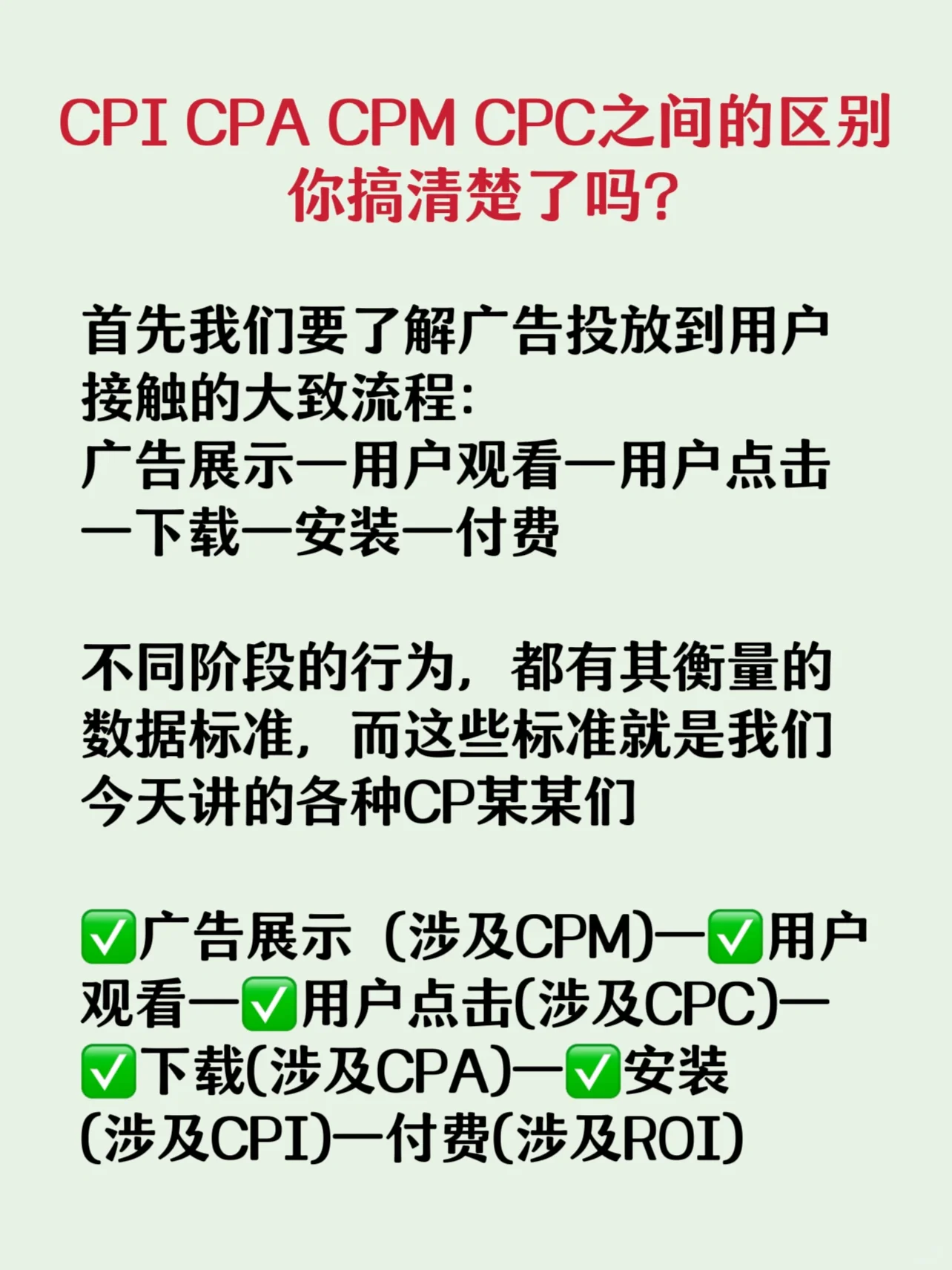 許多新生兒?jiǎn)栁胰绾螀^(qū)分CPI和CPA 首先,我們需要了解從廣告投放到用戶聯(lián)系的大致過(guò)程: 廣告展示-用戶觀看-用戶點(diǎn)擊-下載-安裝-支付 行為的不同階段都有自己的數(shù)據(jù)測(cè)量標(biāo)準(zhǔn),這些標(biāo)準(zhǔn)就是我們今天討論的各種CP 廣告展示(涉及CPM)-用戶觀看-用戶點(diǎn)擊(涉及CPC)-下載(涉及CPA)-安裝(涉及CPI)-支付(涉及ROI) CPM 每英里成本的縮寫(xiě),每千次印象的成本/費(fèi)用 (有些新寶寶可能會(huì)想:為什么不是一筆展示費(fèi)呢可以理解為,由于廣告的展示量一般都比較大,所以用千次印象來(lái)計(jì)算更方便。) CPC 每次點(diǎn)擊成本的縮寫(xiě) 注冊(cè)會(huì)計(jì)師 “每次操作成本”的縮寫(xiě),即單個(gè)交互的成本/支出 這種互動(dòng)可以包括注冊(cè)、重定向到某個(gè)頁(yè)面、安裝等,具體取決于您在創(chuàng)建廣告時(shí)選擇的出價(jià)方法 居民消費(fèi)價(jià)格指數(shù) 單次安裝成本的縮寫(xiě) 除了CPL(每個(gè)潛在客戶的成本單個(gè)潛在客戶成本;每個(gè)銷(xiāo)售的CPS成本單個(gè)銷(xiāo)售成本)之外,這四種方法也很常用 記住這些數(shù)據(jù)的關(guān)鍵實(shí)際上是記住英文全名的最后一個(gè)單詞! 你今天學(xué)習(xí)完這組數(shù)據(jù)了嗎