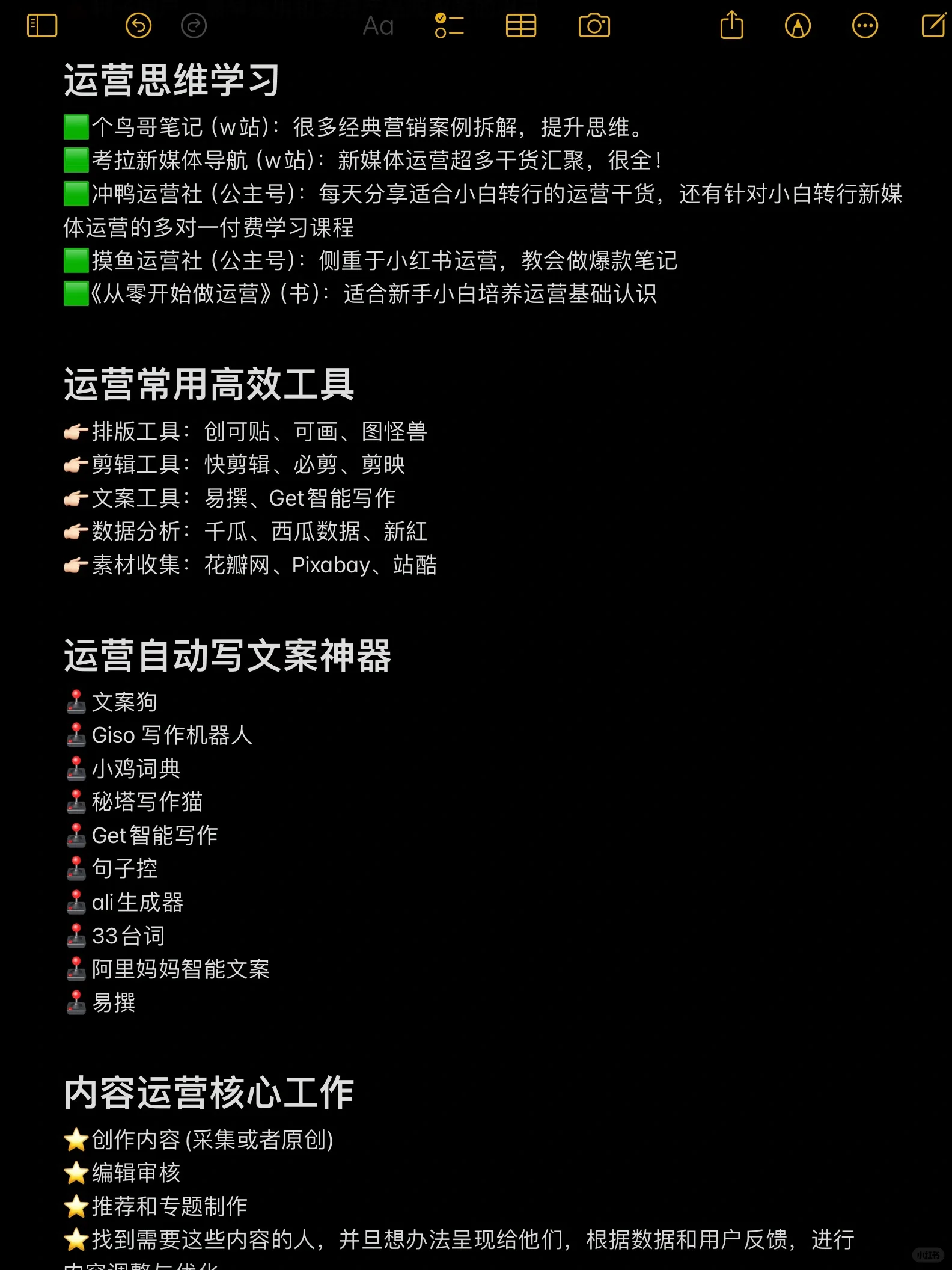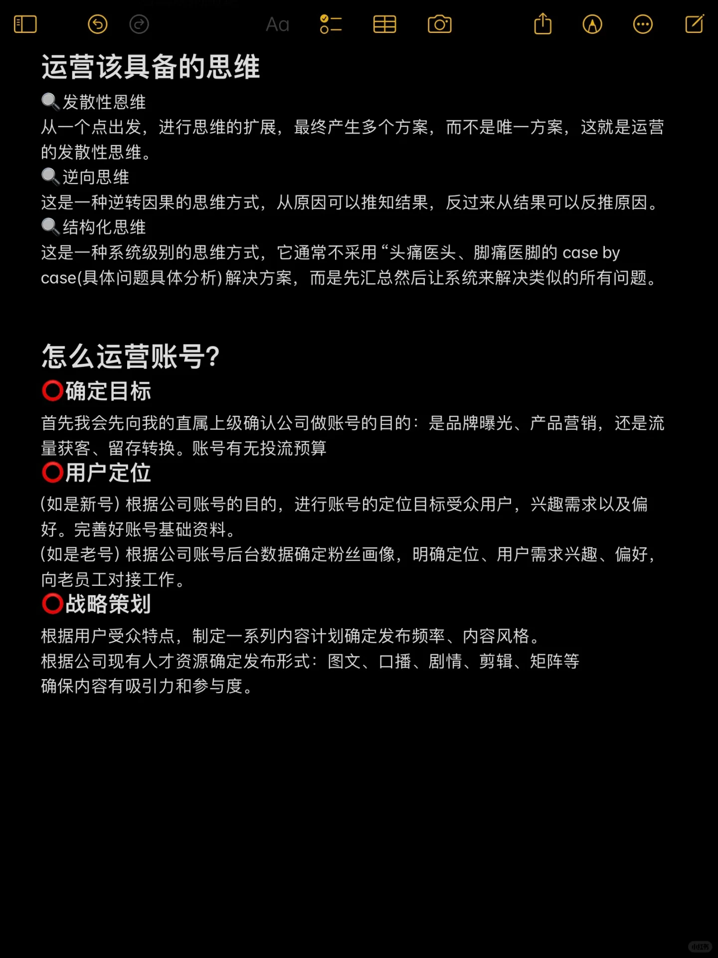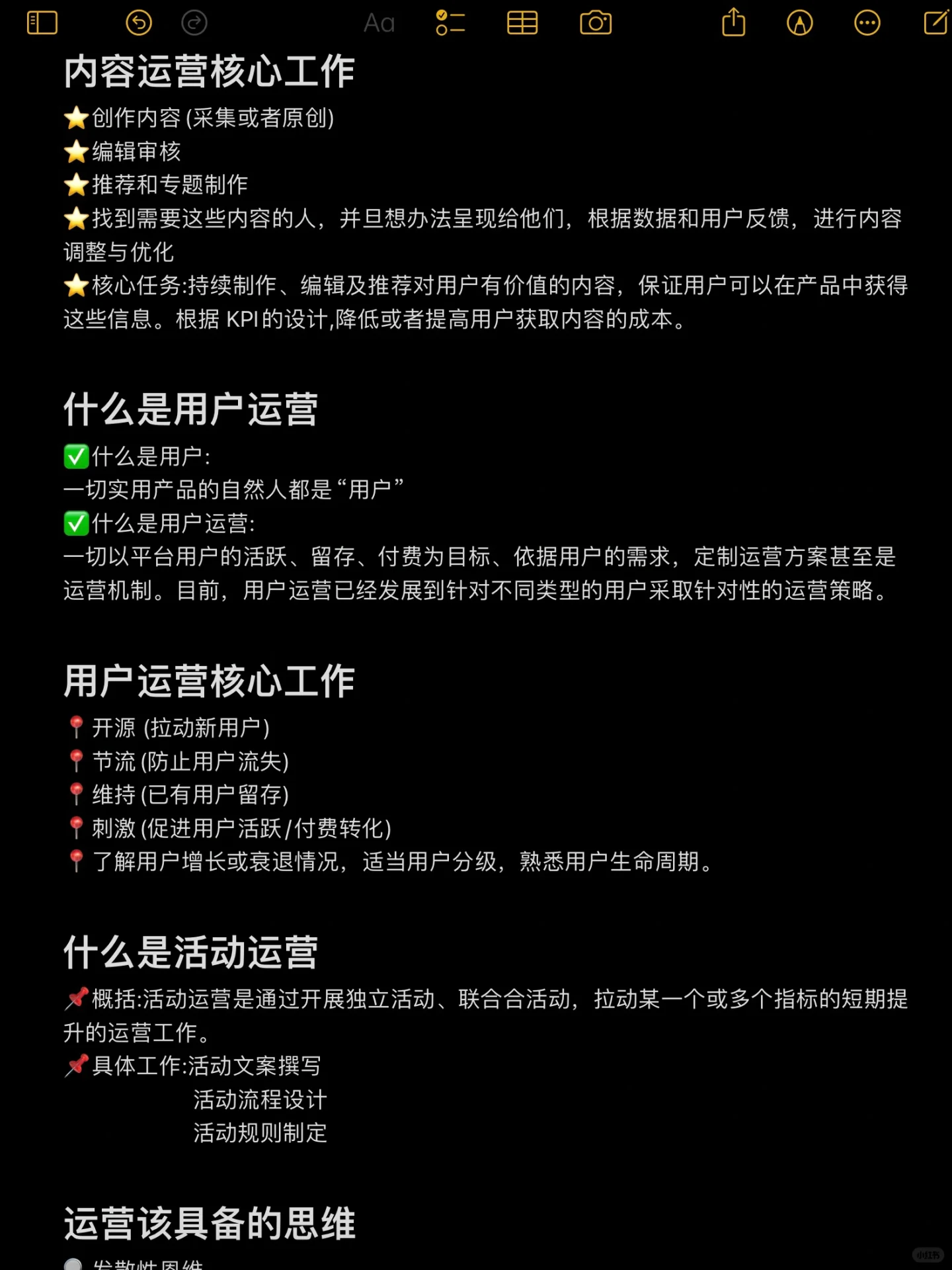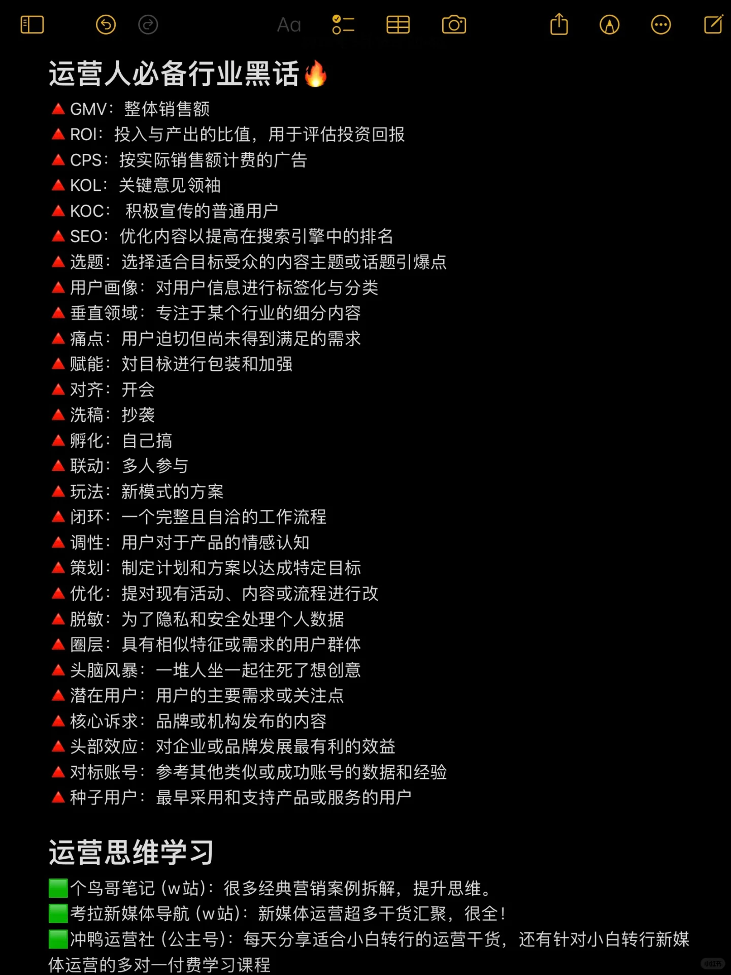 ? GMV:總銷售收入 ? ROl:投入與產(chǎn)出的比率,用于評估投資回報 ? CPS:根據(jù)實際銷售收入計費的廣告 ? KOL:主要意見領(lǐng)袖 ? KOC:積極宣傳自己的老用戶 ? SEO:優(yōu)化內(nèi)容以提高搜索引擎的排名 ? 選題:為目標(biāo)受眾選擇合適的內(nèi)容主題或話題觸發(fā)點 ? 用戶配置文件:標(biāo)記和分類用戶信息 ? 垂直領(lǐng)域:專注于某個行業(yè)的細(xì)分內(nèi)容 ? 痛點:用戶需求迫切但未得到滿足 ? 授權(quán):針對性-包裝和強化 ? 協(xié)調(diào):會議 ? 滾動:剽竊 ? 孵化:自營 ? 聯(lián)動:多人參與 ? Gameplay:新模式解決方案 ? 閉環(huán):一個完整且自洽的工作流程 ? 語氣:用戶對產(chǎn)品的情感感知 ? 規(guī)劃:制定計劃和計劃以實現(xiàn)特定目標(biāo) ? 優(yōu)化:改進現(xiàn)有的活動、內(nèi)容或流程 ? 去敏感化:為了隱私和安全處理個人數(shù)據(jù) ? 圈子:具有相似特征或需求的用戶群體 ? 腦力激蕩:一群人坐在一起創(chuàng)造性地思考到死亡 ? 潛在用戶:他們的主要需求或關(guān)注點 ? 核心訴求:品牌或機構(gòu)發(fā)布的內(nèi)容 ? 頭部效應(yīng):對公司或品牌發(fā)展最有利的利益 ? 基準(zhǔn)賬戶:參考其他類似或成功賬戶的數(shù)據(jù)和經(jīng)驗 ? 種子用戶:最早采用和支持產(chǎn)品或服務(wù)的用戶