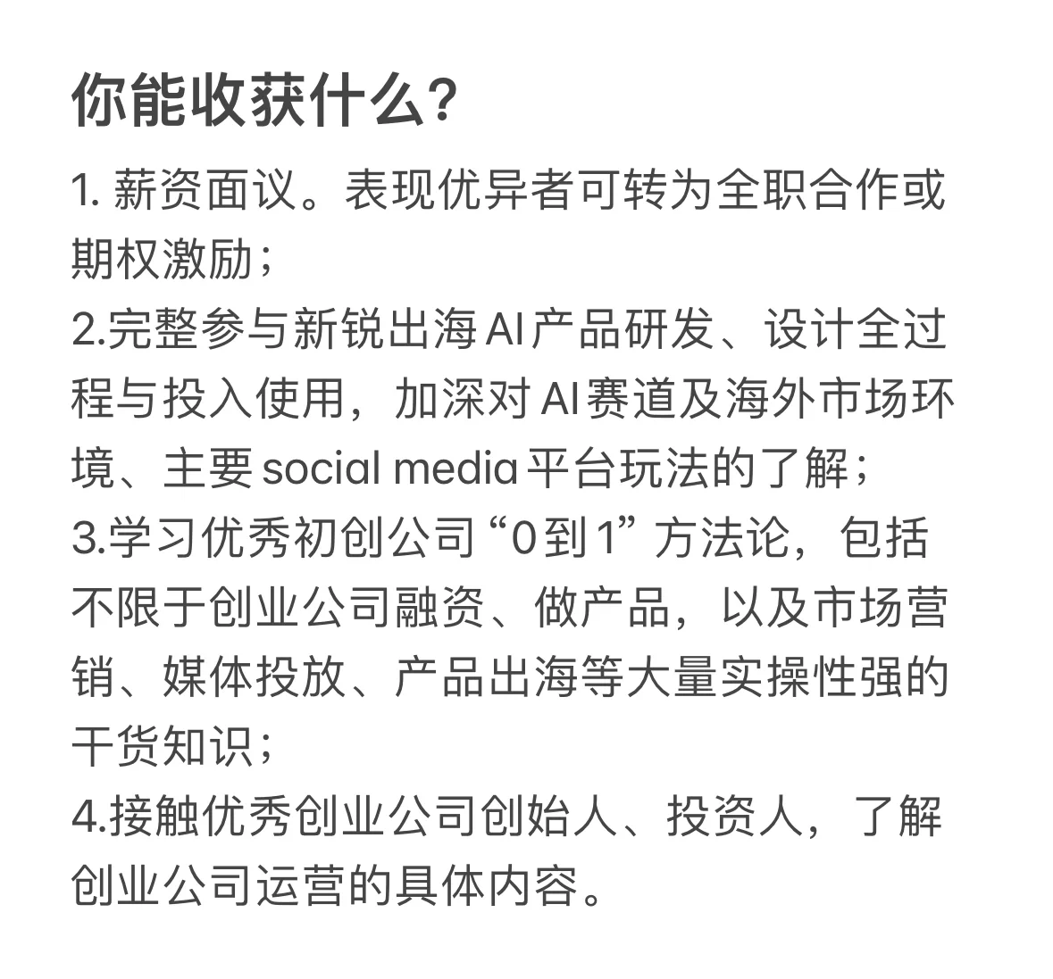 我們是 一款面向海外中小企業(yè)的人工智能增長代理產(chǎn)品,旨在通過Salesforce服務于新一代公司的營銷需求。成立三個月來,我們的客戶涵蓋了多家海外和海外名人創(chuàng)業(yè)公司。目前,我們的月收入達到數(shù)十萬,使我們成為一家快速發(fā)展的初創(chuàng)公司。 創(chuàng)始團隊 所有90年代出生的員工都來自國內(nèi)外頂尖大學,有名人AI產(chǎn)品增長領導者和研發(fā)巨頭的背景。他們帶領產(chǎn)品在三個月內(nèi)實現(xiàn)了0-50萬元的增長。以北京為基地,短期內(nèi)也可以考慮遠程[舌頭卡住H] 關于產(chǎn)品經(jīng)理 需要具備在商業(yè)上精益求精的能力和敢想敢做的創(chuàng)業(yè)精神(重要?。O胍殑?chuàng)業(yè)的優(yōu)秀產(chǎn)品人員將被提供[Kiss R] 團隊氛圍非常好,我可以學到很多東西。我參與了人工智能產(chǎn)品走向世界的整個過程,并與研發(fā)、營銷和設計團隊進行溝通。短期內(nèi),我將成為一名全能的六邊形戰(zhàn)士[可愛的R]
