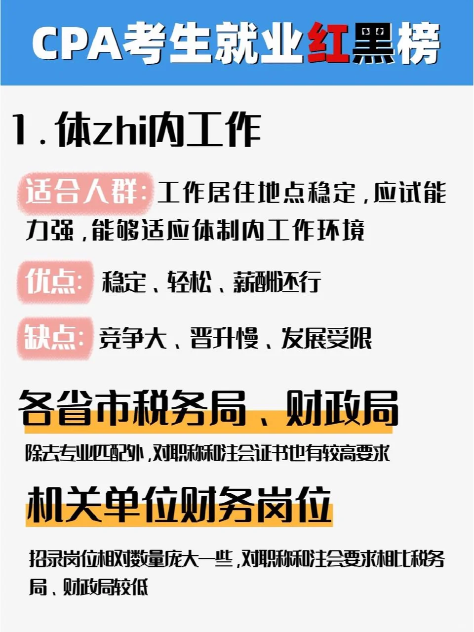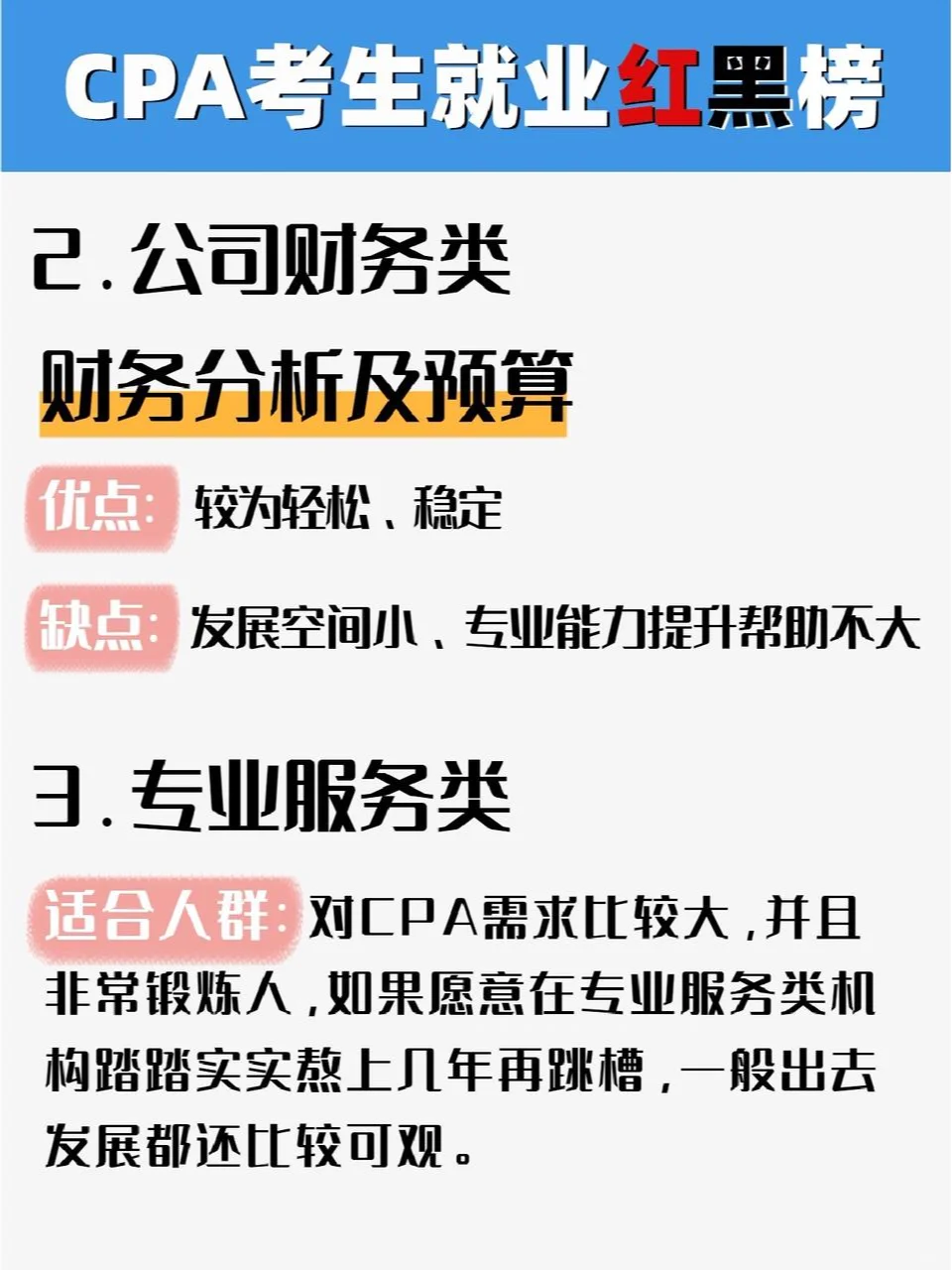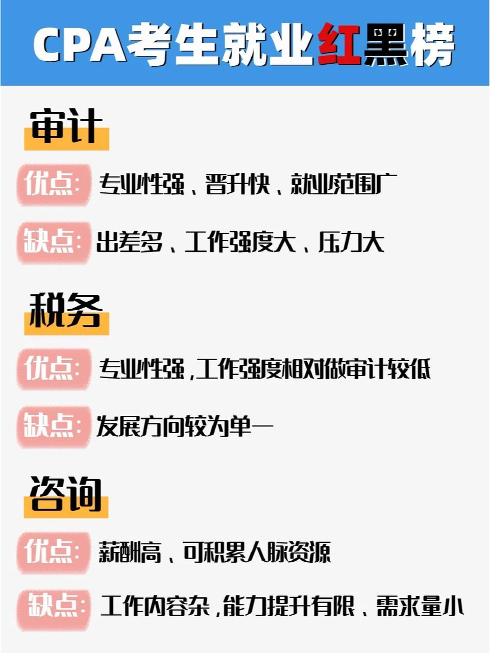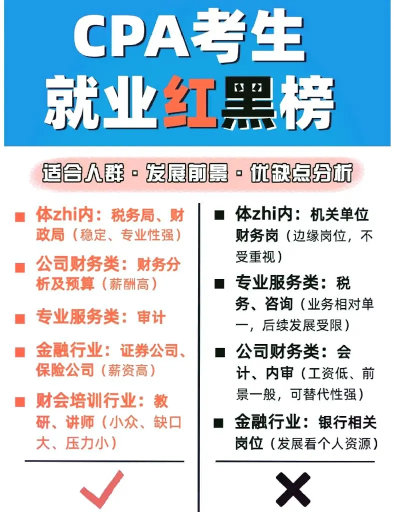 你參加注冊會計師考試了嗎你周圍有人參加注冊會計師考試嗎你知道嗎,即使參加了注冊會計師考試,仍然可以找到年薪100萬元的工作 ?? CPA不能造神,但它可以為你提供更多的工作機會。今天,我就和大家聊一聊注冊會計師的考生在拿到證書或完成一門科目后,離拿到百萬元工資還有多遠 ?? 建議那些正在準備24年注冊會計師考試的人去公共場所,默默地寫一本書,郵政保險在家里,學習1小時等于4小時,我能為你提供一些實用的純干材料嗎子寮,我已經(jīng)介紹了12種治療強迫癥的策略,我認為這些策略質(zhì)量最好 ? CPA600 Motif ? CPA三色筆記 ? 注冊會計師往期考試集錦 ? 注冊會計師學習計劃 ? 注冊會計師會計分錄完整收集 ? 注冊會計師理財200+公式大全 ? 注冊會計師六科考試的前幾頁 …直接在公眾面前,嗖嗖? 帶注釋的備考書? 認領(lǐng)它! ?? 我將根據(jù)注冊會計師候選人的優(yōu)勢和劣勢、發(fā)展前景、工資和加班強度,為他們創(chuàng)建一份紅色和黑色的工作機會清單。歡迎討論: 什么 紅色名單 1.公司財務(wù):財務(wù)分析與預(yù)算(相對來說,工資相對較高,但需要去大公司做實際工作) 2.專業(yè)服務(wù)類別:審計(隨著時間的推移積累,但培訓人員,接觸更多的業(yè)務(wù),以后跳槽的機會更多) 3、系統(tǒng)內(nèi):稅務(wù)局、財政局相關(guān)崗位(輕松穩(wěn)定,專業(yè)性較強,可進入) 4.金融業(yè):與證券和保險公司相關(guān)的職位(只要能考就有高薪和擔保?。?5、財務(wù)會計培訓市場:教研、教學師資(高薪、挑戰(zhàn)!絕笑等你!) 什么 黑名單 1.公司財務(wù):會計、內(nèi)部審計(工資低,發(fā)展前景有限,可替代性強) 2.專業(yè)服務(wù):稅務(wù)和咨詢(業(yè)務(wù)敞口相對有限,未來發(fā)展有限) 3.系統(tǒng)內(nèi):政府機構(gòu)的財務(wù)職位(外圍職位,無價值) 4.金融業(yè):銀行相關(guān)職位(基于個人資源的發(fā)展) - 當然,在任何職位上都有發(fā)展良好和發(fā)展不良的人 因此,重要的是要考慮你是否適合這個職位,你是否具備與這個職位相匹配的能力,以及你的價值觀和公司文化是否一致。只有考慮到這些因素,你才能快速發(fā)展。 每個人也可以自由表達自己的意見,并提供他們對注冊會計師紅名單和黑名單的看法 #注冊會計師#批注準備#小白考批注#批注#注冊會計師 評論:發(fā)現(xiàn)了一個秘密基地,里面有大量的電子種子、筆記、工具和CPA66,可以默默地把這個芽油寫給,在公共領(lǐng)域,請參閱“帶注釋的考試準備書”