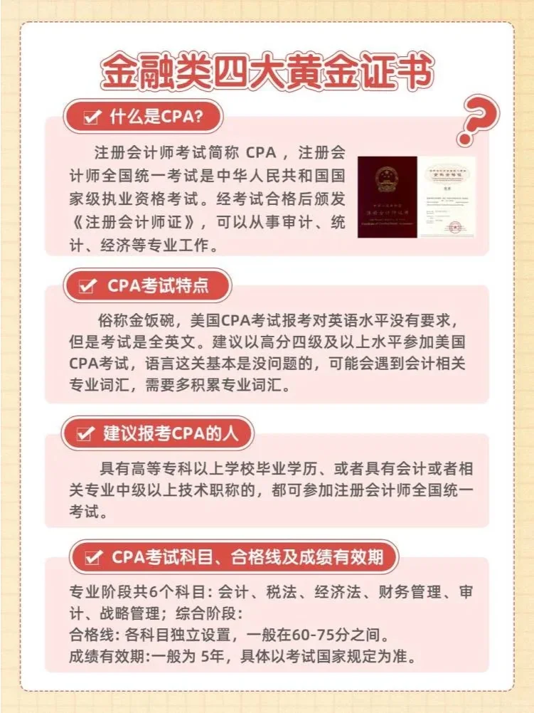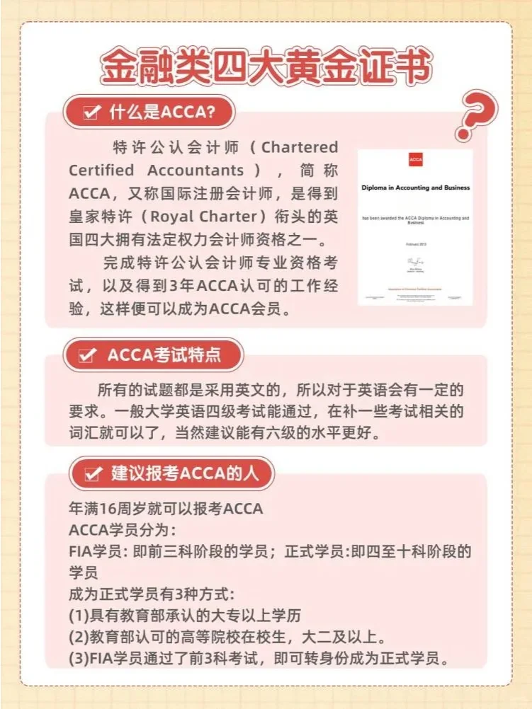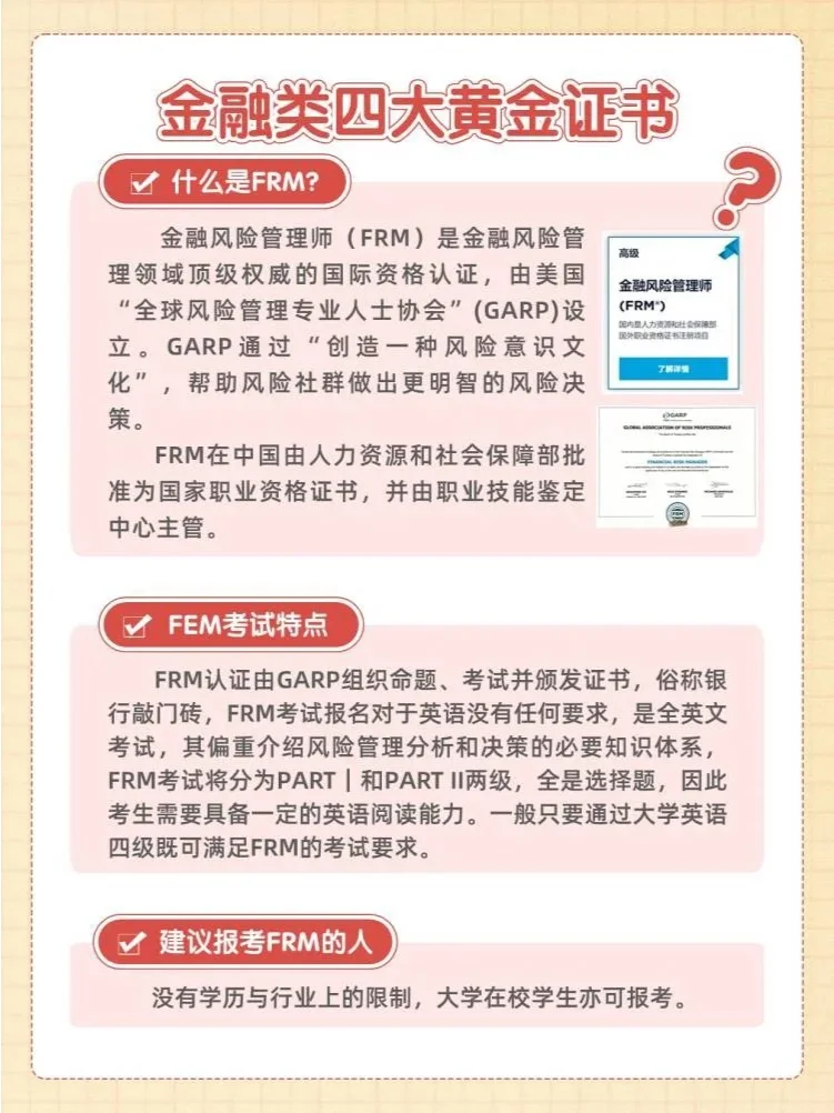 一?? 注冊會計(jì)師 高價(jià)值和認(rèn)可度,本科應(yīng)屆畢業(yè)生可以申請。由于考試大綱每年都在變化,因此不建議過早準(zhǔn)備;此外,注冊會計(jì)師的知識點(diǎn)很多,漫長的準(zhǔn)備線在后期可能會非常痛苦。建議在大學(xué)四年級申請注冊會計(jì)師會計(jì)或?qū)徲?jì)科目以及一門容易通過的科目。 二?? CFA(特許金融分析師) 業(yè)內(nèi)公認(rèn)的金融證書被稱為“華爾街入場券”。在大四時(shí),可以申請CFA一級考試,畢業(yè)后繼續(xù)參加考試。第1級不是很難,知識點(diǎn)很廣,其中第3級最具挑戰(zhàn)性。 三?? 特許注冊會計(jì)師協(xié)會 這可能是你在本科學(xué)習(xí)期間可以完成的為數(shù)不多的具有高價(jià)值的財(cái)務(wù)證書之一。內(nèi)容涉及面廣,共有13門考試科目,每年只能考8門,至少需要一年半的時(shí)間才能完成。你可以在大二和大三完成ACCA考試,這可以被視為你未來學(xué)習(xí)CPA和CFA的過渡。 四?? 財(cái)務(wù)風(fēng)險(xiǎn)經(jīng)理 適合擔(dān)任風(fēng)險(xiǎn)控制職位,能夠擔(dān)任風(fēng)險(xiǎn)控制人員、財(cái)務(wù)單位審計(jì)師、資產(chǎn)管理人等。大多數(shù)FRM持有人為大型企業(yè)和金融機(jī)構(gòu)服務(wù)。沒有教育或行業(yè)限制,大學(xué)生也可以申請。