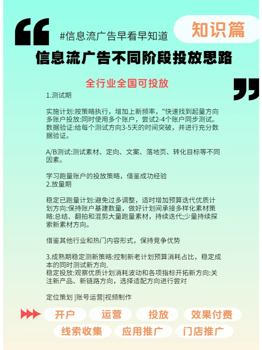 測試周期 實施計劃:按照戰(zhàn)略實施,增加新增頻率,快速找到數(shù)量方向。多帳戶部署:同時使用多個帳戶,嘗試同步2-4個帳戶進行測試。數(shù)據(jù)驗證:給每個測試方向3-5天的時間進行突破和充分的數(shù)據(jù)驗證。 A/B測試:測試不同的因素,如材料、方向、文案、登錄頁、轉(zhuǎn)換目標等。 學(xué)習(xí)運營批量賬戶的廣告策略,并借鑒成功經(jīng)驗。 成交量增加期 穩(wěn)定的運行量計劃:避免過度調(diào)整,及時增加預(yù)算。 迭代式高質(zhì)量計劃方向:保持賬戶基礎(chǔ)設(shè)施的數(shù)量,確保計劃和協(xié)調(diào)的順利進行。 多元化物料策略:對大量跑量物料進行匯總、重制、混合,不斷迭代;不斷探索小批量的新材料方向。 借鑒其他行業(yè)和流行的內(nèi)容形式,保持競爭優(yōu)勢。 成熟期 穩(wěn)定測試策略:控制新舊計劃的預(yù)算消耗比例,在測試新方向的同時穩(wěn)定成本。 穩(wěn)定部署:觀察高質(zhì)量計劃消耗和各項指標的波動。 探索新方向:關(guān)注新產(chǎn)品和新鏈接方向,選擇適應(yīng)方向進行實驗。 #梅林廣告