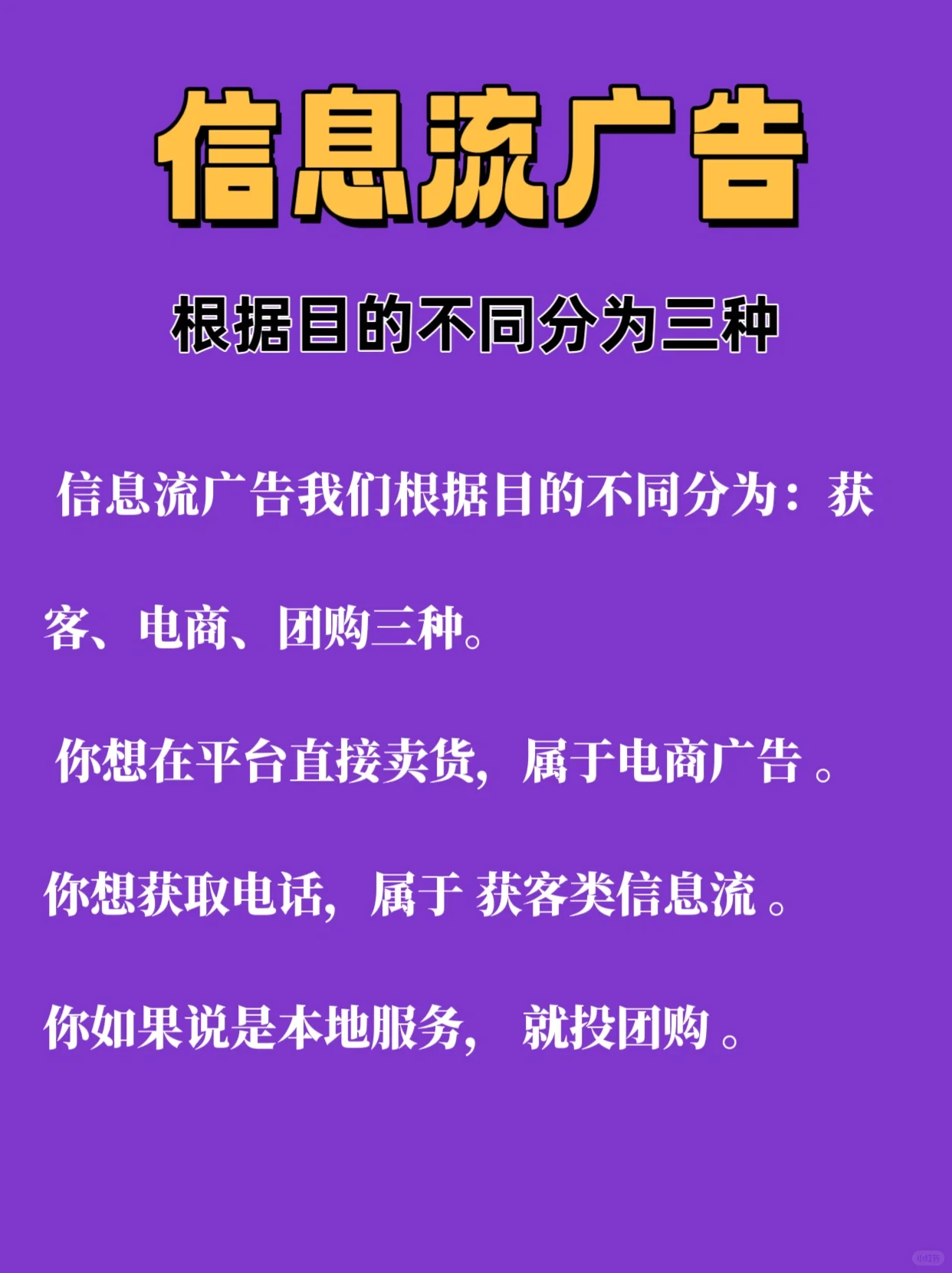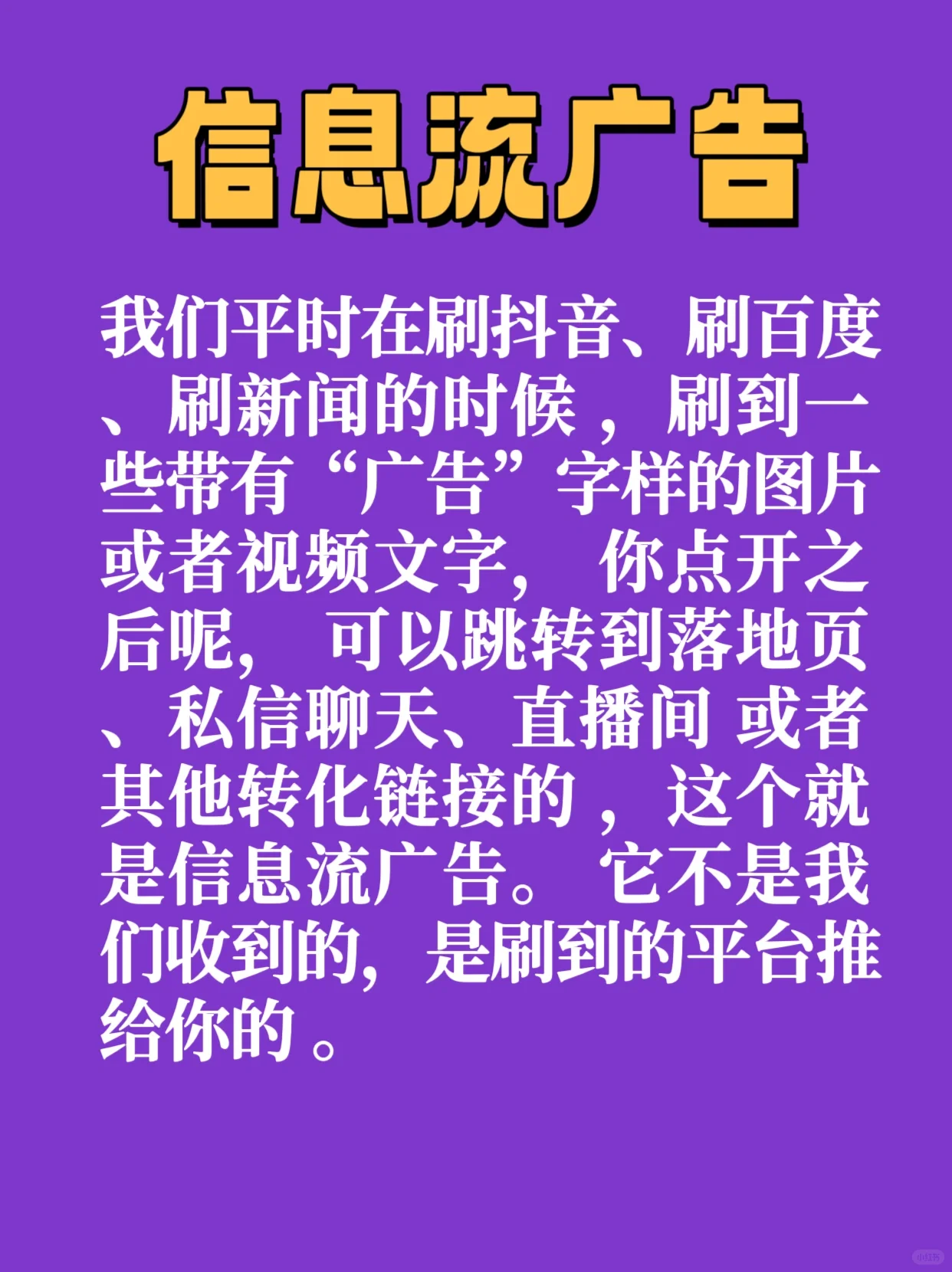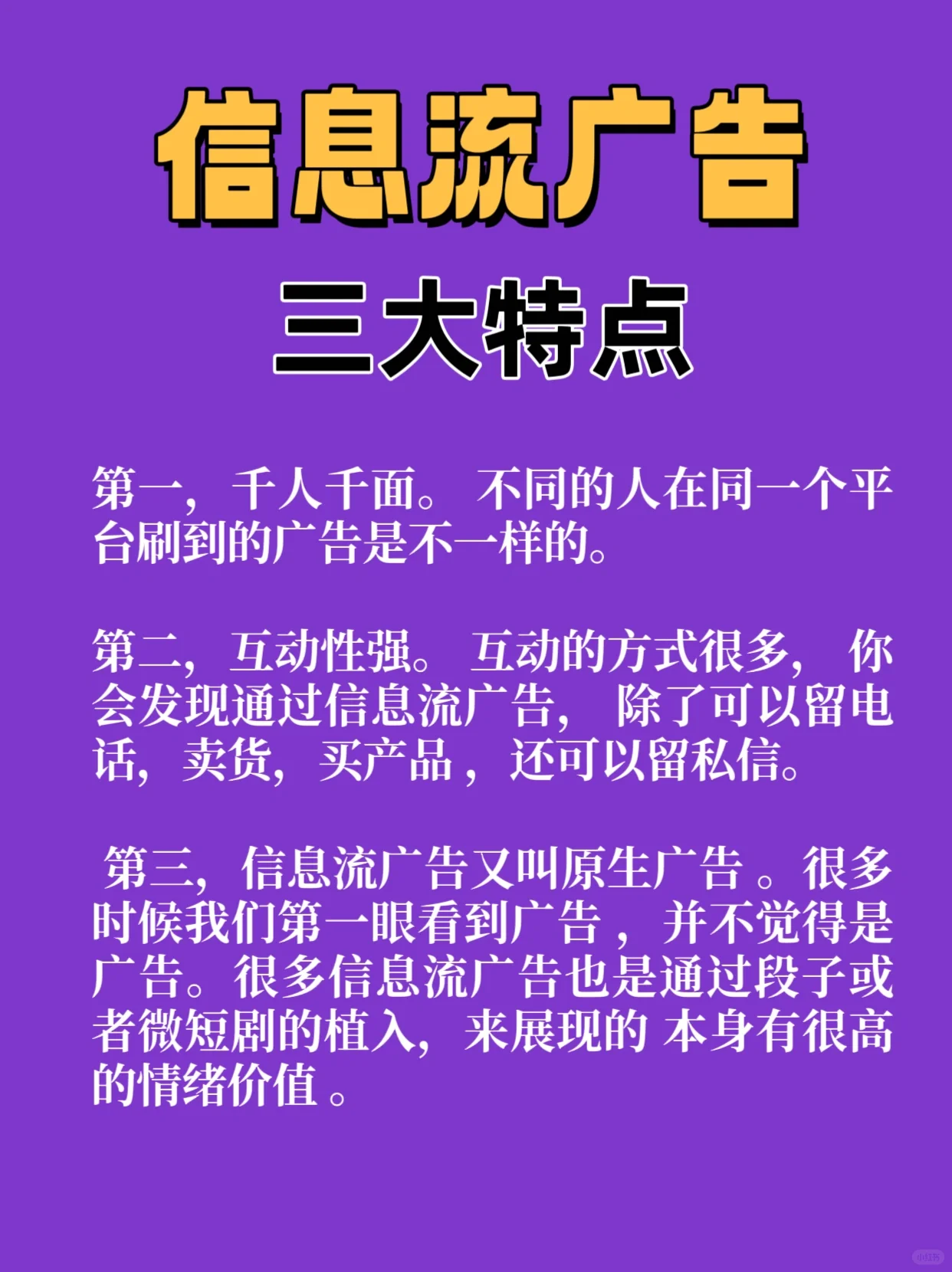 什么是信息流廣告 【斜視R】我們什么時候用抖音、百度、新聞當你看到一些帶有廣告詞的圖片或視頻文本時,你可以點擊它并跳轉(zhuǎn)到登陸頁、私信聊天、直播間或其他轉(zhuǎn)換鏈接。這就是所謂的信息流廣告。它沒有被我們收到,而是被平臺刷到并推送給您。 [斜視R]信息流廣告[有R]三大特點[像R] 【種草R】一是千人千面。 不同的人在同一個平臺上可能會遇到不同的廣告。 【種草R】二是互動性強。 互動的方式有很多,你會發(fā)現(xiàn)通過信息流廣告,除了留電話、賣商品、買產(chǎn)品,你還可以私信。 【種草R】第三信息流廣告,又稱原生廣告。 很多時候,當我們第一次看到廣告時,我們并不認為這是一個廣告。許多信息流廣告也是通過段子或短劇的植入來呈現(xiàn)的,它們本身就具有很高的情感價值。[偷窺R][自拍R] 【舉手R】信息流廣告根據(jù)不同的目的分為三類:獲客、電商和團購。 [右R]如果你想直接在平臺上銷售,那就屬于電子商務廣告。 [右R]如果你想獲得一個電話號碼,它屬于客戶獲取信息流。 如果你說這是一項本地服務,那就投資團購吧。