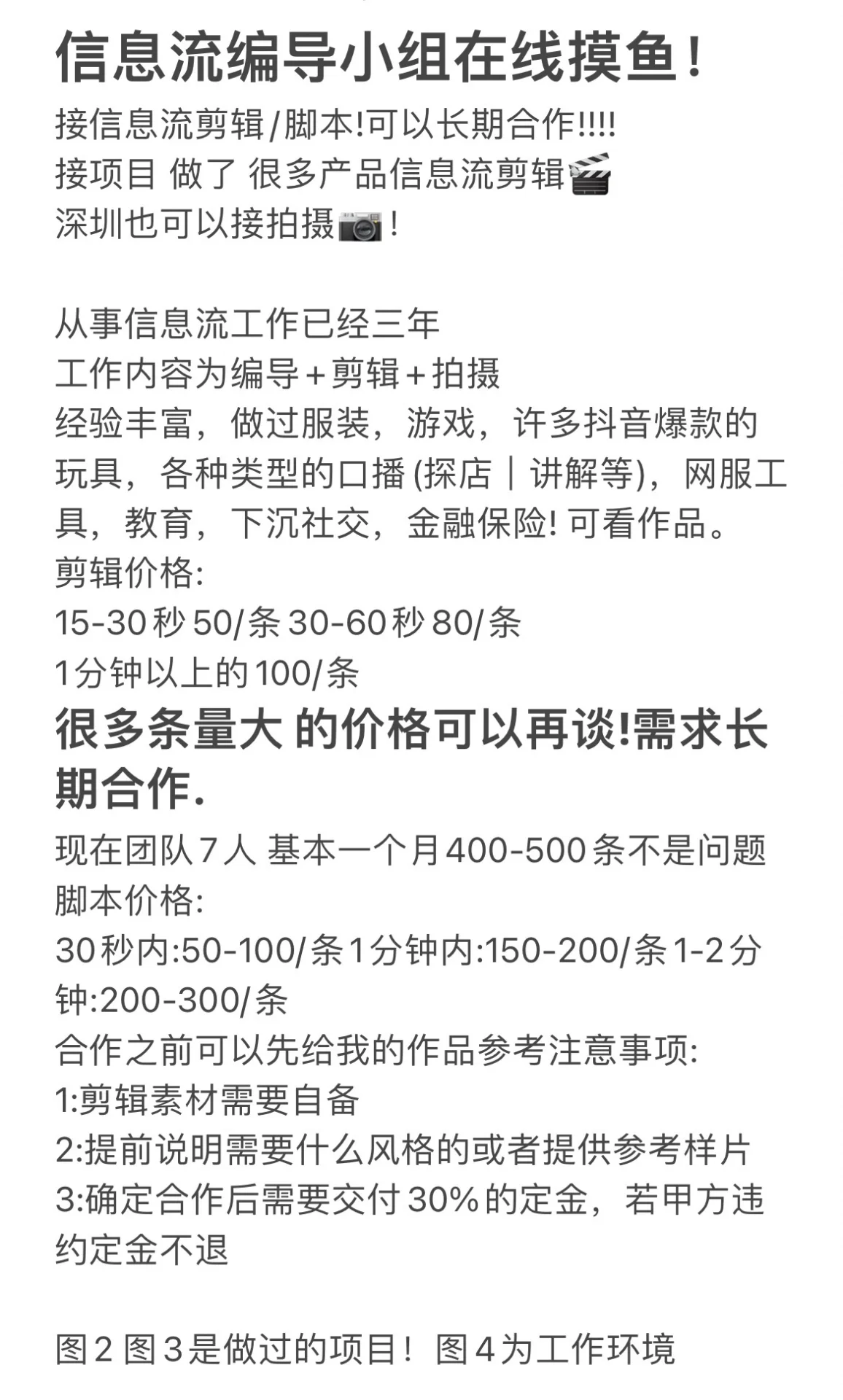 接收信息流編輯/腳本!長期合作是可能的!?。?! 你為這個項目做了很多產(chǎn)品信息流編輯嗎 深圳也可以接受拍攝嗎! 我從事信息流工作已經(jīng)三年了 工作職責包括導演、剪輯和拍攝 經(jīng)驗豐富的他做過衣服、游戲、很多有聲爆模型的玩具、各種類型的口播(探店|解說等)、網(wǎng)絡服務工具、教育、社交下沉、金融保險!作品可供查看。 編輯價格: 15-30秒50/件30-60秒80/件 100/件,持續(xù)1分鐘以上 許多高批量的價格可以再次協(xié)商!需要長期合作 現(xiàn)在7個人的團隊基本上每月有400-500件物品,這不是問題 腳本價格: 30秒內(nèi):50-100/片1分鐘內(nèi):150-200/片1-2分鐘:200-300/片 在合作之前,請為我的工作提供參考和注意事項: 1:編輯材料需要自己準備 2:提供所需款式或參考樣品的預先說明3:確認合作后,需要30%的定金。如果甲方違約,保證金將不予退還 圖2和圖3是已經(jīng)完成的項目!圖4顯示了工作環(huán)境
