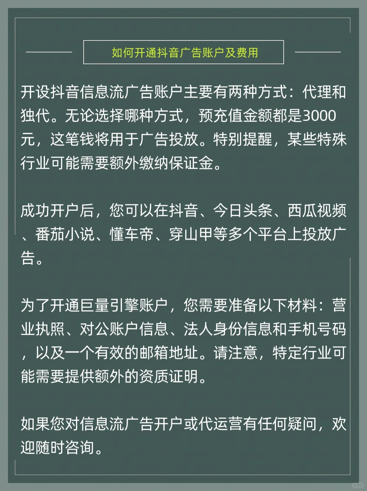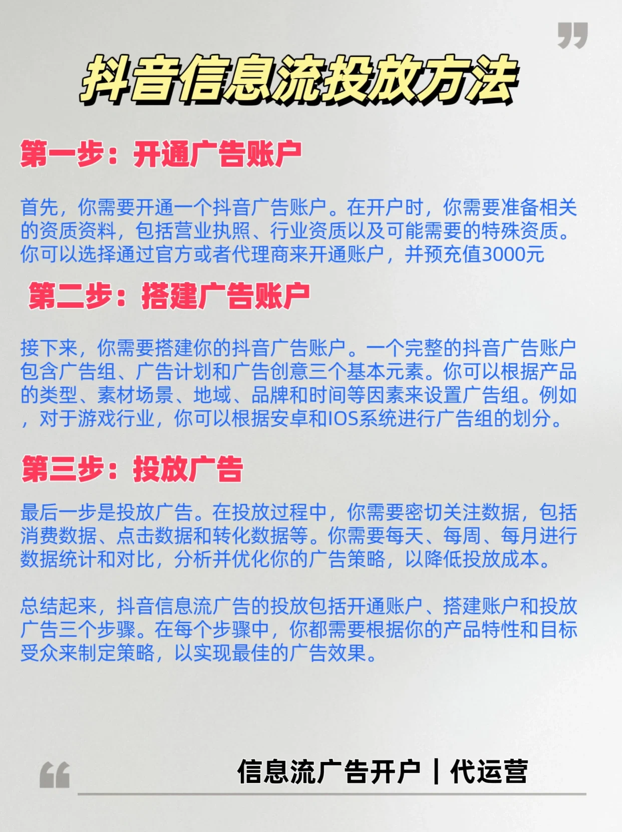 抖音信息流廣告 首先,你需要開通一個抖音廣告賬戶。開戶時,您需要準備相關的資格文件,包括營業(yè)執(zhí)照、行業(yè)資質以及可能需要的任何特殊資質。您可以選擇通過官方或代理渠道開立賬戶,預收費3000元。 接下來,你需要建立你的抖音廣告賬戶。一個完整的抖音廣告賬號包括三個基本要素:廣告群、廣告策劃和廣告創(chuàng)意。您可以根據(jù)產品類型、材料場景、地區(qū)、品牌和時間等因素設置廣告組。例如,在游戲行業(yè),你可以根據(jù)Android和IOS系統(tǒng)劃分廣告組。 最后一步是做廣告。在廣告投放過程中,您需要密切監(jiān)控數(shù)據(jù),包括消費數(shù)據(jù)、點擊數(shù)據(jù)和轉化數(shù)據(jù)。您需要進行每日、每周和每月的數(shù)據(jù)統(tǒng)計和比較,分析和優(yōu)化您的廣告策略,以降低廣告成本。 綜上所述,抖音信息流廣告的投放包括三個步驟:開通賬號、設立賬號和投放廣告。在每一步中,你都需要根據(jù)你的產品特征和目標受眾制定策略,以獲得最佳的廣告效果。 如何開設抖音信息流廣告賬戶及其費用 抖音信息流廣告賬號的開通方式主要有兩種:代理和獨家代理。無論選擇何種方式,預充值金額為3000元,將用于廣告植入。特別提醒,某些特殊行業(yè)可能需要額外支付押金。 賬號開通成功后,可以在抖音、今日頭條、西瓜視頻、番茄小說、知車、穿山甲等多個平臺投放廣告。 為了開立一個龐大的引擎賬戶,您需要準備以下材料:營業(yè)執(zhí)照、企業(yè)賬戶信息、企業(yè)身份信息和手機號碼,以及有效的電子郵件地址。請注意,特定行業(yè)可能需要額外的資格證書。 如果您對開戶或處理信息流廣告有任何疑問,請隨時咨詢。