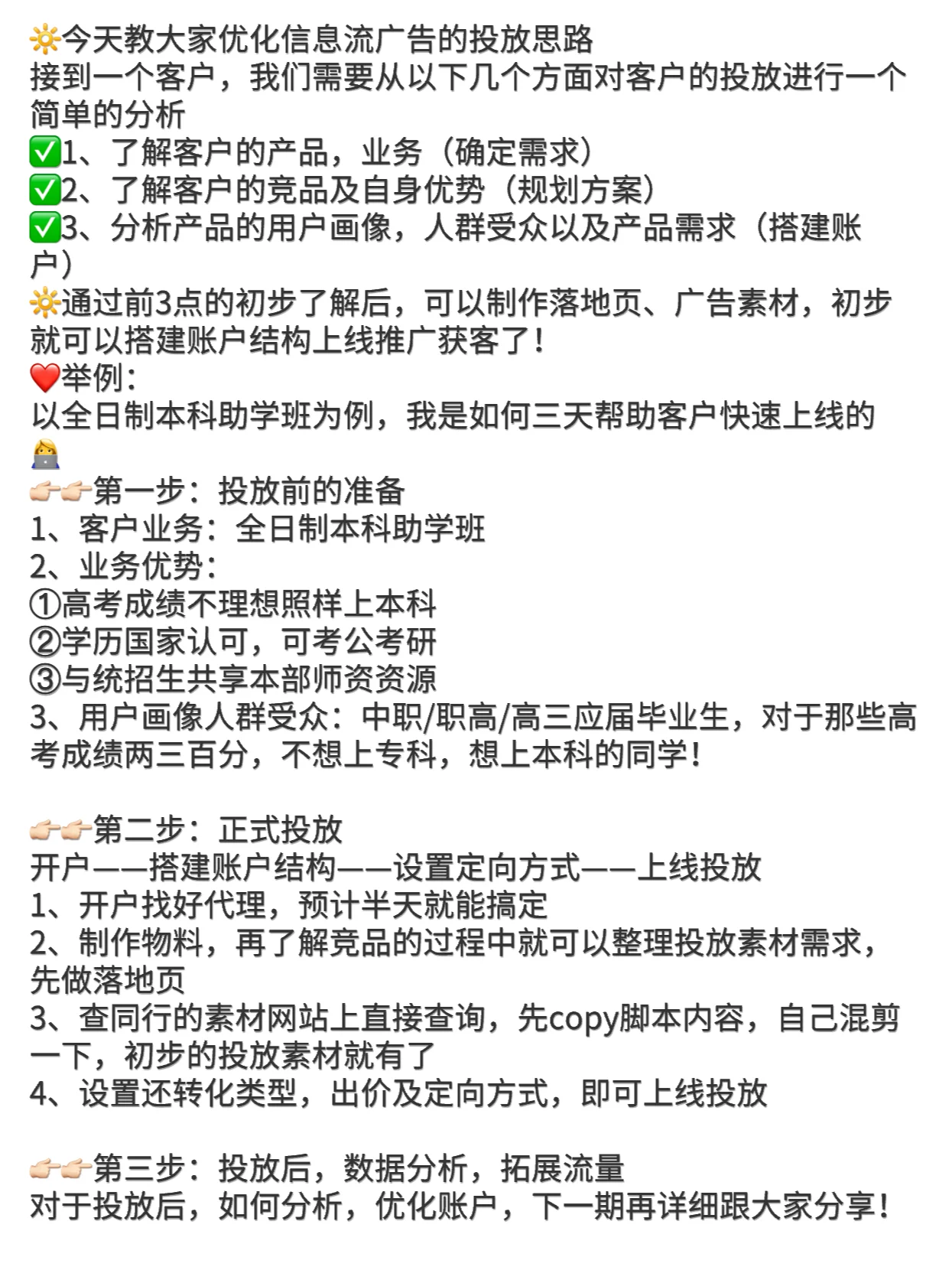 ? 今天,我將教你如何優(yōu)化信息流廣告的投放 我們接待了一位客戶(hù),需要從以下幾個(gè)方面對(duì)他們的投資進(jìn)行簡(jiǎn)單分析 1.了解客戶(hù)的產(chǎn)品和業(yè)務(wù)(確定要求) 2.了解客戶(hù)的競(jìng)爭(zhēng)對(duì)手及其自身優(yōu)勢(shì)(規(guī)劃解決方案) 3.分析產(chǎn)品的用戶(hù)檔案、受眾和產(chǎn)品需求(建立賬戶(hù)) ? 在對(duì)前三點(diǎn)有了初步的了解后,你可以創(chuàng)建登陸頁(yè)和廣告材料,然后建立賬戶(hù)結(jié)構(gòu),在網(wǎng)上推廣和吸引客戶(hù)! ? 實(shí)例 以全日制本科生輔導(dǎo)班為例,我是如何幫助客戶(hù)在三天內(nèi)快速上網(wǎng)的 ? ? 什么第一步:發(fā)射前的準(zhǔn)備工作 1.客戶(hù)業(yè)務(wù):全日制本科生資助項(xiàng)目 2、業(yè)務(wù)優(yōu)勢(shì): ① 高考成績(jī)不理想,仍在攻讀本科 ② 國(guó)家承認(rèn)的教育,有資格參加公開(kāi)考試和研究生入學(xué)考試 ③ 與統(tǒng)一招生系統(tǒng)共享總部教學(xué)資源 3.用戶(hù)簡(jiǎn)介受眾:中等職業(yè)學(xué)校、職業(yè)學(xué)校、高中畢業(yè)生。對(duì)于那些在高考中得了兩三百分而不想上職業(yè)學(xué)院或本科的人! 什么第二步:正式發(fā)布 開(kāi)戶(hù)-建立賬戶(hù)結(jié)構(gòu)-設(shè)置有針對(duì)性的方法-在線廣告 1.開(kāi)戶(hù)并找到一個(gè)好的代理人大約需要半天的時(shí)間 2.在創(chuàng)建素材和了解競(jìng)爭(zhēng)對(duì)手的過(guò)程中,我們可以組織對(duì)廣告素材的要求,并首先創(chuàng)建一個(gè)登陸頁(yè) 3.直接查看同行的素材網(wǎng)站,先復(fù)制劇本內(nèi)容,自己混搭,就有了廣告的前期素材 4.設(shè)置轉(zhuǎn)換類(lèi)型、出價(jià)和定向方法,以便在網(wǎng)上發(fā)布和廣告 什么第三步:廣告投放后,進(jìn)行數(shù)據(jù)分析,擴(kuò)大流量 廣告發(fā)布后如何分析和優(yōu)化賬戶(hù)我將在下一期與大家詳細(xì)分享!