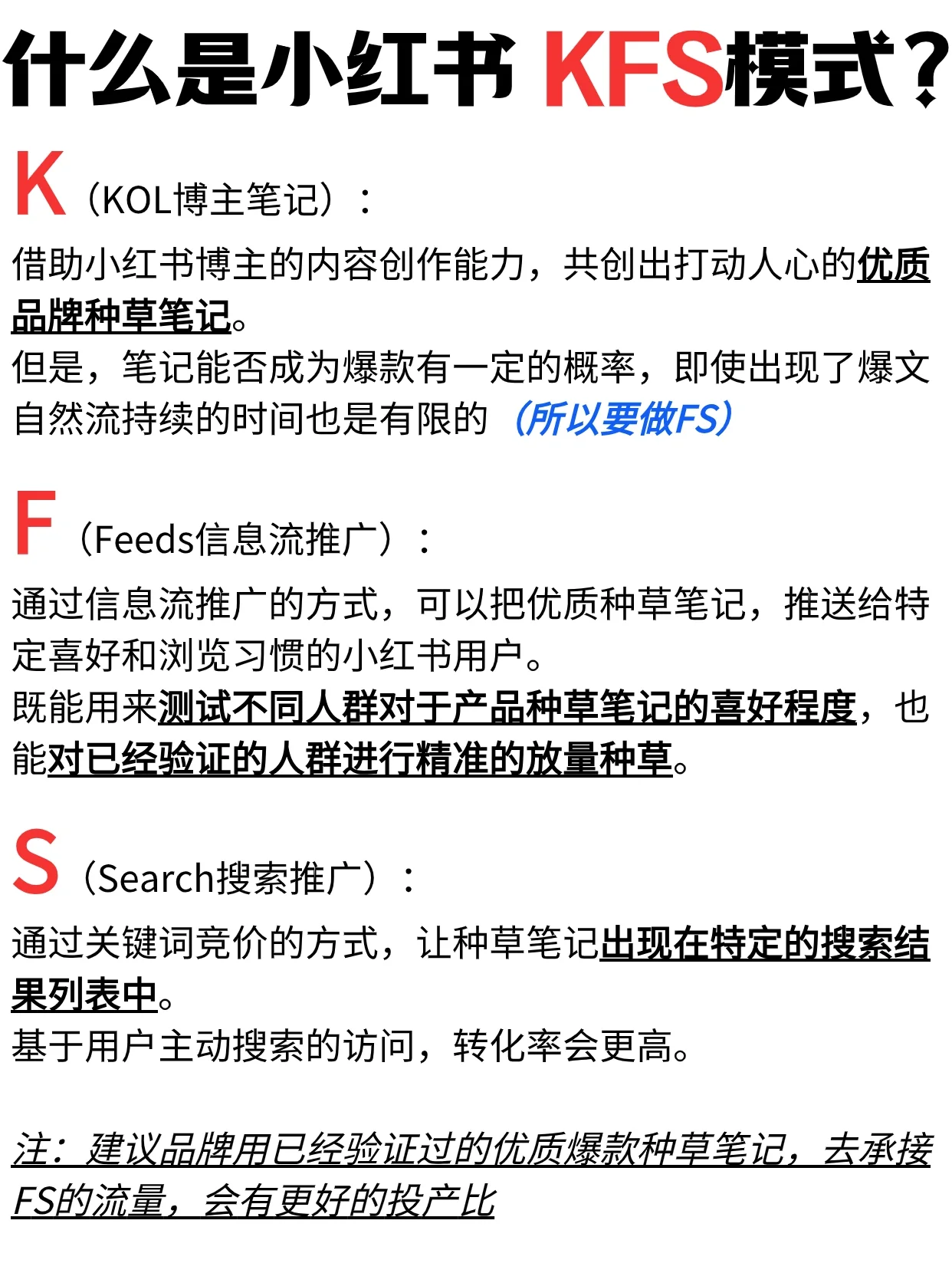 [Star R]K(KOL博客筆記): 借助小紅書博主的內容創(chuàng)作能力,共同打造打動人心的優(yōu)質品牌種子筆記。 然而,筆記有一定的概率會流行起來,即使有流行的文章,自然流的持續(xù)時間也是有限的(所以有必要做FS) [Star R]F(飼料信息流推廣): 通過信息流推廣,將優(yōu)質種草筆記推送給有特定喜好和瀏覽習慣的小紅書用戶。 它可以用來測試不同人群對產品草筆記的偏好,也可以準確廣泛地為經過驗證的群體種草。 [Star R]S(搜索推廣): 通過使用關鍵詞競價,使種草筆記出現(xiàn)在特定的搜索結果列表中。 基于活躍的用戶搜索,轉化率會更高。 注:建議各品牌使用經過驗證的優(yōu)質熱門產品筆記來吸收FS流量,這樣會有更好的產出率
