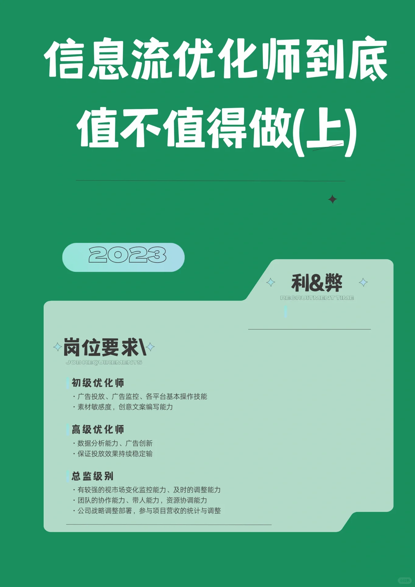 最近,越來(lái)越多的人有興趣了解信息流的位置。今天,讓我們來(lái)談?wù)勊欠裰档?,以及我們?nèi)绾味x它 評(píng)估某件事是否值得,本質(zhì)上是一個(gè)機(jī)會(huì)成本問(wèn)題。如果有一個(gè)薪水更高、占用時(shí)間更少的工作選擇,那么做一名信息流優(yōu)化器是不值得的,否則也是值得的。通過(guò)權(quán)衡利弊,人們可以做出決定。 信息流行產(chǎn)業(yè)的優(yōu)勢(shì)和劣勢(shì)分為兩部分:第一部分和第二部分 [紅心R][紅心R][紅心R][紅心R的優(yōu)點(diǎn)] [一個(gè)R]快速加薪 在過(guò)去的幾年里,工資增長(zhǎng)很快,實(shí)現(xiàn)5k-10k的飛躍并不困難。有愛(ài)心的人可以省錢(qián)。2019年同期進(jìn)入該行業(yè)的朋友,近年來(lái)以每年8-10萬(wàn)元的速度積累。別小看,光北上廣深,有多少?zèng)]有背景的年輕人一年能凈賺10萬(wàn)元如果你剛畢業(yè)就有三五十萬(wàn)的年薪,那么你基本上可以忽略信息流! [2R]創(chuàng)業(yè)機(jī)會(huì) 我對(duì)互聯(lián)網(wǎng)的變化有著深刻的感受,有機(jī)會(huì)獨(dú)自工作。我有上一家公司的同事,其中至少有10人獨(dú)立工作或組建團(tuán)隊(duì)創(chuàng)辦了公司。在與媒體聯(lián)系后,我發(fā)展了自己的客戶,沒(méi)有提供運(yùn)營(yíng)?,F(xiàn)在,我比較穩(wěn)定。三年的特殊情況并沒(méi)有阻礙在線廣告的發(fā)展,而是由于線下的各種限制,使信息流廣告變得更加重要。值得一提的是,這類(lèi)業(yè)務(wù)屬于投資和邊際成本較低的業(yè)務(wù)。一般來(lái)說(shuō),一旦客戶合作,未來(lái)幾乎不需要投入成本。 思維模式的變化 我曾經(jīng)花了三個(gè)月的時(shí)間幫助一位客戶的婚紗店實(shí)現(xiàn)利潤(rùn)翻倍。這包括客戶需求挖掘和匹配、業(yè)務(wù)利潤(rùn)分析和高利潤(rùn)群體探索,本質(zhì)上意味著數(shù)據(jù)統(tǒng)計(jì)和分析。不幸的是,客戶不記賬。如果他們有會(huì)計(jì)習(xí)慣,我相信通過(guò)分析得出的一些結(jié)論可以更好地提高他們的收入。后來(lái),客戶打電話說(shuō),他的朋友想學(xué)習(xí)這些東西,但被拒絕了,因?yàn)樗呐笥颜J(rèn)為數(shù)據(jù)統(tǒng)計(jì)和分析不專(zhuān)業(yè),他很難掌握。