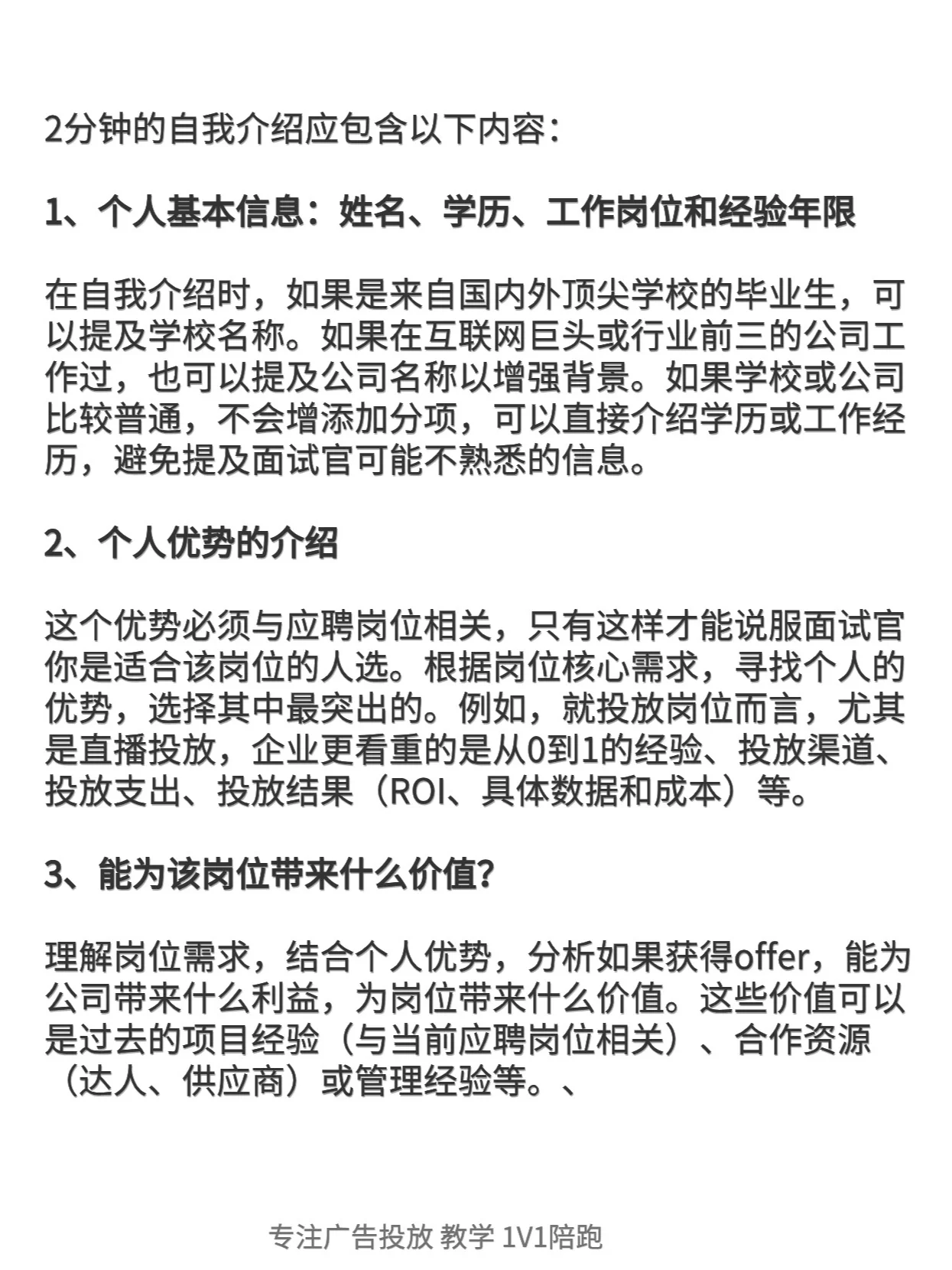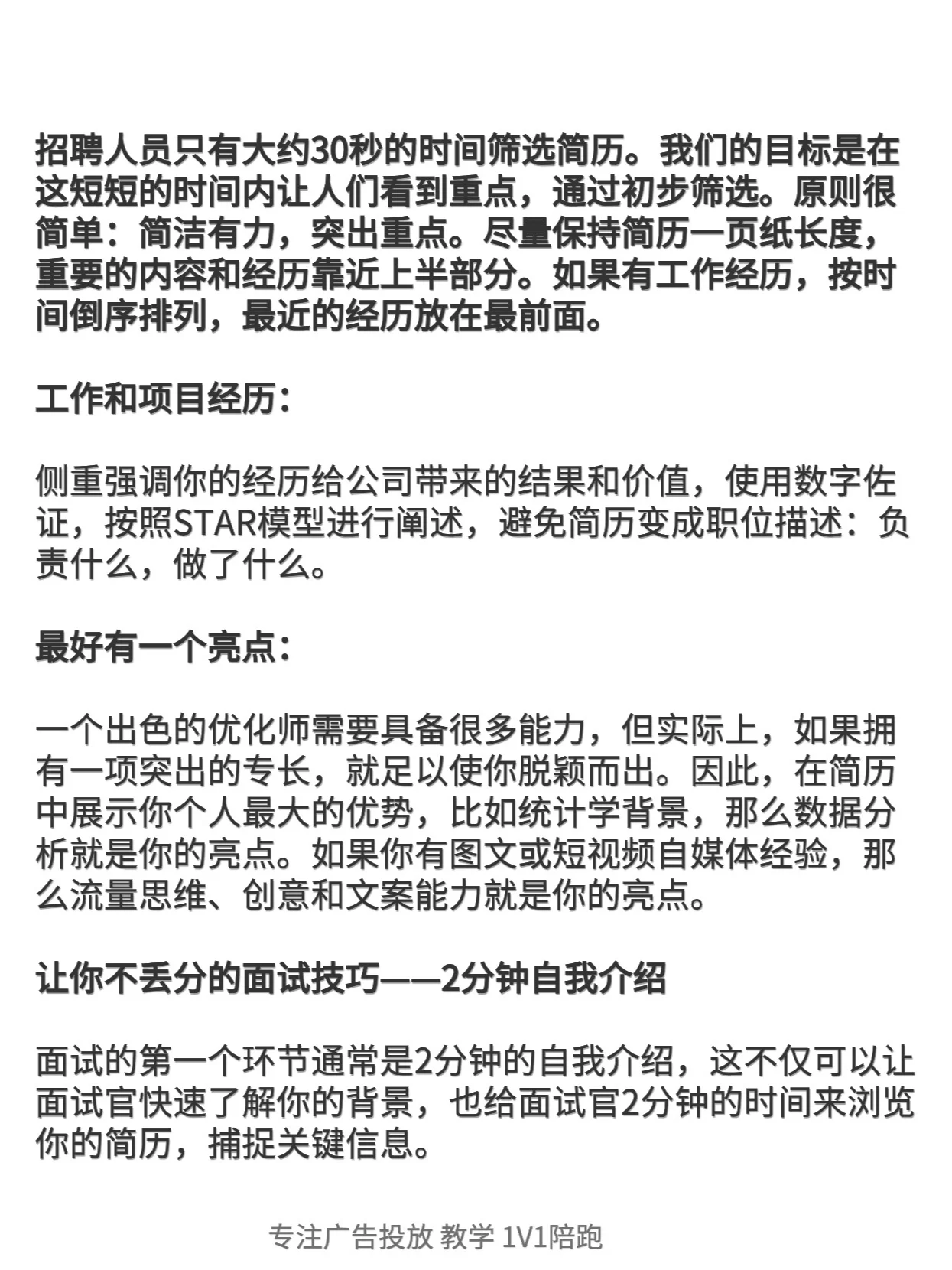 掌握這些簡歷技巧可以使沒有經(jīng)驗(yàn)的新手的面試邀請率提高80%。 1.了解行業(yè)的真實(shí)情況和工作要求: 在招聘網(wǎng)站上搜索與目標(biāo)職位相關(guān)的關(guān)鍵詞,如“信息流優(yōu)化器”,并分析幾個(gè)喜歡的職位。 2.整理個(gè)人教育、實(shí)習(xí)和工作經(jīng)歷,并與目標(biāo)工作要求進(jìn)行比較: 與該職位相關(guān)的經(jīng)驗(yàn)將被保留,即使它只占過去經(jīng)驗(yàn)的1%。如果個(gè)人經(jīng)驗(yàn)與目標(biāo)職位無關(guān),請?zhí)^。 3.寫簡歷: 招聘人員只有大約30秒的時(shí)間來篩選簡歷,所以簡歷應(yīng)該簡潔、有力,并突出重點(diǎn)。簡歷盡量保持一頁長,重要內(nèi)容和經(jīng)歷盡量放在前半部分。 4.準(zhǔn)備2分鐘的自我介紹: 包含基本的個(gè)人信息、個(gè)人優(yōu)勢介紹(與所申請的職位相關(guān))以及可以為該職位帶來的價(jià)值。 作為一名8歲的業(yè)內(nèi)投手,這里粗略總結(jié)一下“信息流優(yōu)化面試指南”,希望能對大家有所幫助