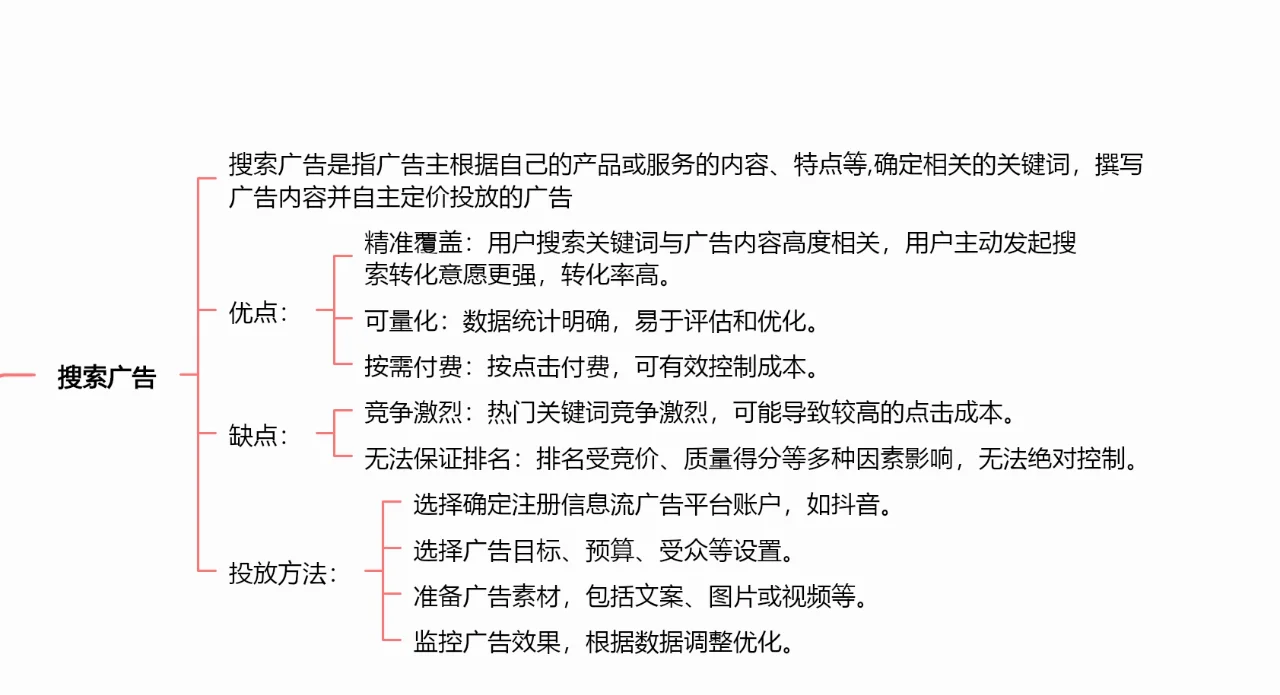 1、 搜索廣告 搜索廣告是指廣告主根據(jù)其產(chǎn)品或服務(wù)的內(nèi)容、特點(diǎn)等確定相關(guān)關(guān)鍵詞,撰寫廣告內(nèi)容,自主定價(jià)投放的廣告 優(yōu)勢: 準(zhǔn)確覆蓋:用戶搜索關(guān)鍵詞與廣告內(nèi)容高度相關(guān),用戶發(fā)起搜索轉(zhuǎn)化的意愿更強(qiáng),轉(zhuǎn)化率高。 可量化:數(shù)據(jù)統(tǒng)計(jì)清晰,易于評(píng)估和優(yōu)化。 按需付費(fèi):點(diǎn)擊付費(fèi)可以有效控制成本。 缺點(diǎn): 競爭激烈:熱門關(guān)鍵詞競爭激烈,這可能會(huì)導(dǎo)致更高的點(diǎn)擊成本。 無法保證排名:排名受投標(biāo)、質(zhì)量分?jǐn)?shù)等多種因素的影響,不能絕對(duì)控制。 2、 信息流廣告 信息流廣告是將廣告整合到用戶的信息流中,例如在社交媒體平臺(tái)或其他內(nèi)容平臺(tái)上投放廣告。 優(yōu)勢: 高用戶參與度:廣告融入信息流,更容易吸引用戶注意力。 更好的用戶體驗(yàn):廣告與內(nèi)容相似,減少了用戶對(duì)廣告的抵制。 定向投放:可以根據(jù)用戶興趣、地理位置等進(jìn)行精準(zhǔn)投放。 缺點(diǎn): 曝光效果不穩(wěn)定:由于信息流更新的速度,廣告曝光效果不穩(wěn)定性。 迷失在海量信息中:用戶信息流包含大量內(nèi)容,廣告可能被忽視。