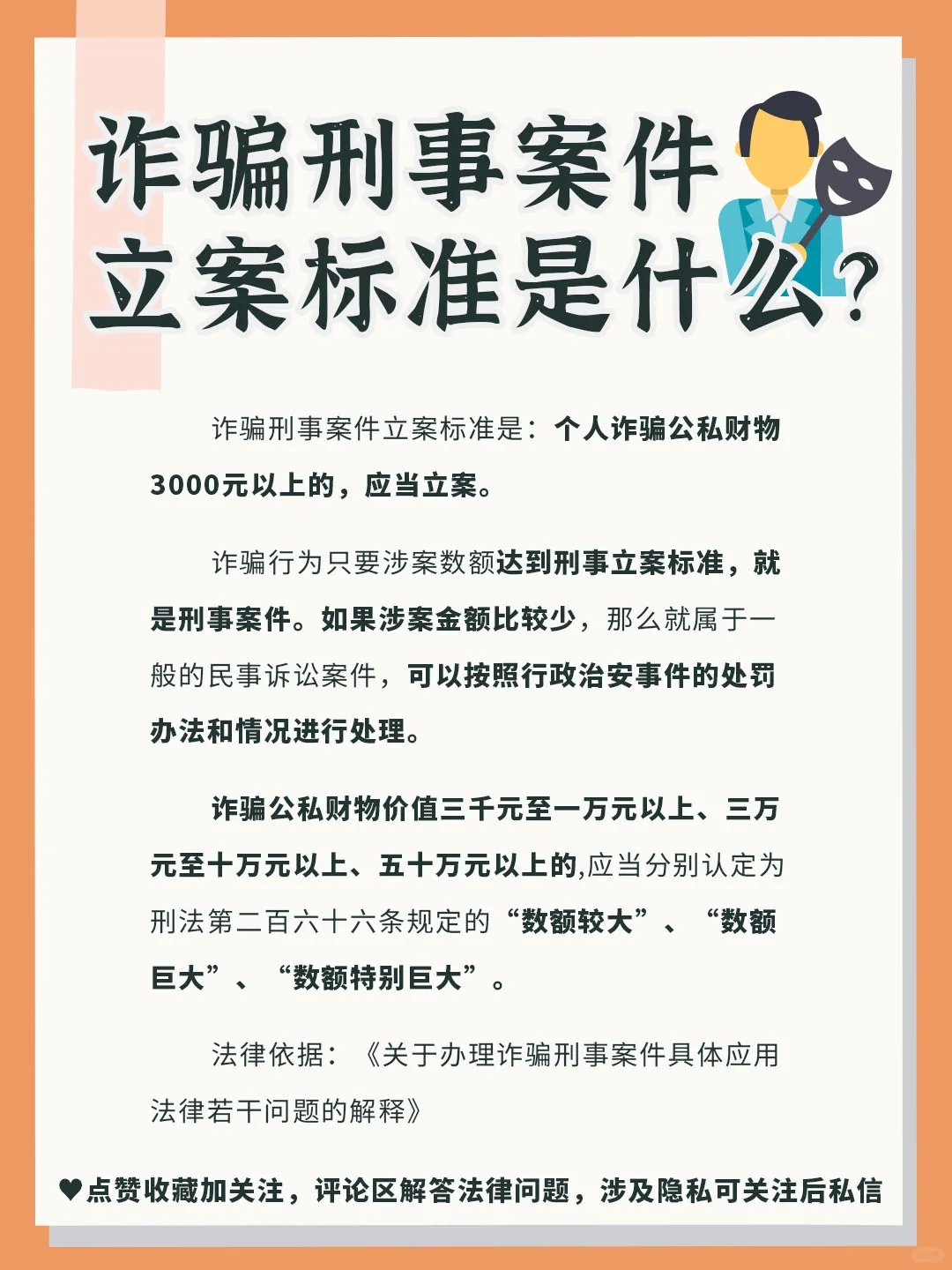 詐騙刑事立案標(biāo)準(zhǔn)是,個(gè)人詐騙公私財(cái)物3000元以上的,應(yīng)當(dāng)立案。 只要欺詐活動(dòng)的金額符合刑事立案標(biāo)準(zhǔn),就被視為刑事案件。涉案金額較小的,屬于一般民事訴訟案件,可以按照行政治安事件的處罰方式和情節(jié)處理。 詐騙公私財(cái)物,數(shù)額在3000元以上1萬(wàn)元以下、3萬(wàn)元以上10萬(wàn)元以下和50萬(wàn)元以下的,分別認(rèn)定為刑法第二百六十六條規(guī)定的“數(shù)額較大”、“數(shù)額巨大”和“數(shù)額特別巨大”。 法律依據(jù):《關(guān)于辦理詐騙刑事案件具體適用法律若干問(wèn)題的解釋》