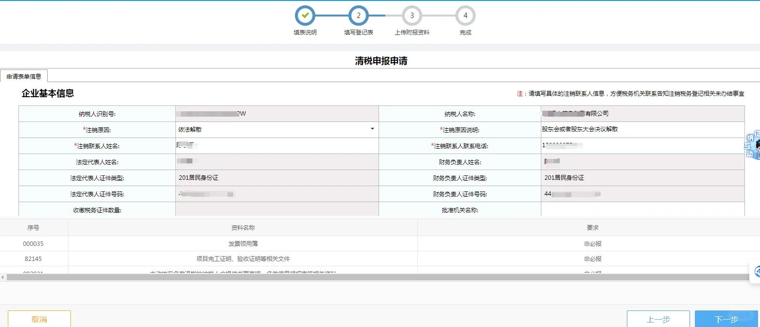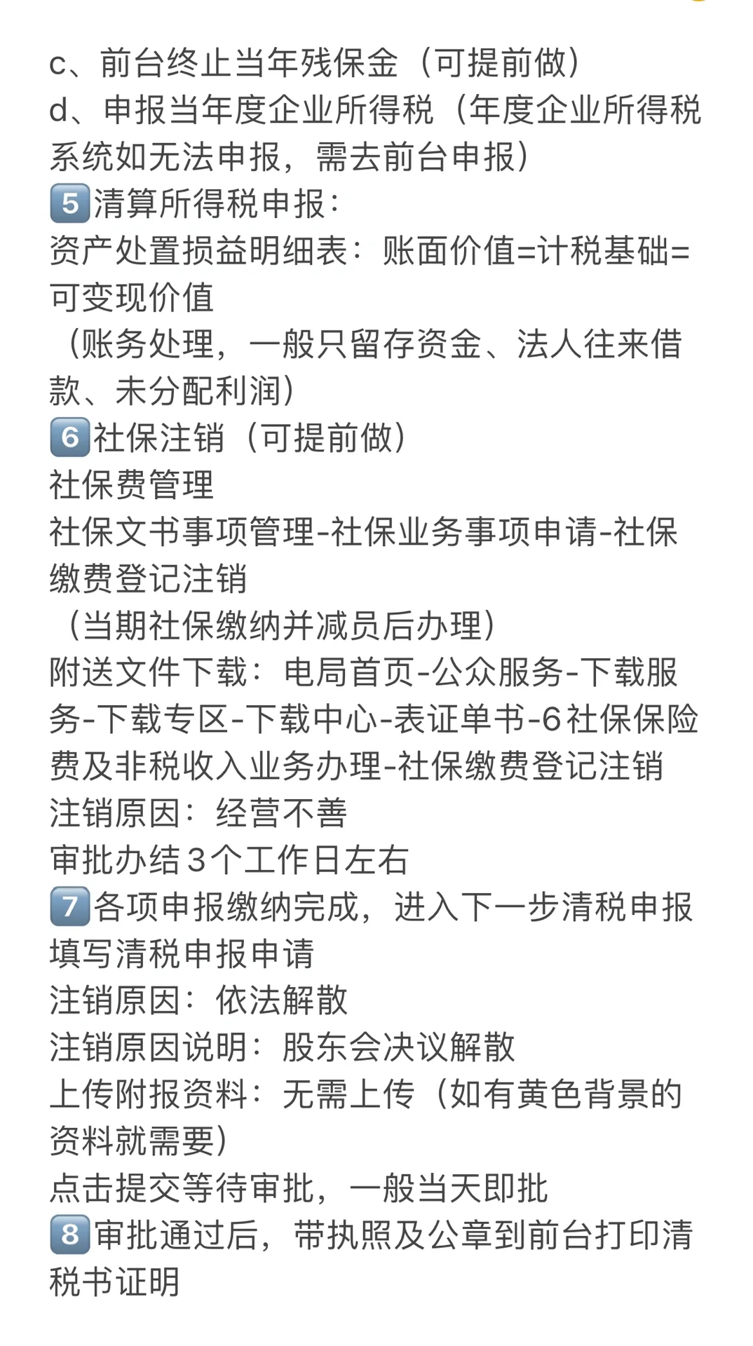 電子稅務(wù)局,選擇主頁(yè):清關(guān)和取消納稅申報(bào)和付款包 系統(tǒng)監(jiān)控逾期稅費(fèi)(如果沒(méi)有逾期或漏稅等問(wèn)題,第一步就可以了,說(shuō)明有未處理的流程。請(qǐng)攜帶您的執(zhí)照和公章到前臺(tái)查詢(xún)。一般情況下,前臺(tái)可以點(diǎn)擊刪除) 企業(yè)所得稅清算報(bào)告,點(diǎn)擊“我要清算報(bào)告”(按照程序包步驟,如圖3第二步所示)。一般清算的理由是:股東大會(huì)決定解散,清算結(jié)束日期視需要而定( 自清算結(jié)束之日起15個(gè)自然日(自然日、非工作日)內(nèi),需要申報(bào)清算所得稅。否則,它將被提升為f并進(jìn)行注冊(cè)處理 注冊(cè)申請(qǐng)獲得批準(zhǔn)后 a.申報(bào)各種應(yīng)交稅費(fèi)、報(bào)表等(系統(tǒng)會(huì)顯示稅種,點(diǎn)擊我要申報(bào):增值稅、所得稅、印花稅、房地產(chǎn)(房地產(chǎn)需終止)、傷殘保險(xiǎn)、年所得稅等) b.當(dāng)月個(gè)人所得稅系統(tǒng)無(wú)法申請(qǐng)繳納,您需要到前臺(tái)進(jìn)行申報(bào) c.在前臺(tái)終止當(dāng)年的殘疾保險(xiǎn)福利(可以提前完成) d.申報(bào)當(dāng)年企業(yè)所得稅(如果年度企業(yè)所得稅系統(tǒng)無(wú)法申報(bào),需要到前臺(tái)申報(bào)) 清算所得稅申報(bào): 資產(chǎn)處置損益表:賬面價(jià)值=計(jì)稅基礎(chǔ)=可變現(xiàn)價(jià)值 (會(huì)計(jì)處理,一般只保留資金、企業(yè)借款和未分配利潤(rùn)) 社保取消(可以提前辦理) 社會(huì)保障費(fèi)管理 社會(huì)保障文件管理.社會(huì)保障業(yè)務(wù)申請(qǐng).社會(huì)保障繳費(fèi)登記注銷(xiāo) (待本次社保繳費(fèi)和裁員后處理) 附件下載:電力局主頁(yè)-公共服務(wù)-下載服務(wù)-下載專(zhuān)區(qū)-下載中心-表格證明書(shū)-6社保費(fèi)及非稅收入業(yè)務(wù)辦理-社保繳費(fèi)登記注銷(xiāo) 取消原因:管理不善 審批過(guò)程大約需要3個(gè)工作日 完成所有申報(bào)和付款后,進(jìn)入下一步的納稅申報(bào) 填寫(xiě)納稅申報(bào)申請(qǐng) 撤銷(xiāo)理由:依法解散 撤銷(xiāo)原因說(shuō)明:股東大會(huì)決定解散公司 上傳補(bǔ)充材料:無(wú)需上傳(黃色背景材料需要上傳) 點(diǎn)擊提交審批,通常在同一天審批 批準(zhǔn)后,帶上您的執(zhí)照和公章到前臺(tái)打印清關(guān)證書(shū) PS:適用于企業(yè)的簡(jiǎn)單注銷(xiāo)