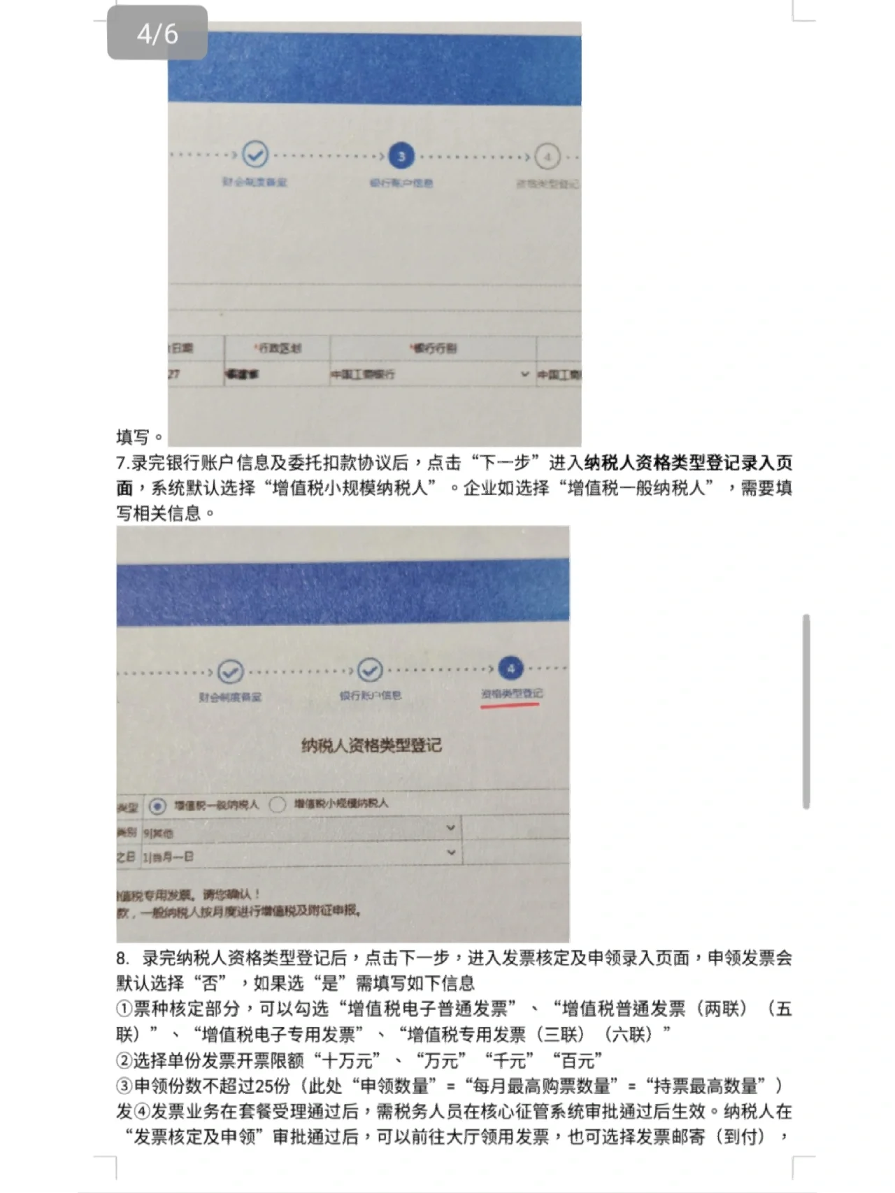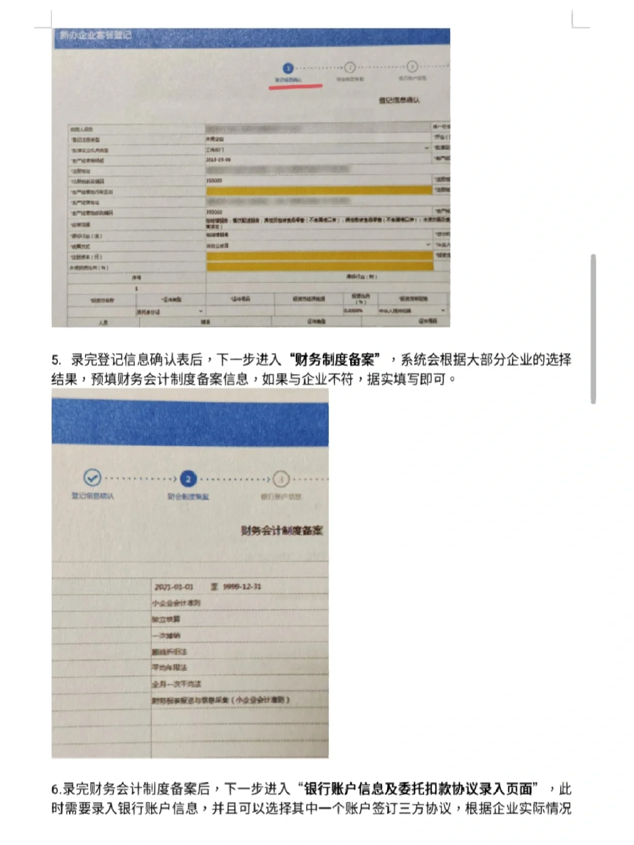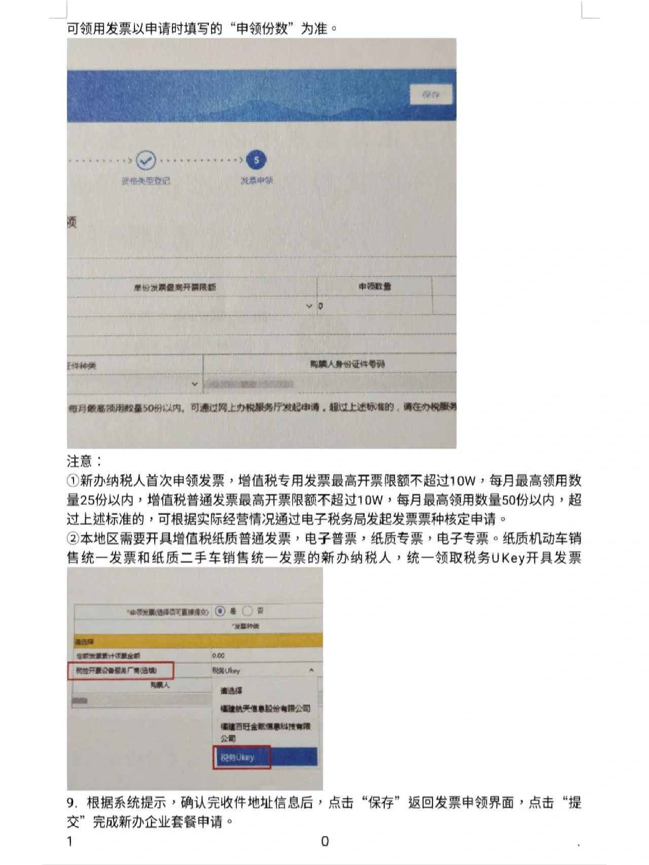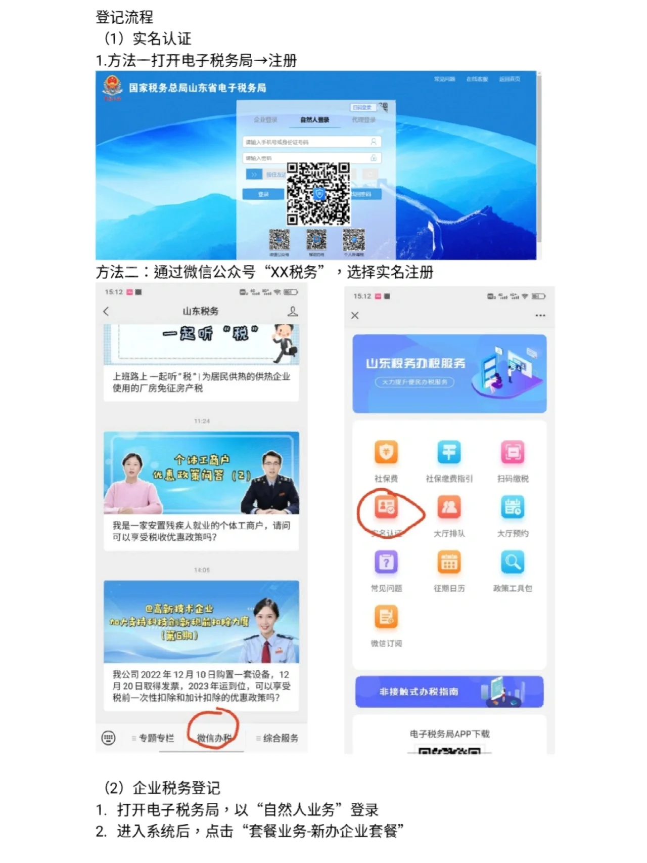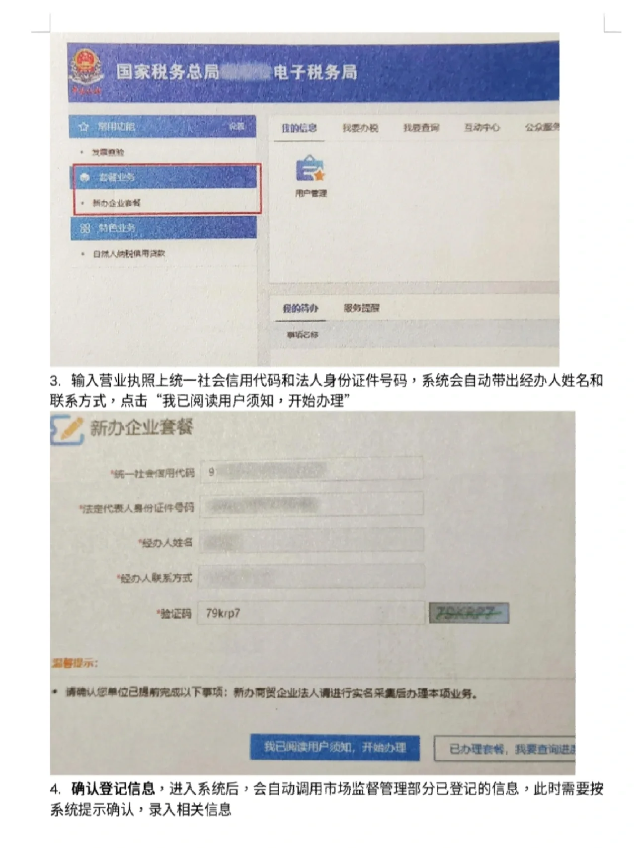(1) 實(shí)名認(rèn)證 1.方法一:打開(kāi)電子稅務(wù)局→ 登記 方法二:通過(guò)微信公眾號(hào)“XX稅務(wù)”選擇實(shí)名登記 (2) 企業(yè)稅務(wù)登記 1.打開(kāi)電子稅務(wù)局,以自然人身份登錄 2.進(jìn)入系統(tǒng)后,點(diǎn)擊“套餐業(yè)務(wù)-新建企業(yè)套餐” 3.在營(yíng)業(yè)執(zhí)照上輸入統(tǒng)一的社會(huì)信用代碼和法定代表人身份證號(hào)碼,系統(tǒng)會(huì)自動(dòng)帶出負(fù)責(zé)人的姓名和聯(lián)系方式。點(diǎn)擊“我已經(jīng)閱讀了用戶說(shuō)明并開(kāi)始處理” 4.確認(rèn)注冊(cè)信息。進(jìn)入系統(tǒng)后,它會(huì)自動(dòng)調(diào)出市場(chǎng)監(jiān)督管理部門(mén)的注冊(cè)信息。此時(shí),您需要按照系統(tǒng)提示進(jìn)行確認(rèn)并輸入相關(guān)信息 完成注冊(cè)信息確認(rèn)表后,下一步是進(jìn)入“金融系統(tǒng)備案”。該系統(tǒng)將根據(jù)大多數(shù)企業(yè)的選擇結(jié)果預(yù)先填寫(xiě)財(cái)務(wù)會(huì)計(jì)系統(tǒng)備案信息。如果與企業(yè)不匹配,可以如實(shí)填寫(xiě)。 完成財(cái)務(wù)會(huì)計(jì)系統(tǒng)備案后,下一步是進(jìn)入“銀行賬戶信息及委托扣款協(xié)議錄入頁(yè)面”。此時(shí),需要輸入銀行賬戶信息,可以選擇其中一個(gè)賬戶簽署三方協(xié)議,根據(jù)企業(yè)實(shí)際情況填寫(xiě)。 7.記錄好銀行賬戶信息和委托扣款協(xié)議后,點(diǎn)擊【下一步】,進(jìn)入納稅人資格類(lèi)型登記錄入頁(yè)面。系統(tǒng)默認(rèn)為“增值稅小規(guī)模納稅人”。如果企業(yè)選擇作為增值稅一般納稅人,則需要填寫(xiě)相關(guān)信息。 8.注冊(cè)納稅人資格類(lèi)型后,點(diǎn)擊〖下一步〗按鈕,進(jìn)入發(fā)票核驗(yàn)和申請(qǐng)錄入頁(yè)面。申請(qǐng)發(fā)票時(shí),默認(rèn)選擇“否”。如果選擇“是”,則需要填寫(xiě)以下信息 ① 對(duì)于發(fā)票類(lèi)型驗(yàn)證部分,您可以查看“增值稅電子普通發(fā)票”、“增值稅普通發(fā)票(兩份)(五份)”、“附加稅電子專(zhuān)用發(fā)票”和“增值稅專(zhuān)用發(fā)票(三份)(六份)” ② 選擇一張發(fā)票,發(fā)票限額為10萬(wàn)元、1萬(wàn)元和1000元至100元 ③ 申請(qǐng)數(shù)量不得超過(guò)25張(申請(qǐng)數(shù)量=每月最高購(gòu)票數(shù)量=最高持票數(shù)量)。包裹受理后,發(fā)票業(yè)務(wù)經(jīng)核心稅務(wù)管理系統(tǒng)稅務(wù)人員批準(zhǔn)后生效?!鞍l(fā)票核驗(yàn)申請(qǐng)”審批通過(guò)后,納稅人可以到大廳領(lǐng)取發(fā)票,也可以選擇郵寄發(fā)票(收款)。發(fā)票可以根據(jù)申請(qǐng)時(shí)填寫(xiě)的“申請(qǐng)數(shù)量”收取。 注意 ① 首次申領(lǐng)發(fā)票的新納稅人,增值稅專(zhuān)用發(fā)票最高開(kāi)票限額不超過(guò)10萬(wàn)張,每月最高開(kāi)票數(shù)量不超過(guò)25張。增值稅普通發(fā)票最高開(kāi)票限額不超過(guò)10萬(wàn)張,每月最高開(kāi)票數(shù)量不超過(guò)50張。如果超過(guò)上述標(biāo)準(zhǔn),可以根據(jù)實(shí)際業(yè)務(wù)情況通過(guò)電子稅務(wù)局發(fā)起發(fā)票類(lèi)型驗(yàn)證申請(qǐng)。 ② 當(dāng)?shù)匦枰_(kāi)具增值稅紙質(zhì)普通發(fā)票、電子普通發(fā)票、紙質(zhì)專(zhuān)用發(fā)票和電子專(zhuān)用發(fā)票。新納稅人申請(qǐng)紙質(zhì)機(jī)動(dòng)車(chē)銷(xiāo)售統(tǒng)一發(fā)票和紙質(zhì)二手車(chē)銷(xiāo)售統(tǒng)一發(fā)票的,應(yīng)獲得開(kāi)具發(fā)票的統(tǒng)一稅收UKey 9.根據(jù)系統(tǒng)提示,確認(rèn)發(fā)貨地址信息,點(diǎn)擊“提交”,即可完成新企業(yè)包的申請(qǐng)。