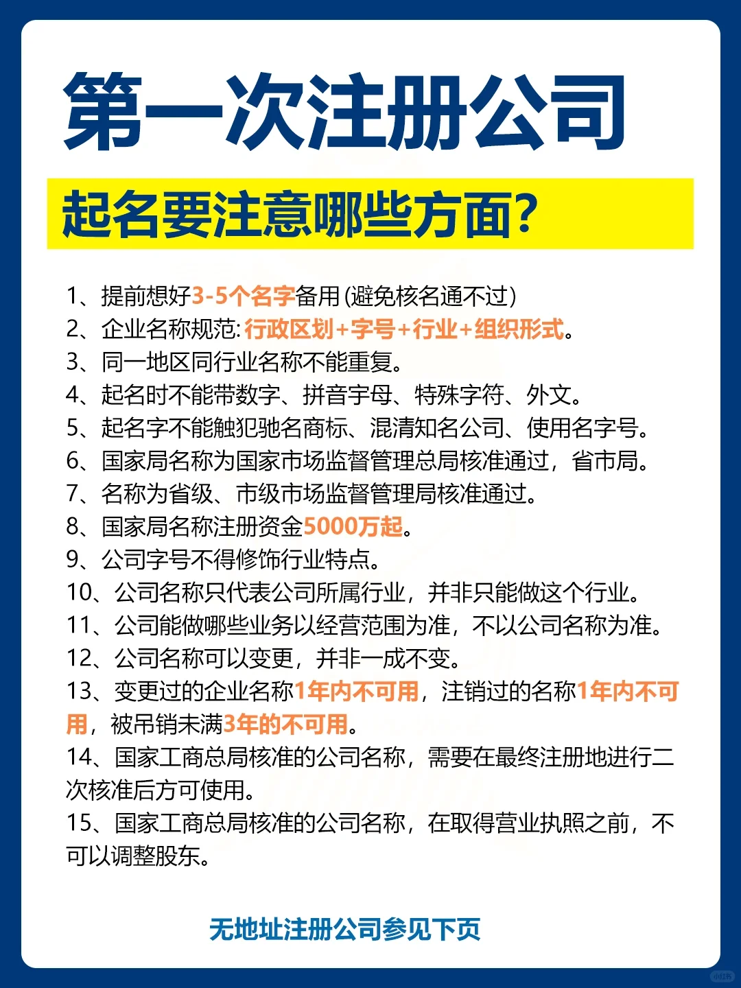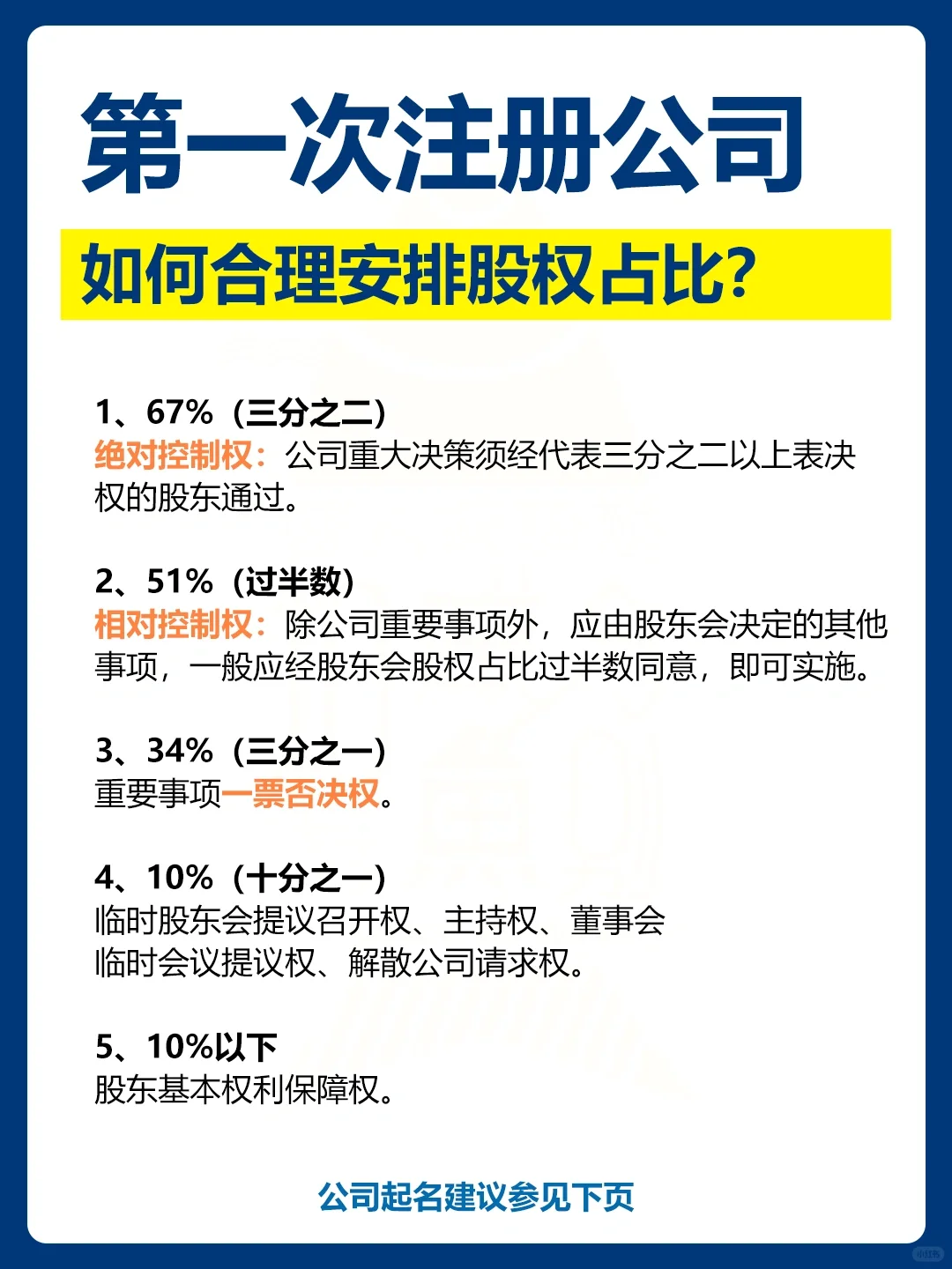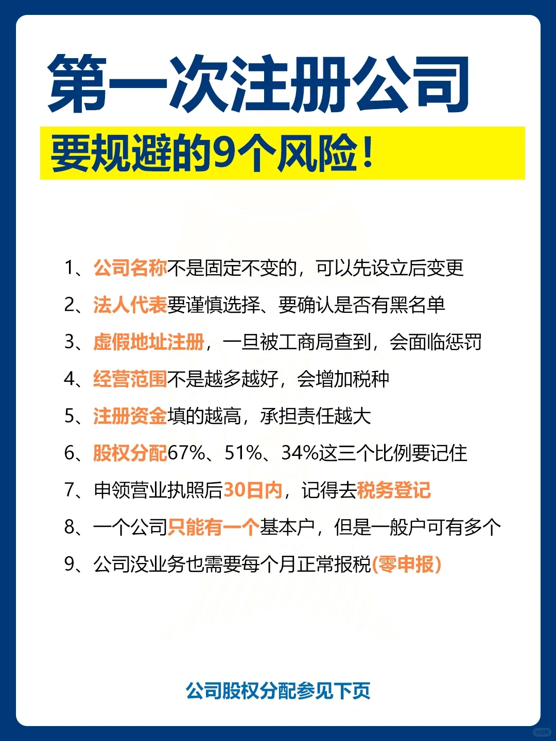 一般來說,公司注冊的過程包括:企業(yè)名稱驗證、提交材料、獲取許可證和刻制印章,以完成公司注冊并開始營業(yè)。但對于正在注冊公司的初學(xué)者來說,了解如何處理注冊公司時可能遇到的一些問題也是非常重要的。 例如,注冊公司時應(yīng)注意什么股權(quán)比例如何分配命名公司的原則是什么如何注冊沒有地址的公司 注冊公司的步驟分為三個步驟: 步驟1:準(zhǔn)備材料---- 公司名稱:2-5個備選名稱,以避免重復(fù)名稱 業(yè)務(wù)范圍:在天眼查、洽洽等平臺,指代同行 注冊資本:指公司未來的經(jīng)營金額 高管信息:法定代表人、股東、監(jiān)事身份證及電話 股份分配:投資者應(yīng)根據(jù)其出資額承擔(dān)相應(yīng)責(zé)任 地址信息:如果沒有商業(yè)地址,可以委托機(jī)構(gòu)登記 法定代表人照片:法定代表人上身照片,用于刻制印章 步驟2,處理時間---- 企業(yè)名稱審批:1天 網(wǎng)上提交材料:1天 領(lǐng)取營業(yè)執(zhí)照:1天 刻制公司印章:1天 銀行開戶:7天 稅務(wù)機(jī)關(guān)登記:2天 第3步:費用價格 手續(xù)費:免費 雕刻:免費 地址費:如果有可用的地址,則免費。注冊地址從800元到1500元不等 銀行開戶:免費查看。例如,中國工商銀行的管理費是300元/年 9用于注冊公 重要注意事項: 1.公司名稱不固定,可以先設(shè)立后變更 2.應(yīng)仔細(xì)挑選法定代表人,并確認(rèn)是否有黑名單 3.虛假地址登記,一旦被工商局發(fā)現(xiàn),將面臨處罰 4.經(jīng)營范圍越多越好,會增加稅種 5.注冊資本越高,承擔(dān)的責(zé)任越大 6.記住股權(quán)分配的三個比例:67%、51%和34% 7.記得在申請營業(yè)執(zhí)照后30天內(nèi)到稅務(wù)機(jī)關(guān)登記 8.一個公司只能有一個基本賬戶,但一般賬戶可以有多個 9.即使沒有業(yè)務(wù),公司也需要每月正常報稅(零申報) 注冊公司的股權(quán)分配: 1.67%(三分之二)絕對控制權(quán):公司的重大決策必須經(jīng)代表三分之二多表決權(quán)的股東批準(zhǔn)。 2、51%(過半數(shù))相對控制權(quán):除公司重要事項外,其他應(yīng)由股東大會決定的事項,一般需要股東大會半數(shù)以上股權(quán)同意才能實施。 3.34%(三分之一)的重要事項擁有一票否決權(quán) 4.提議召開臨時股東大會的權(quán)利、主持會議的權(quán)利、提議召開臨時董事會會議的權(quán)利和要求解散公司的權(quán)利的10%(十分之一) 5.低于10% 股東的基本維權(quán)權(quán)利 命名公司的注意事項: 1.提前計劃3-5個名稱進(jìn)行備份(避免名稱驗證不通過) 2.企業(yè)名稱規(guī)范:行政區(qū)劃+商號+行業(yè)+組織形式。
