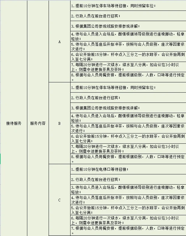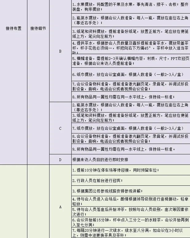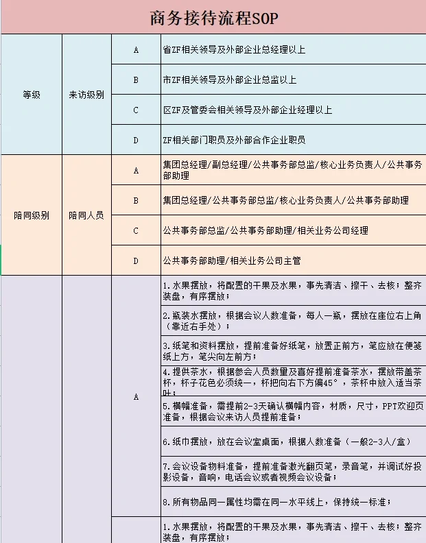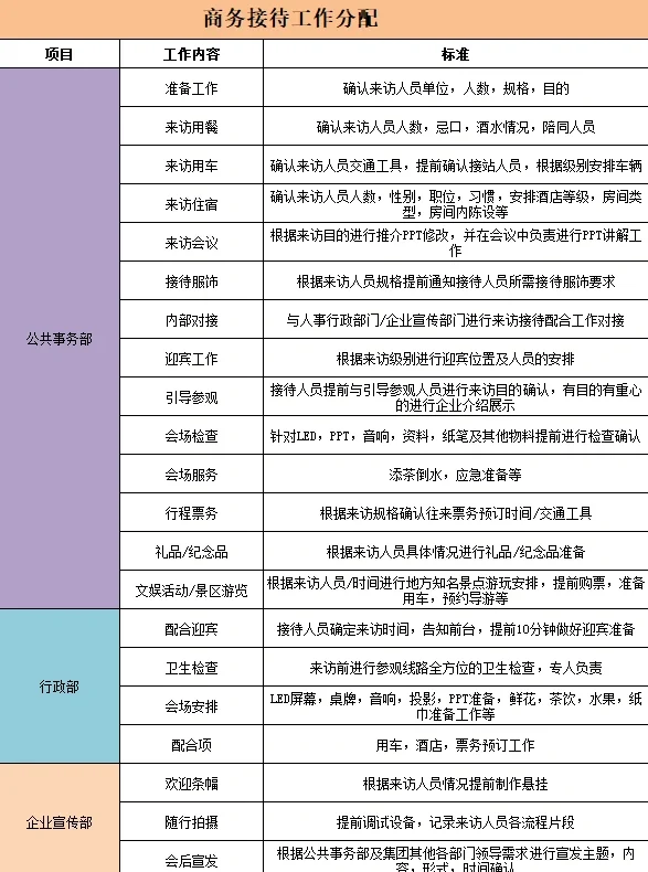 今天,我將與大家分享職場商務(wù)接待的流程,分為以下四個(gè)主要部分: 嘉賓級(jí)別:一般分為采埃孚單位、企業(yè)單位和媒體等,其中需要確認(rèn)? 部門? 等級(jí)? 未來工作安排的名稱,不同嗎在級(jí)別配置和接收標(biāo)準(zhǔn)方面存在差異; 陪同級(jí)別:根據(jù)客人的級(jí)別安排陪同人員,例如:誰是客人對(duì)于企業(yè)的總經(jīng)理和其他人員,陪同人員相當(dāng)于 公司總經(jīng)理、接待部部長; 接待安排:根據(jù)客人的級(jí)別安排接待級(jí)別,涉及哪些方面茶葉水果鮮花橫幅紙和筆,信息住處吃飯車輛等;(有許多具體細(xì)節(jié),模板已放置在圖像中) 接待服務(wù):優(yōu)化接待安排,比如提前預(yù)定XXX人到XXX上下車停車位,? 歡迎地點(diǎn)和人員,接待和解釋,會(huì)議安排、加茶倒水的時(shí)間和禮儀、用餐人數(shù)、用餐需求等。 以上就是商務(wù)接待的內(nèi)容。除了這個(gè)過程,此外,還需要注意部門之間的關(guān)系工作協(xié)作, 商務(wù)招待會(huì)通常涉及商務(wù) 公共事務(wù)部 行政部 企業(yè)宣傳部,具體內(nèi)容如下: 公共事務(wù)部負(fù)責(zé): 來訪信息確認(rèn):包括人員信息,住處吃飯車輛,協(xié)調(diào)行政部門進(jìn)行具體安排; 參觀會(huì)議的準(zhǔn)備工作:包括準(zhǔn)備好材料,檢查設(shè)備,檢查場館布局,提供場館服務(wù); 參觀行程安排:包括♀? 接待和解釋,準(zhǔn)備好紀(jì)念品并陪同游覽景點(diǎn)。 行政管理部負(fù)責(zé): 參觀接待與協(xié)調(diào):包括住處餐館車輛, 訂票; 參觀會(huì)議安排:包括茶葉水果,紙巾,餐桌標(biāo)志,橫幅,投影和音頻執(zhí)行; 企業(yè)宣傳部負(fù)責(zé): 參觀宣傳材料:根據(jù)游客及其目的設(shè)計(jì)和制作橫幅、餐桌標(biāo)志和其他接待材料; 訪問平臺(tái)推廣:根據(jù)行程安排還是會(huì)議安排視頻行程結(jié)束后,記錄照片,在公司內(nèi)外部平臺(tái)進(jìn)行宣傳,與媒體對(duì)接,塑造公司內(nèi)外部形象; 職場新手向他人學(xué)習(xí),升職加薪如此容易~