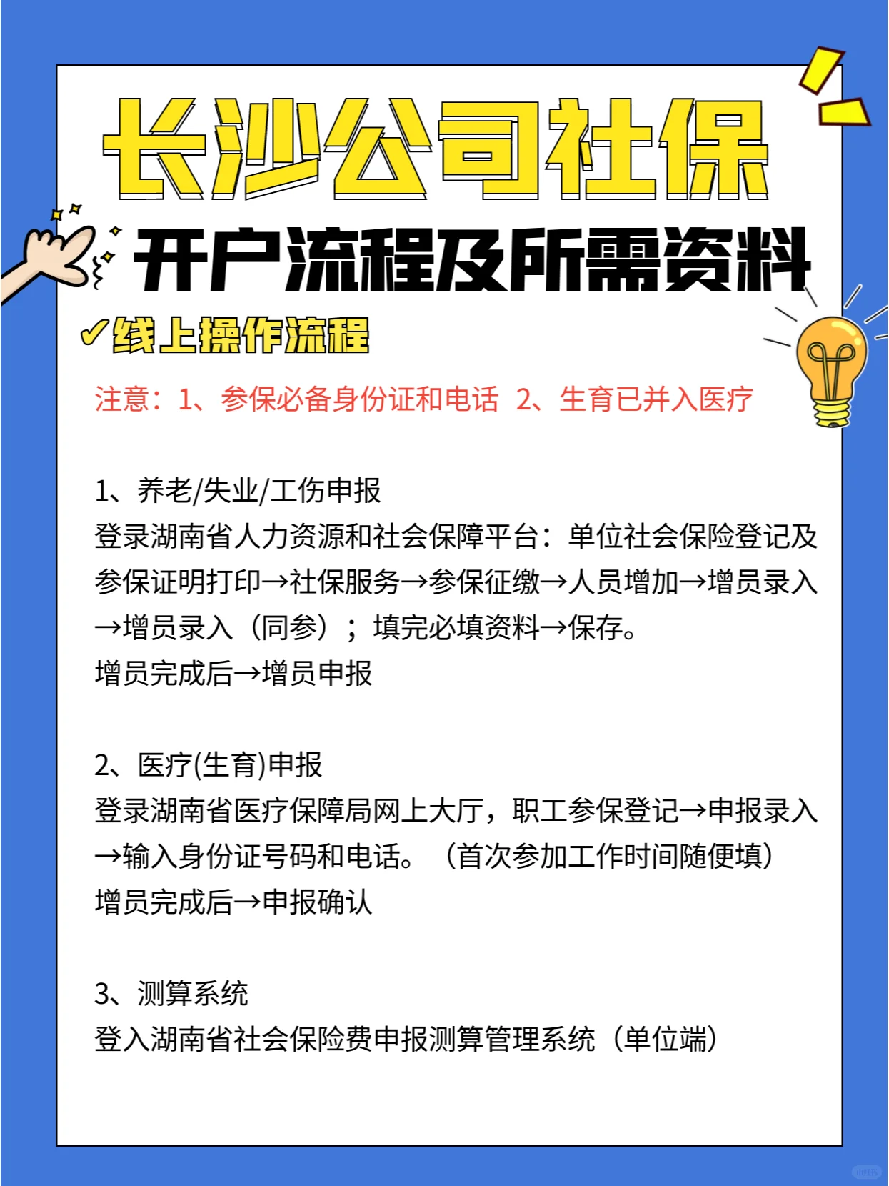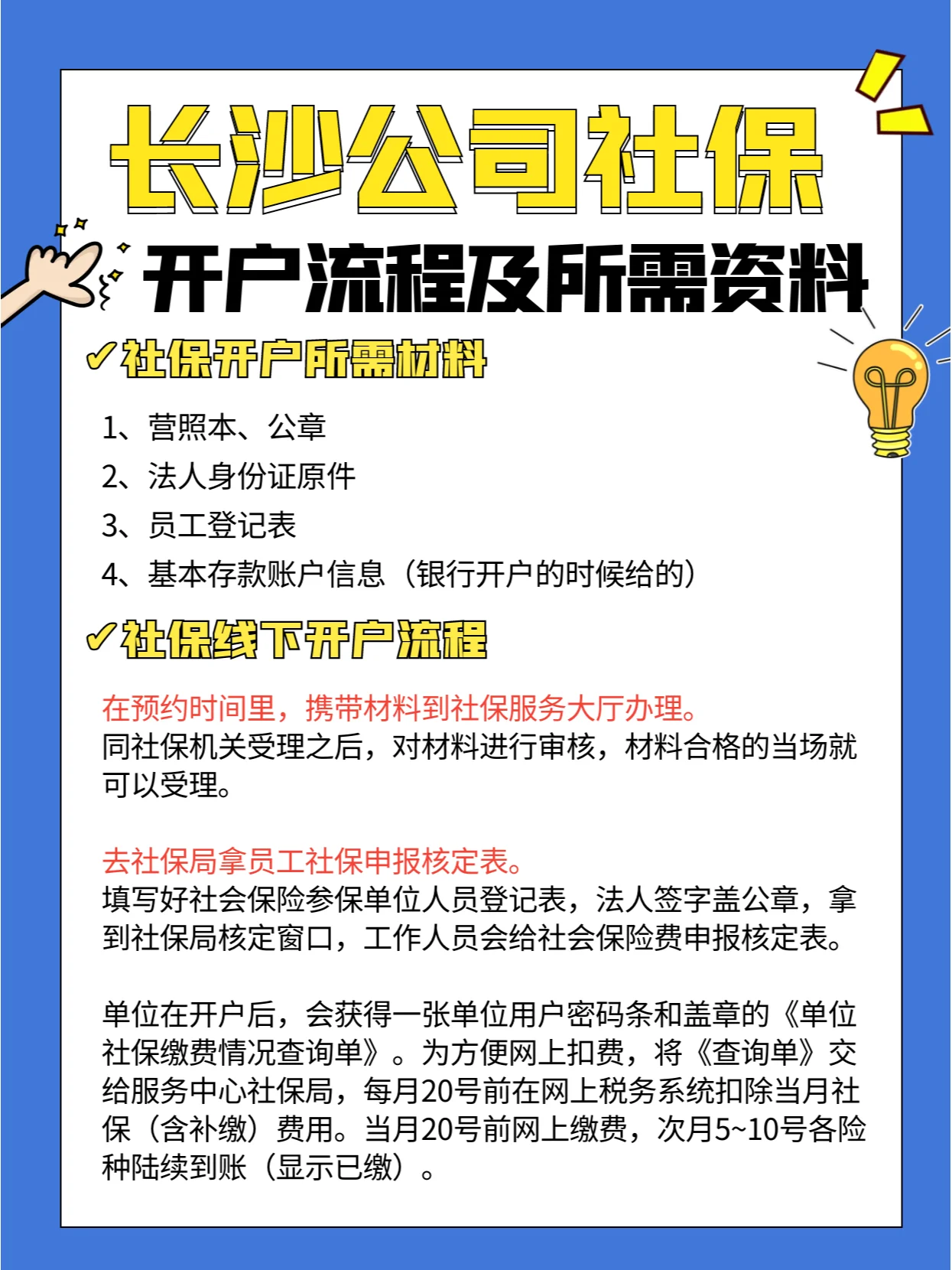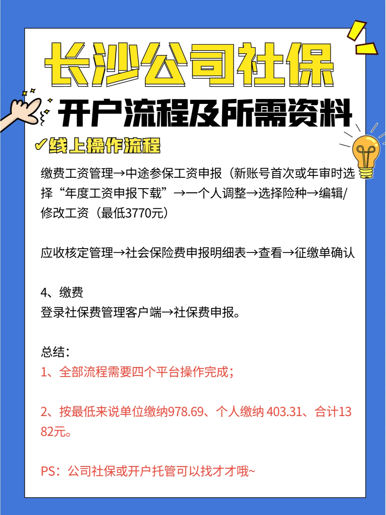 開(kāi)立社會(huì)保障賬戶所需材料 : 1.營(yíng)業(yè)執(zhí)照及公章 2.法人身份證原件 3.員工登記表 4.基本存款賬戶信息(開(kāi)立銀行賬戶時(shí)提供) 社保離線開(kāi)戶流程 在預(yù)約時(shí)間內(nèi),將材料帶到社保服務(wù)大廳辦理。 社保經(jīng)辦機(jī)構(gòu)受理后,對(duì)材料進(jìn)行審核,符合標(biāo)準(zhǔn)的可當(dāng)場(chǎng)受理。 到社保局領(lǐng)取員工社保申報(bào)驗(yàn)證表。 填寫(xiě)社會(huì)保險(xiǎn)參保單位人員登記表,由法定代表人簽字并加蓋公章,帶到社會(huì)保險(xiǎn)局核定窗口。工作人員將提供社會(huì)保險(xiǎn)費(fèi)申報(bào)驗(yàn)證表。 開(kāi)戶后,單位將收到一個(gè)用戶密碼和一份蓋章的“單位社保繳費(fèi)情況查詢(xún)表”。為方便網(wǎng)上扣款,向服務(wù)中心社保局提交《查詢(xún)表》,每月20日前在網(wǎng)上稅務(wù)系統(tǒng)中扣除每月社保(含補(bǔ)繳)費(fèi)用。網(wǎng)上支付應(yīng)在當(dāng)月20日前進(jìn)行,所有類(lèi)型的保險(xiǎn)應(yīng)在當(dāng)月5日至次月10日(顯示為已支付)陸續(xù)貸記。 在線操作流程 注意:1。參加保險(xiǎn)的基本身份證和電話號(hào)碼 2.生育能力已納入醫(yī)療保健 退休/失業(yè)/工傷申報(bào) 登錄湖南省人力資源和社會(huì)保障平臺(tái):?jiǎn)挝簧鐣?huì)保險(xiǎn)登記和參保證明打印->社保服務(wù)->保險(xiǎn)征繳->人員增加->報(bào)名錄入->報(bào)名錄入(同參考);填寫(xiě)所需信息→ 拯救 招聘完成后→ 招聘申請(qǐng) 醫(yī)療(產(chǎn)婦)申報(bào) 登錄湖南省醫(yī)療保障局網(wǎng)上大廳,辦理參保登記→ 申報(bào)和錄入→ 輸入身份證號(hào)碼和電話號(hào)碼。(隨機(jī)填寫(xiě)第一個(gè)工作時(shí)間) 人員添加完成后→ 申報(bào)確認(rèn) 計(jì)算系統(tǒng) 登錄湖南省社會(huì)保險(xiǎn)費(fèi)申報(bào)計(jì)算管理系統(tǒng)(單位端) 支付工資管理→ 中途保險(xiǎn)薪資申報(bào)(首次開(kāi)戶或年審選擇“年薪申報(bào)下載”)→ 個(gè)人調(diào)整→ 選擇保險(xiǎn)類(lèi)型→ 編輯/修改工資(最低3770元) 應(yīng)收賬款核銷(xiāo)管理→ 社會(huì)保險(xiǎn)費(fèi)申報(bào)明細(xì)表→ 看法→ 收款單確認(rèn) 繳費(fèi):登錄社保費(fèi)管理客戶端→ 社保費(fèi)申報(bào)。 總結(jié) 1.整個(gè)過(guò)程需要完成四個(gè)平臺(tái)操作; 2.最低由單位支付978.69元,個(gè)人支付403.31元,合計(jì)1382元。