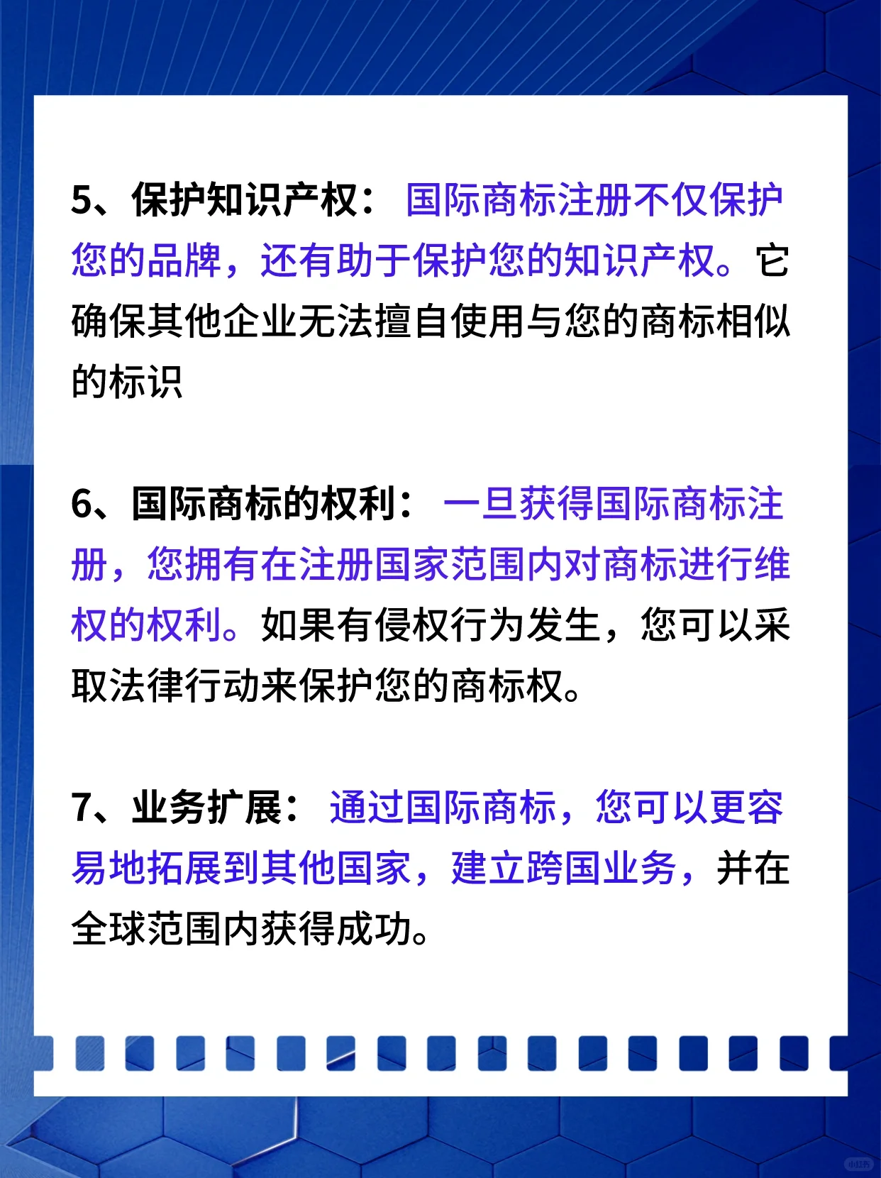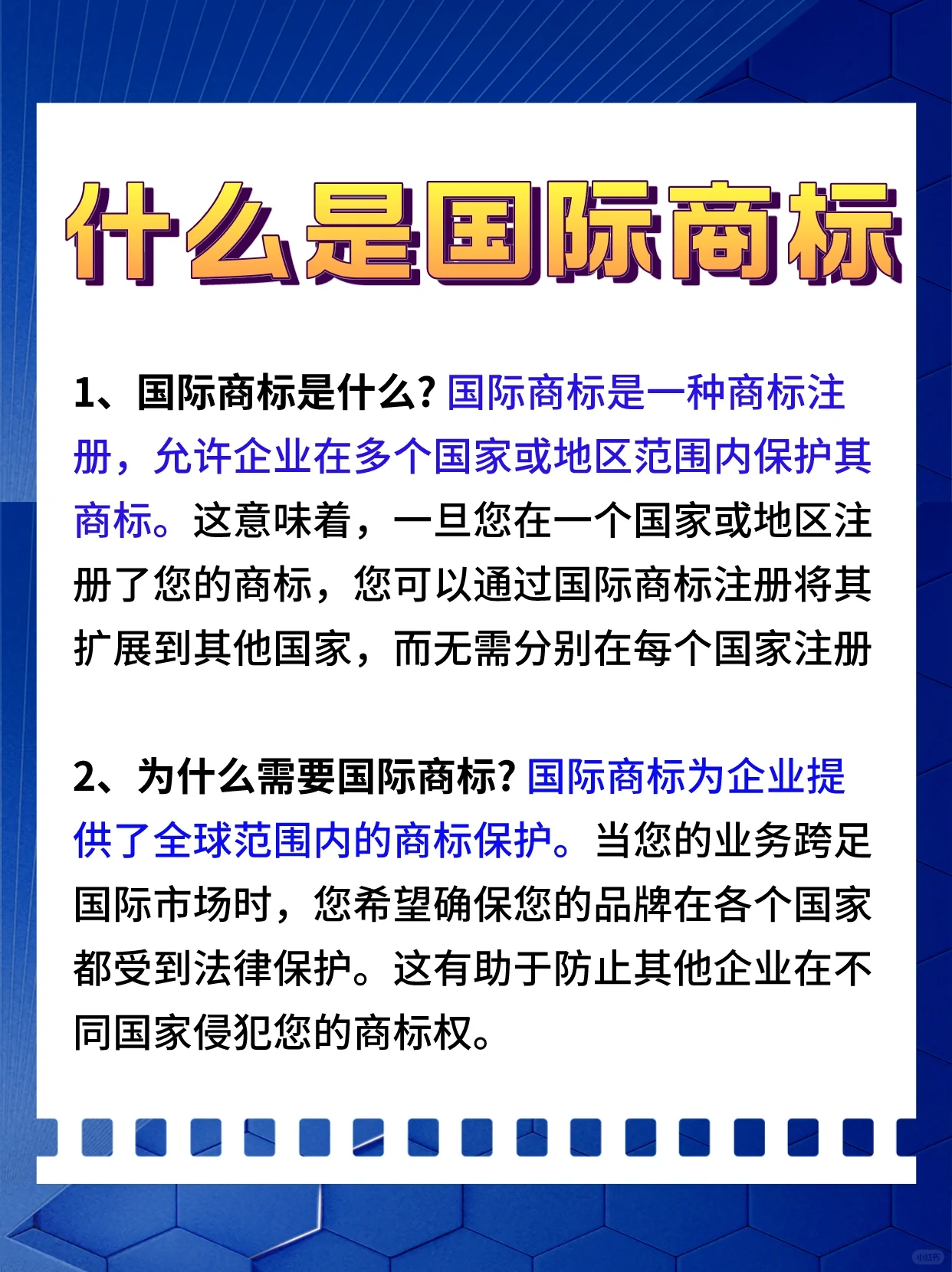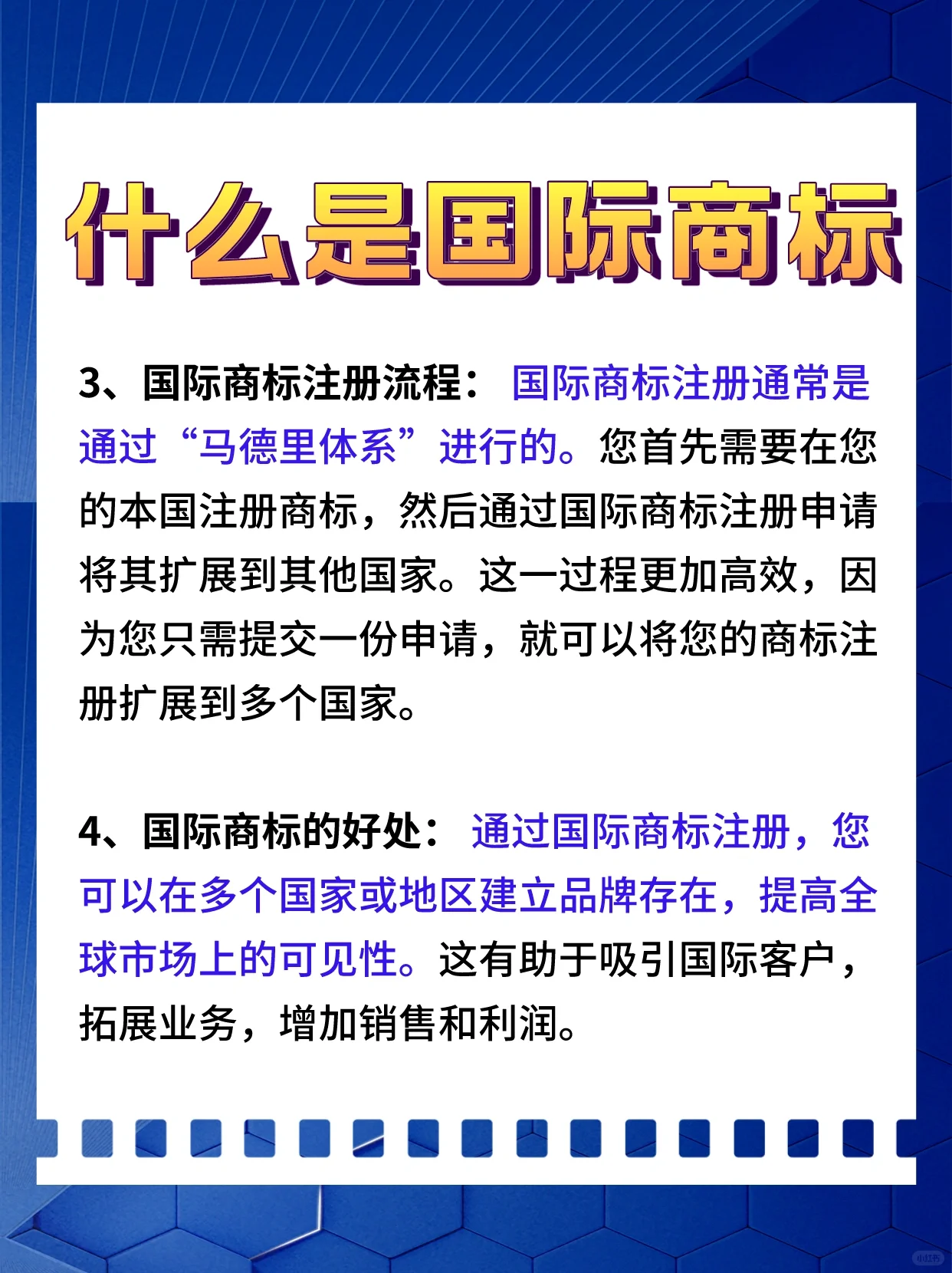當您決定將業(yè)務擴展到國際市場時,國際商標就變得至關重要。讓我們了解一下什么是國際商標,以及它給您的企業(yè)帶來的好處。 1.什么是國際商標國際商標是一種商標注冊,允許公司在多個國家或地區(qū)保護其商標。這意味著,一旦你在一個國家或地區(qū)注冊了商標,你就可以通過國際商標注冊將其擴展到其他國家,而不必在每個國家單獨注冊。 2.為什么我們需要一個國際商標國際商標為企業(yè)提供全球商標保護。當您的企業(yè)進入國際市場時,您希望確保您的品牌在所有國家都受到法律保護。這有助于防止其他公司在不同國家侵犯您的商標權。 3.國際商標注冊流程:國際商標注冊通常通過馬德里系統(tǒng)進行。您首先需要在本國注冊商標,然后通過國際商標注冊申請將其擴展到其他國家。這個過程更有效,因為你只需要提交一份申請,就可以將商標注冊擴展到多個國家。 4.國際商標的好處:通過國際商標注冊,您可以在多個國家或地區(qū)建立品牌影響力,提高在全球市場的知名度。這有助于吸引國際客戶,擴大業(yè)務,增加銷售額和利潤。 5.保護知識產(chǎn)權:國際商標注冊不僅保護您的品牌,也有助于保護您的知識產(chǎn)權。它確保其他企業(yè)在未經(jīng)授權的情況下不能使用與您的商標類似的徽標。 6.國際商標權:一旦您獲得國際商標注冊,您就有權在注冊國保護商標。如果發(fā)生侵權行為,您可以采取法律行動保護您的商標權。 7.業(yè)務拓展:通過國際商標,您可以更容易地擴展到其他國家,建立跨境業(yè)務,并在全球范圍內(nèi)取得成功。 總的來說,國際商標是擴大國際業(yè)務的重要工具,為您的品牌提供全球保護和機會。如果您計劃在國際市場發(fā)展業(yè)務,并考慮注冊國際商標,這將為您的業(yè)務帶來長期利益。