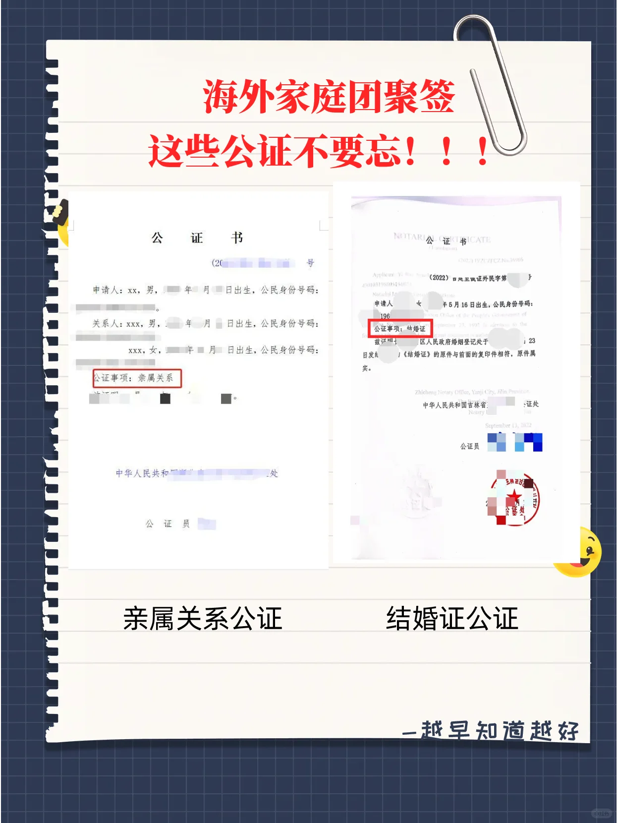 家庭團(tuán)聚簽證指的是在某國(guó)家擁有合法居留的人,他的直系親屬(通常是未成年人或是其父母,但需要經(jīng)濟(jì)依附于此人)可以請(qǐng)團(tuán)聚類型簽證。根據(jù)申請(qǐng)的列別不同,一般需要辦理不同的公證: 未成年孩子和父母 一般需要提供孩子的出生醫(yī)學(xué)證明公證和親屬關(guān)系公證。 夫妻關(guān)系 一般需要結(jié)婚證公證或者做親屬關(guān)系公證也行。 祖孫關(guān)系 一般需要孩子和父母的身份證、戶口簿去做祖孫親屬關(guān)系公證。 ?具體需要辦理哪種公證,主要是看去往國(guó)家或者簽證中心的要求。 親屬關(guān)系公證辦理需要的資料: 申請(qǐng)人身份證、戶口簿; 關(guān)系人身份證、戶口簿; 兩人的親屬關(guān)系證明。 線上辦理的話,提供資料的照片或者掃描件就行!??公證一般3-5個(gè)工作日,海牙認(rèn)證7.個(gè)工作日左右,加急的話1-3個(gè)工作日。 ??????????