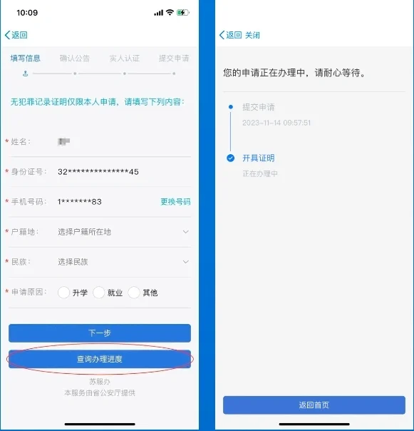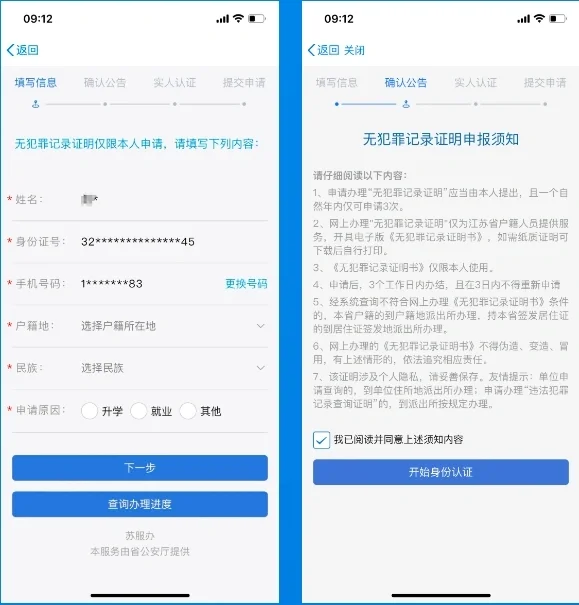 什么是“無犯罪記錄證明” 無犯罪記錄證明是申請人無犯罪記錄的證明。 在什么情況下,我可以在放大鏡R下申請無犯罪記錄證書 單元查詢。單位可以查詢其從業(yè)人員或者擬錄用人員的犯罪記錄,但應當遵守法律、行政法規(guī)關于禁止錄用的規(guī)定。 個人搜索。個人可以查閱自己的犯罪記錄,也可以委托他人查閱。受托人應當具有完全民事行為能力,“個人”包括中國公民和在中國居住180天以上的外國人。 其他情況查詢。行政機關實施行政許可、授予職業(yè)資格,公證機關辦理犯罪記錄公證時,可以依法查詢相關人員的犯罪記錄。關于查詢程序,請參閱單位查詢的相關規(guī)定。 如何在線申請放大鏡R 登錄【蘇辦】APP,在首頁搜索“無犯罪記錄證明”即可進入服務 根據(jù)需要填寫信息,繼續(xù)下一步,并閱讀聲明無犯罪記錄證書的說明 通過實名認證后,即可完成申請?zhí)峤? 點擊“查詢處理進度”查看處理進度 網(wǎng)上申請是電子版的無犯罪記錄證明 如果你需要紙質(zhì)校樣,你可以下載并自己打印 犯罪記錄證明可以打開多少次 無犯罪記錄證書的申請應由個人提交,通常一個自然年內(nèi)只能提出三次申請。 申請放大鏡R后,證書可以頒發(fā)多久 申請后,一般在3個工作日內(nèi)完成,3天內(nèi)不能重新申請。 省外戶籍人員可以網(wǎng)上申請“無犯罪記錄證明”嗎 無犯罪記錄證明網(wǎng)上辦理,僅為江蘇省戶籍人員和持有江蘇省頒發(fā)的居住證的流動人口提供服務。簽發(fā)了無犯罪記錄的電子證書。 如果我在網(wǎng)上申請后不符合網(wǎng)上申請的要求,該怎么辦 系統(tǒng)查詢不符合網(wǎng)上辦理《無犯罪記錄證明》條件的,有本省戶籍的到戶籍所在地派出所辦理,有本省籍居住證的到戶籍地派出所辦理。 境外使用無犯罪記錄證明如何公證認證 線下公證:親自帶材料到戶籍或居住地公證處 在線公證:提供材料掃描件,無需親自到場,在線完成整個流程,然后郵寄到您手中