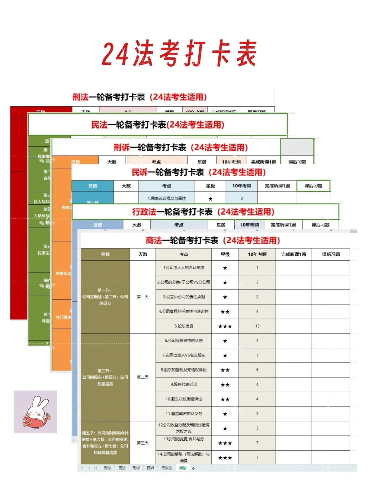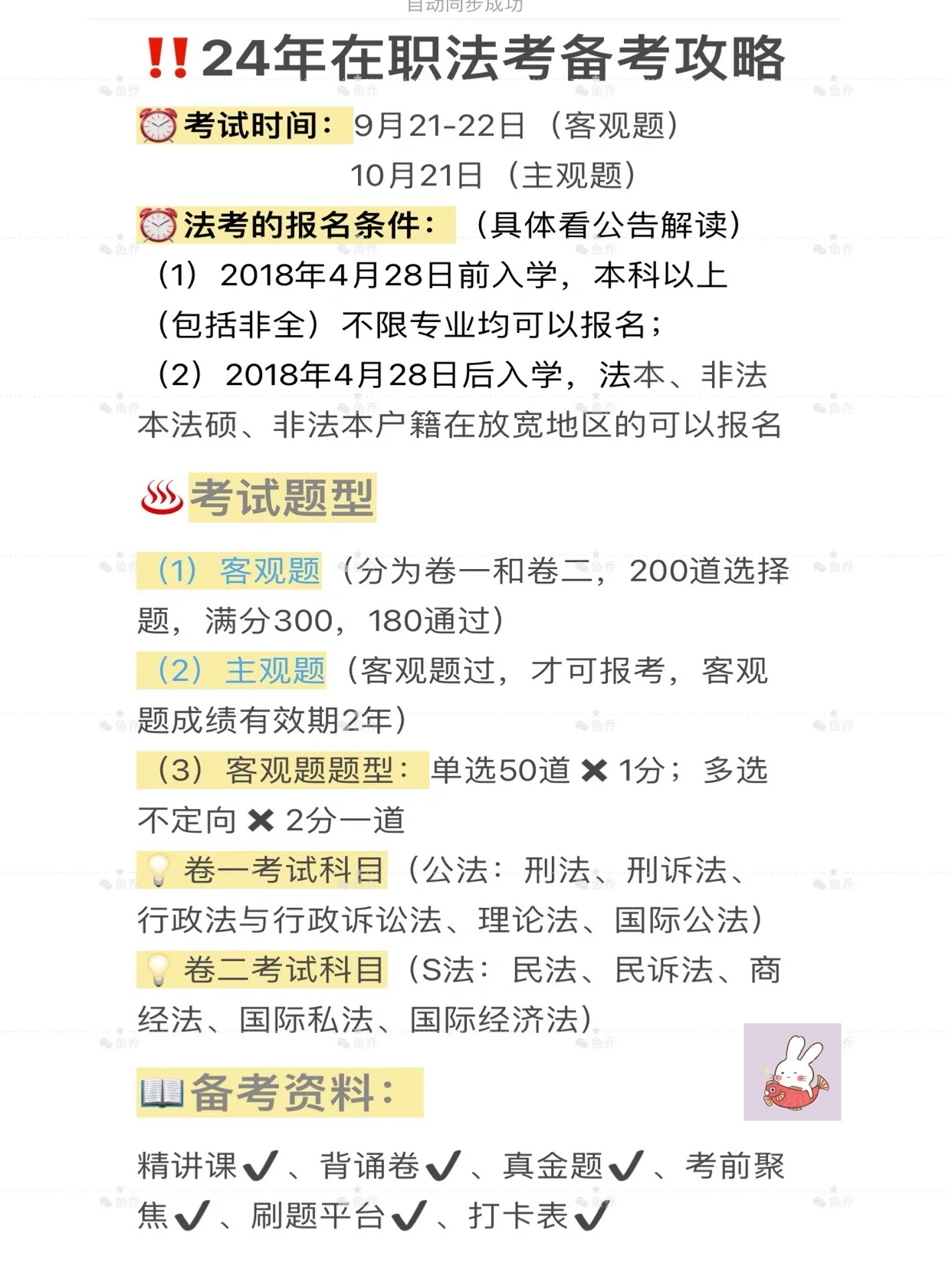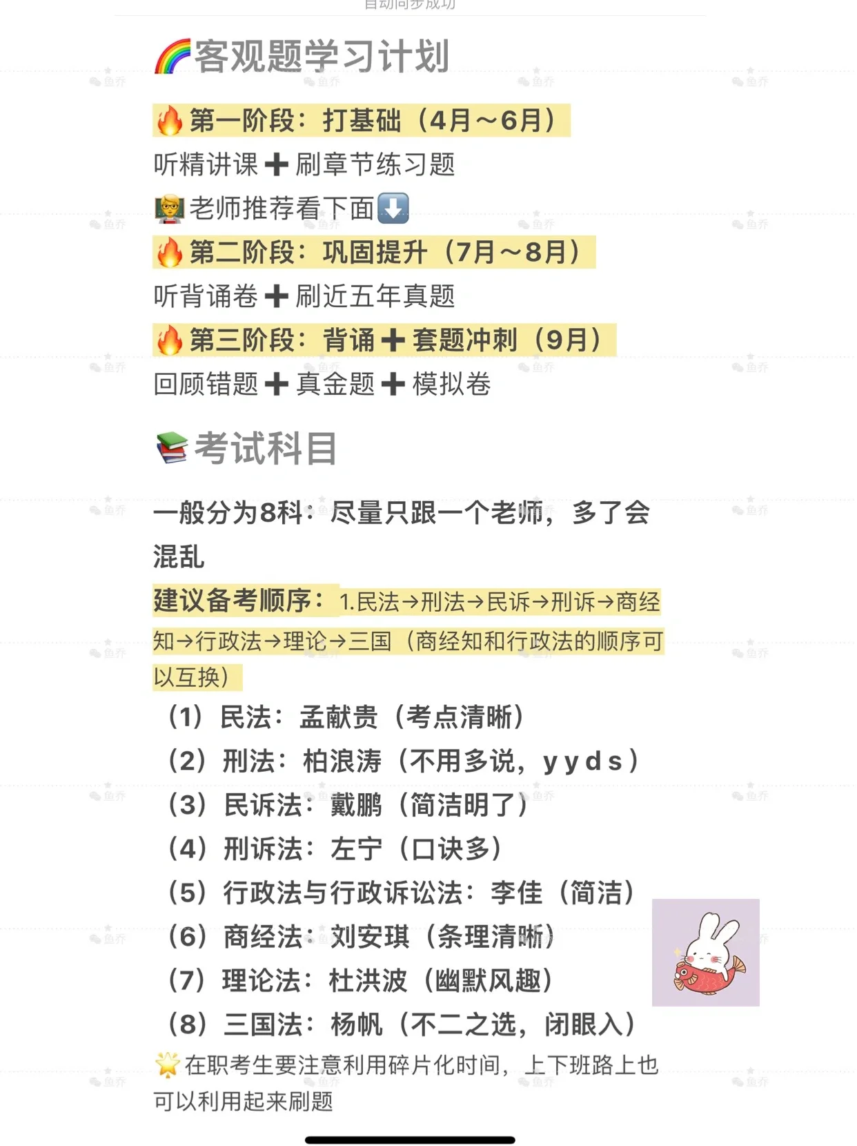 ??24年在職法考備考攻略 考試時間:9月21-22日(客觀題) 10月21日(主觀題) 法考的報名條件:(具體看公告解讀) (1)2018年4.月28日前入學(xué),本科以上(包括非全)不限專業(yè)均可以報名; (2)2018年4.月28日后入學(xué),法本、非法本法碩、非法本戶籍在放寬地區(qū)的可以報名 考試題型 1.客觀題(分為卷一和卷二,200道選擇題,滿分300, 180通過) 2.主觀題(客觀題過,才可報考,客觀題成績有效期2.年) 3.客觀題題型:單選50道1.分;多選不定向2.分一道 卷一考試科目(公法:刑法、刑訴法、行政法與行政訴訟法、理論法、國際公法) 卷二考試科目S法:民法、民訴法、商經(jīng)法、國際私法、國際經(jīng)濟法) 備考資料: 精講課?、背誦卷?、真金題?、考前聚焦?、刷題平臺?、打卡表? 客觀題學(xué)習(xí)計劃 第一階段:打基礎(chǔ)4.月~6.月) 聽精講課刷章節(jié)練習(xí)題 ?老師推薦看下面 第二階段:鞏固提升7.月~8.月) 聽背誦卷刷近五年真題 第三階段:背誦套題沖刺(9月) 回顧錯題真金題模擬卷 考試科目 一般分為8.科:盡量只跟一個老師,多了會混亂 建議備考順序:1.民法→刑法→民訴→刑訴→商經(jīng)知→行政法→理論→三國(商經(jīng)知和行政法的順序可以互換) 1.民法:孟獻貴(考點清晰) 2.刑法:柏浪濤(不用多說,y y d s) 3.民訴法:戴鵬(簡潔明了) 4.刑訴法:左寧(口訣多) 5.行政法與行政訴訟法:李佳(簡潔) 6.商經(jīng)法:劉安琪(條理清晰) 7.理論法:杜洪波(幽默風(fēng)趣) 8.三國法:楊帆(不二之選,閉眼入) 在職考生要注意利用碎片化時間,上下班路上也可以利用起來刷題
