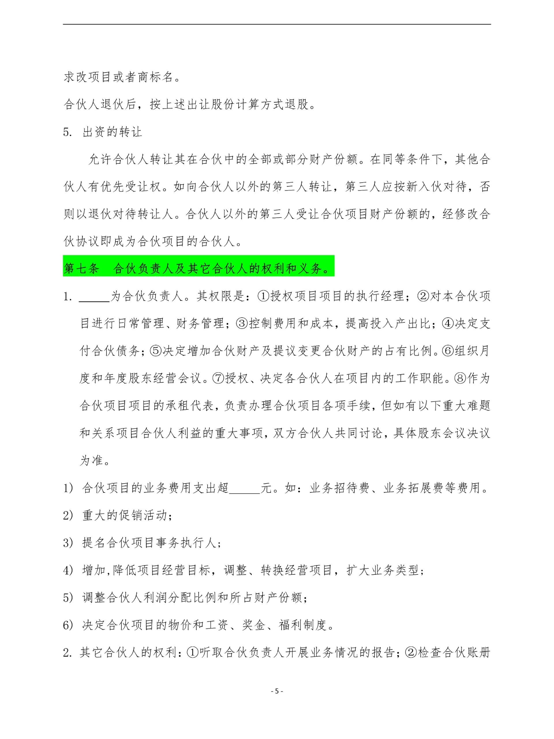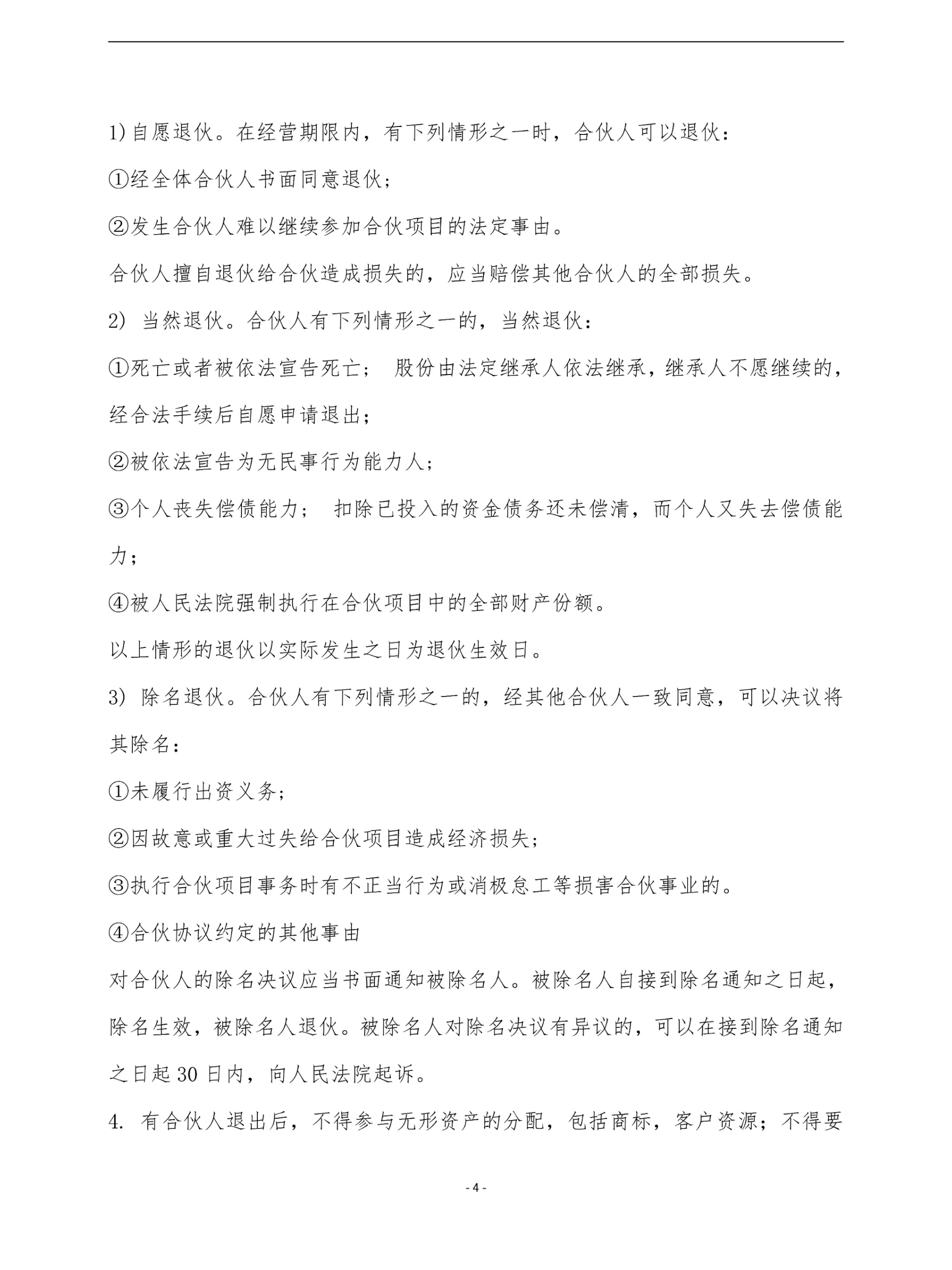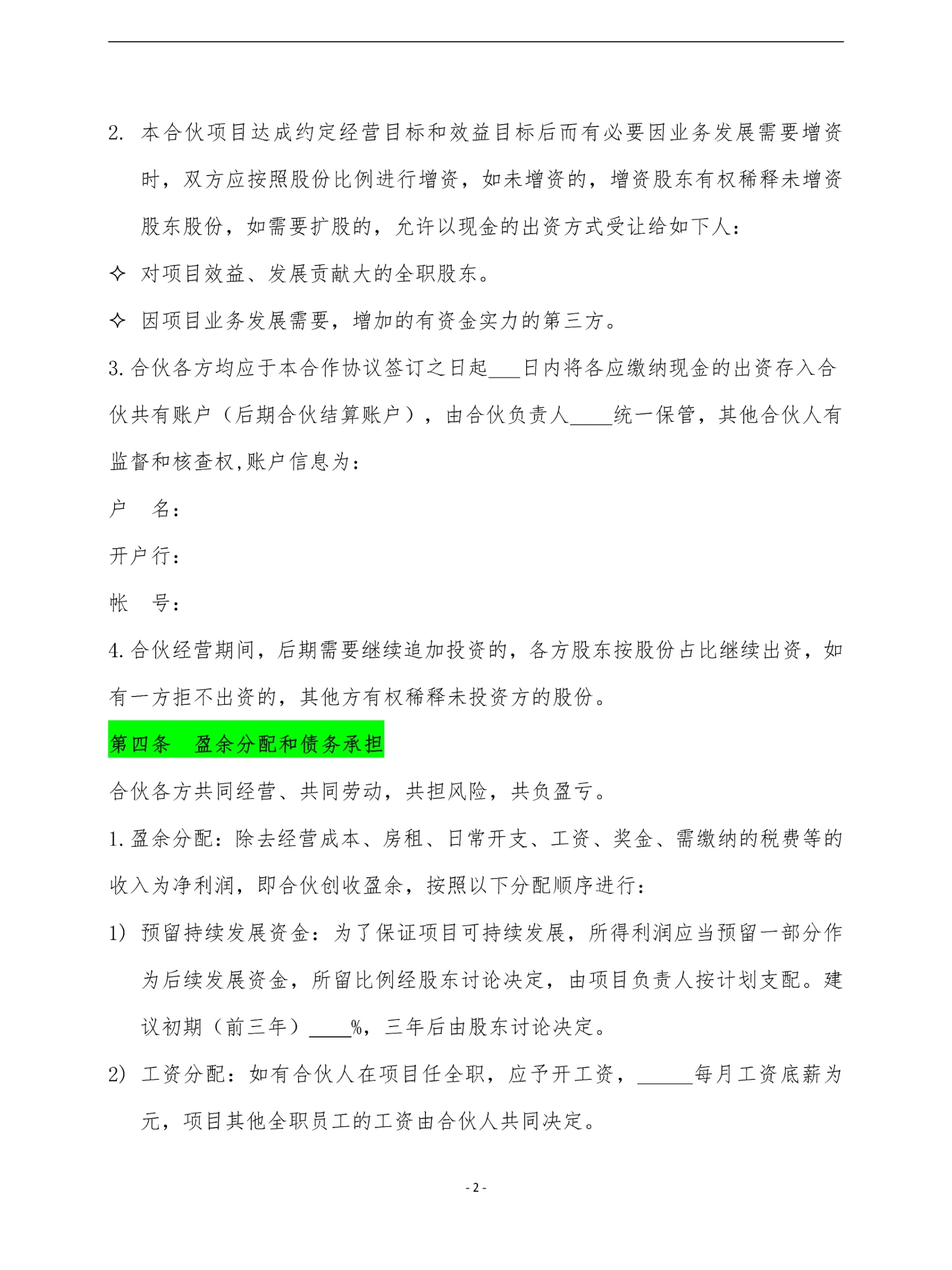 電子版合伙協(xié)議模板適用于工程項(xiàng)目股東權(quán)益合伙協(xié)議合同模板。 第一條合伙企業(yè)宗旨。第二條合伙企業(yè)經(jīng)營項(xiàng)目及范圍。 第三條出資額、出資方式和出資期限。 第四條盈余分配和債務(wù)承擔(dān)。 第五條合伙期限。 第六條加入或者退出合伙企業(yè),轉(zhuǎn)讓出資。 第七條合伙企業(yè)負(fù)責(zé)人和其他合伙人的權(quán)利和義務(wù)。 第八條合伙人的權(quán)利和義務(wù)。 第九條合伙項(xiàng)目的規(guī)章制度。 第十條禁止行為。第10條:合伙企業(yè)業(yè)務(wù)的延續(xù)。 第十一條合伙企業(yè)的終止和清算。 第十二條違約責(zé)任。第十三條合同爭議解決辦法。 本協(xié)議未盡事宜,由合伙人共同協(xié)商補(bǔ)充或修改。補(bǔ)充和修改內(nèi)容以附件形式存在,與本合同具有同等法律效力。