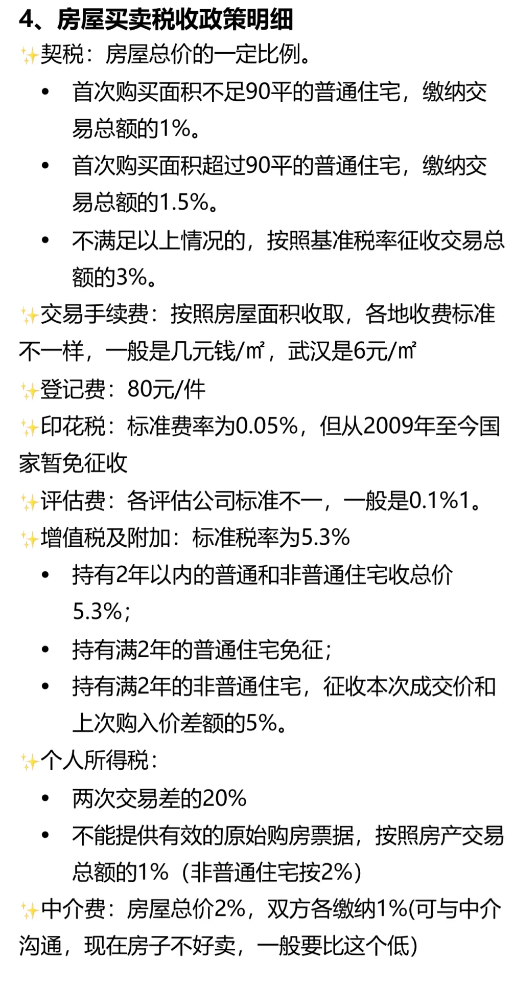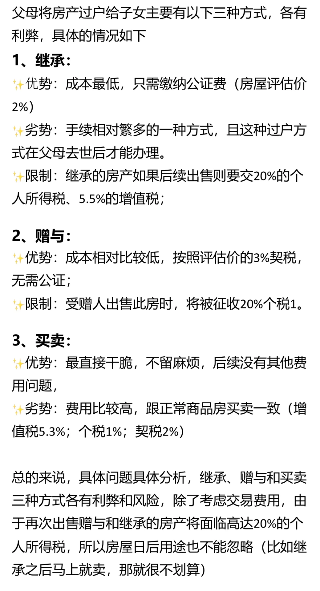 父母將房產(chǎn)過(guò)戶給子女主要有以下三種方式,各有利弊,具體的情況如下 1.繼承: 優(yōu)勢(shì):成本最低,只需繳納公證費(fèi)(房屋評(píng)估價(jià)2. 劣勢(shì):手續(xù)相對(duì)繁多的一種方式,且這種過(guò)戶方式在父母去世后才能辦理。 限制:繼承的房產(chǎn)如果后續(xù)出售則要交20%的個(gè)人所得稅、5.5%的增值稅; 2.贈(zèng)與: 優(yōu)勢(shì):成本相對(duì)比較低,按照評(píng)估價(jià)的3.契稅,無(wú)需公證; 限制:受贈(zèng)人出售此房時(shí),將被征收20%個(gè)稅1. 3.買(mǎi)賣(mài): 優(yōu)勢(shì):最直接干脆,不留麻煩,后續(xù)沒(méi)有其他費(fèi)用問(wèn)題, 劣勢(shì):費(fèi)用比較高,跟正常商品房買(mǎi)賣(mài)一致(增值稅5.3%;個(gè)稅1.契稅2. 總的來(lái)說(shuō),具體問(wèn)題具體分析,繼承、贈(zèng)與和買(mǎi)賣(mài)三種方式各有利弊和風(fēng)險(xiǎn),除了考慮交易費(fèi)用,由于再次出售贈(zèng)與和繼承的房產(chǎn)將面臨高達(dá)20%的個(gè)人所得稅,所以房屋日后用途也不能忽略(比如繼承之后馬上就賣(mài),那就很不劃算) 4.房屋買(mǎi)賣(mài)稅收政策明細(xì) 契稅:房屋總價(jià)的一定比例。 首次購(gòu)買(mǎi)面積不足90平的普通住宅,繳納交易總額的1. 首次購(gòu)買(mǎi)面積超過(guò)90平的普通住宅,繳納交易總額的1.5%。 不滿足以上情況的,按照基準(zhǔn)稅率征收交易總額的3. 交易手續(xù)費(fèi):按照房屋面積收取,各地收費(fèi)標(biāo)準(zhǔn)不一樣,一般是幾元錢(qián)/㎡,武漢是6.元/㎡ 登記費(fèi):80元/件 印花稅:標(biāo)準(zhǔn)費(fèi)率為0.05%,但從2009年至今國(guó)家暫免征收 評(píng)估費(fèi):各評(píng)估公司標(biāo)準(zhǔn)不一,一般是0.1%1。 增值稅及附加:標(biāo)準(zhǔn)稅率為5.3% 持有2.年以內(nèi)的普通和非普通住宅收總價(jià)5.3%; 持有滿2.年的普通住宅免征; 持有滿2.年的非普通住宅,征收本次成交價(jià)和上次購(gòu)入價(jià)差額的5. 個(gè)人所得稅: 兩次交易差的20% 不能提供有效的原始購(gòu)房票據(jù),按照房產(chǎn)交易總額的1.非普通住宅按2. 中介費(fèi):房屋總價(jià)2.雙方各繳納1.可與中介溝通,現(xiàn)在房子不好賣(mài),一般要比這個(gè)低)
