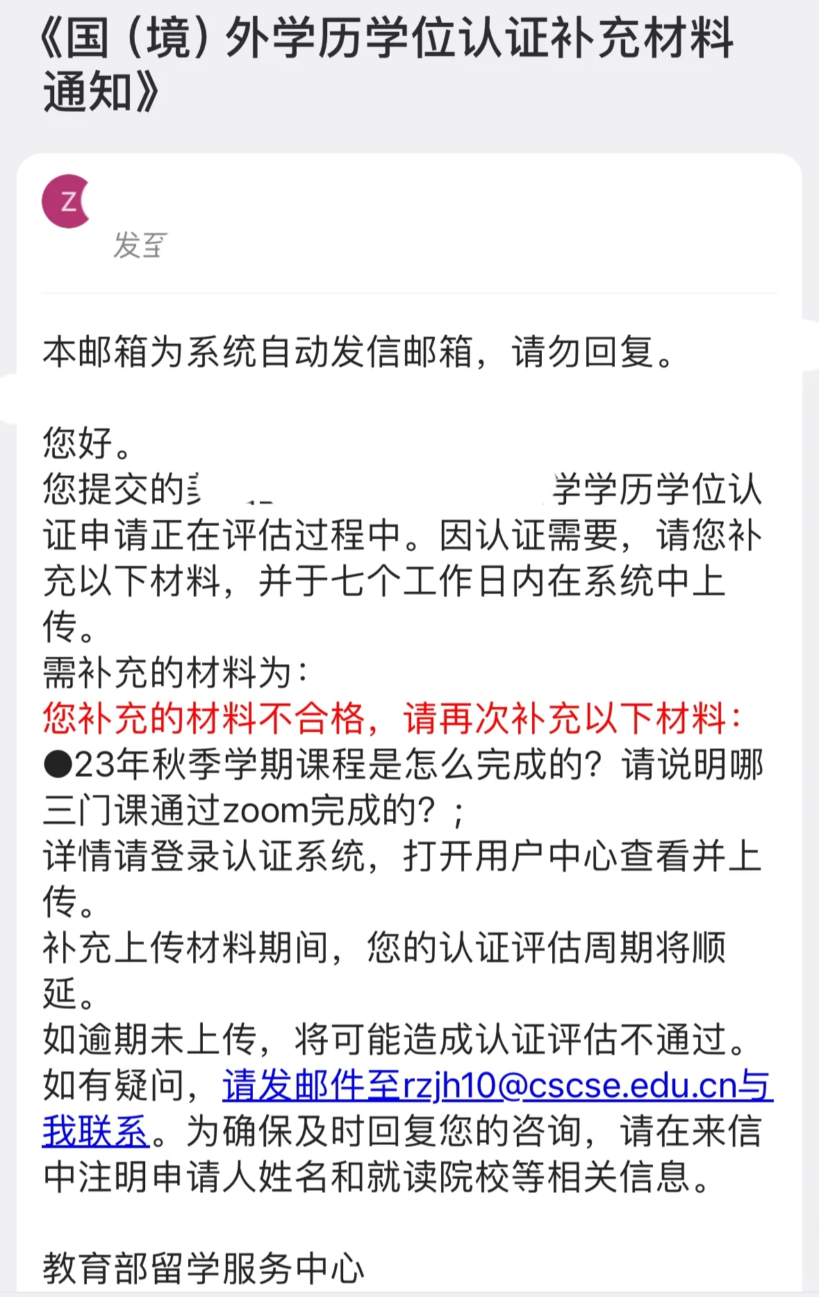 最后一學期回國秋招的友友,可能會遇到留服發(fā)郵件讓補充材料的情況,不用擔心,如實提交材料即可,絲滑通過 準備材料如下: 1.文字敘述本人情況(比如為什么回國,回國是通過什么方式進行學習的,列舉學習的課程有哪些等等) 以本人為例:本人第三期學期因為回國秋招面試,在XX時間段回國進行線上學習,學習的課程為XX且該課程授課方式多為會議老師提供了線上縮放渠道,允許線上學習,考核方式主要為演示以及小組項目無需線下進行考核。 2.相關的輔助材料(能夠證明你上述話真實的的內(nèi)容,截圖即可,每個文件大小不可以超過1M,PDF或者圖片都可以) 課表、課程教學大綱教授郵件、帆布上發(fā)布的通知、快速移動上課截圖、提交作業(yè)情況、成績單等等,要能證明你的確有完成課程學習 tl: 3.25提交認證 3.26要求補充材料 3.27補充二次材料(因為我沒有提及線上完成的課程具體是哪幾門,要求說明) 4.2認證成功 美國和加拿大認證一般七個工作日以內(nèi)就可以完成,其他地區(qū)需要多耐心等待一段時間~ 祝大家都認證順利!