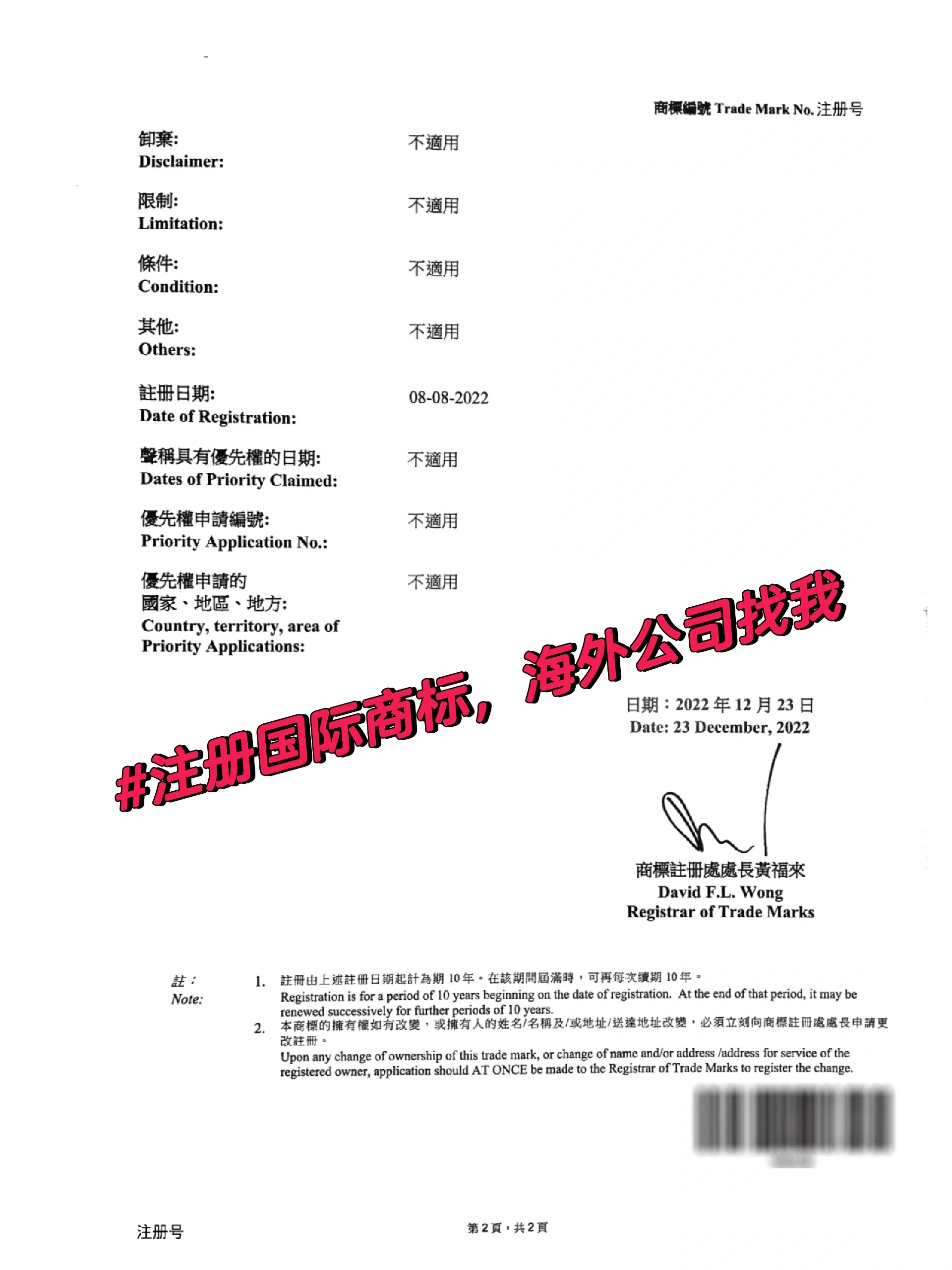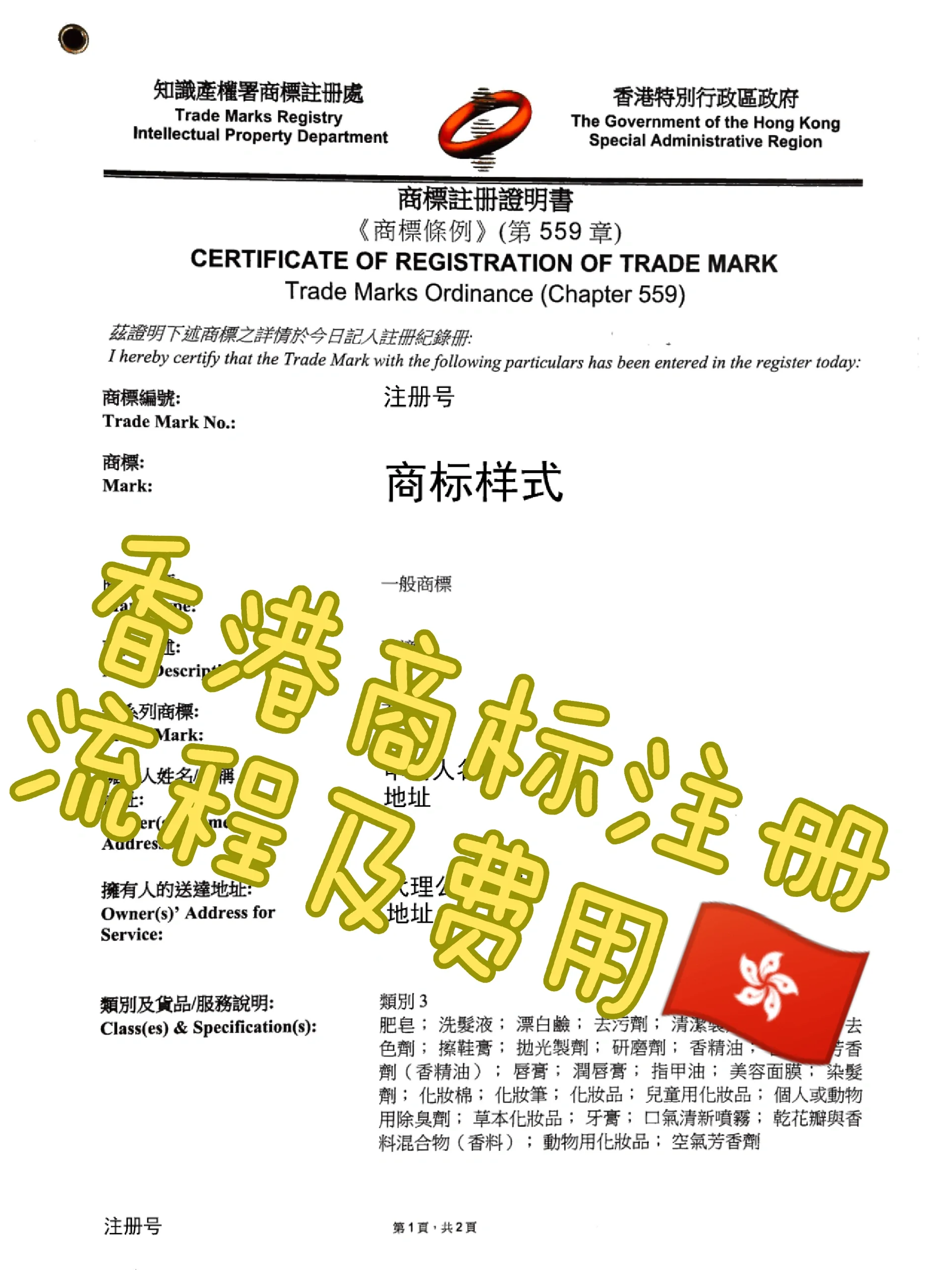 香港公司成立后,別忘了注冊商標(biāo),擁有香港商標(biāo)可以快速提升公司知名度,促進(jìn)海外市場的快速開放。 1、 香港的商標(biāo)注冊程序是什么 向香港知識產(chǎn)權(quán)局提交材料并申請注冊; 香港知識產(chǎn)權(quán)署接受申請并進(jìn)入審查階段; 申請商標(biāo)公告并進(jìn)入公告期; 如果在公告期內(nèi)有異議,申請人需要在一定時間內(nèi)進(jìn)行辯護(hù)(如果辯護(hù)不成功,則撤回商標(biāo)申請); 公示期結(jié)束,核準(zhǔn)注冊后,即可領(lǐng)取《香港商標(biāo)注冊證》。 2、 申請香港商標(biāo)需要準(zhǔn)備哪些文件 申請人資格 香港商標(biāo)既可以以個人名義申請,也可以以公司名義申請。個人申請需要身份證副本,而公司申請需要營業(yè)執(zhí)照副本。 清晰的商標(biāo)設(shè)計 建議背景為白色,基本顏色為黑色。成功注冊商標(biāo)后,可以更改顏色。如果指定了其他顏色,則注冊成功后無法更改顏色。 產(chǎn)品和類別 香港商標(biāo)不限制產(chǎn)品的具體數(shù)量,也可以選擇注冊整個類別的產(chǎn)品。 商標(biāo)注冊授權(quán)書 商標(biāo)注冊授權(quán)書由商標(biāo)代理機構(gòu)簽署,是對雙方權(quán)利義務(wù)的確認(rèn)。 3、 注冊香港商標(biāo)要多少錢 香港商標(biāo)注冊費包括:香港商標(biāo)公費+香港律師費+代理服務(wù)費。 4、 香港商標(biāo)的有效期是多少 根據(jù)香港商標(biāo)法,香港商標(biāo)的有效期為10年,此后可續(xù)期10年,續(xù)期次數(shù)不受限制。 5、 香港商標(biāo)證書的格式是什么 目前香港商標(biāo)均為紙質(zhì)證書。商標(biāo)局將首先將證書郵寄到代理商的地址,然后再郵寄給您。 需要注意的是,如果證書不幸丟失,需要補發(fā)的證書將是證書的副本,與原件不同(如圖所示),但法律效力不變。 以上是注冊香港商標(biāo)的流程、所需信息、費用及其他相關(guān)事宜,希望對您有所幫助