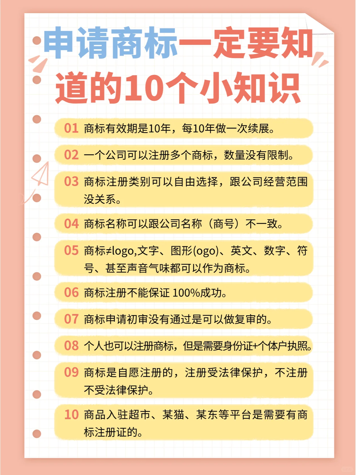 朋友們,今天我就來(lái)給大家講解10個(gè)關(guān)于申請(qǐng)商標(biāo)的晦澀知識(shí),幫助你更加熟練地保護(hù)品牌,遠(yuǎn)離法律風(fēng)險(xiǎn)!來(lái)和我一起看一看! 知識(shí)點(diǎn)1:商標(biāo)的有效期為10年,每10年更新一次。 知識(shí)點(diǎn)2:一個(gè)公司可以注冊(cè)無(wú)數(shù)的商標(biāo),沒(méi)有任何限制! 知識(shí)點(diǎn)三:商標(biāo)注冊(cè)類別可以自由選擇,不受公司經(jīng)營(yíng)范圍的限制! 知識(shí)點(diǎn)四:商標(biāo)的名稱可以與公司的名稱不同?;叵肫鹗裁? 知識(shí)點(diǎn)5:個(gè)人也可以注冊(cè)商標(biāo),但申請(qǐng)時(shí)需要攜帶身份證和個(gè)人營(yíng)業(yè)執(zhí)照! 知識(shí)點(diǎn)六:商標(biāo)不僅指標(biāo)志,還包括文字、圖形、英語(yǔ)、數(shù)字、符號(hào),甚至聲音和氣味!什么 知識(shí)點(diǎn)七:商標(biāo)注冊(cè)不能保證100%成功,你需要做好準(zhǔn)備! 知識(shí)點(diǎn)8:商標(biāo)是自愿注冊(cè)的,只有注冊(cè)才能受到法律保護(hù)! 知識(shí)點(diǎn)9:如果你想在超市、天貓和京東等平臺(tái)上儲(chǔ)存你的產(chǎn)品,你必須有商標(biāo)注冊(cè)證書! 知識(shí)點(diǎn)10:如果商標(biāo)申請(qǐng)初審失敗,不要?dú)怵H。你可以繼續(xù)復(fù)查了! 朋友們,關(guān)于申請(qǐng)商標(biāo)注冊(cè)的這些重要知識(shí),你們都掌握了嗎