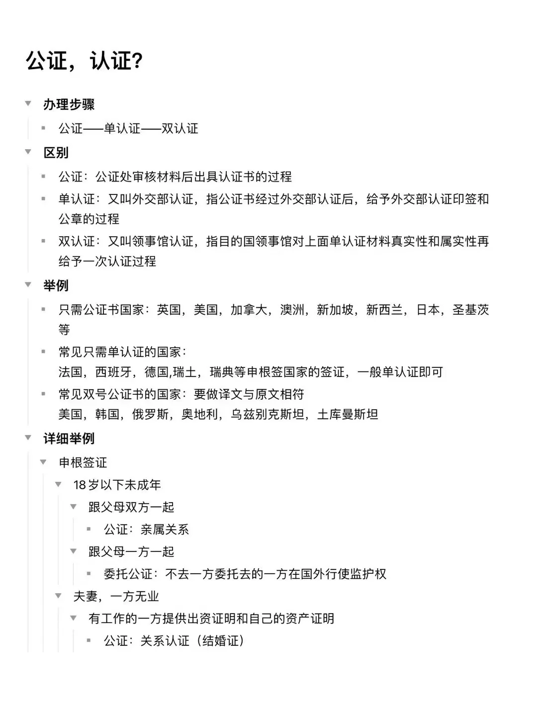 最近我咨詢了很多朋友,他們在申請簽證的時候,有時是公證的,有時是單證的,有時又是雙證的,這讓他們覺得很困惑;今天,我將詳細談談公證、單一認證和雙重認證的區(qū)別,以及處理所需的文件和流程。另外,趁熱分享你處理這件事的經(jīng)驗,大家留著吧! 處理步驟 公證-單一認證-雙重認證 差別 公證:公證處審核材料后出具證明函的過程 單一認證:也稱外交部認證,是指公共證書經(jīng)外交部認證并加蓋外交部印章進行認證的過程 雙重認證:也稱領事館認證,是指目標國領事館對上述單一認證材料的真實性和真實性提供另一個認證過程 說明 只需要經(jīng)過認證的國家/地區(qū):英國、美國、加拿大、澳大利亞、新加坡、新西蘭、日本、圣基茨等 僅需要單一身份驗證的常見國家/地區(qū): 申根簽證國家(如法國、西班牙、德國、瑞士、瑞典等)的簽證通常需要單一認證 具有雙重編號公證證書的常見國家:翻譯應與原文一致 美國、韓國、俄羅斯、奧地利、烏茲別克斯坦、土庫曼斯坦 詳細示例 申根簽證 18歲以下和成年以下與父母雙方一起 公證:親屬關系 18歲以下未成年人與父母一方一起 委托公證:不委托對方在境外行使監(jiān)護權的一方 夫妻一方失業(yè) 工作組提供出資證明和自身資產(chǎn)證明 公證:關系證明(結婚證)
