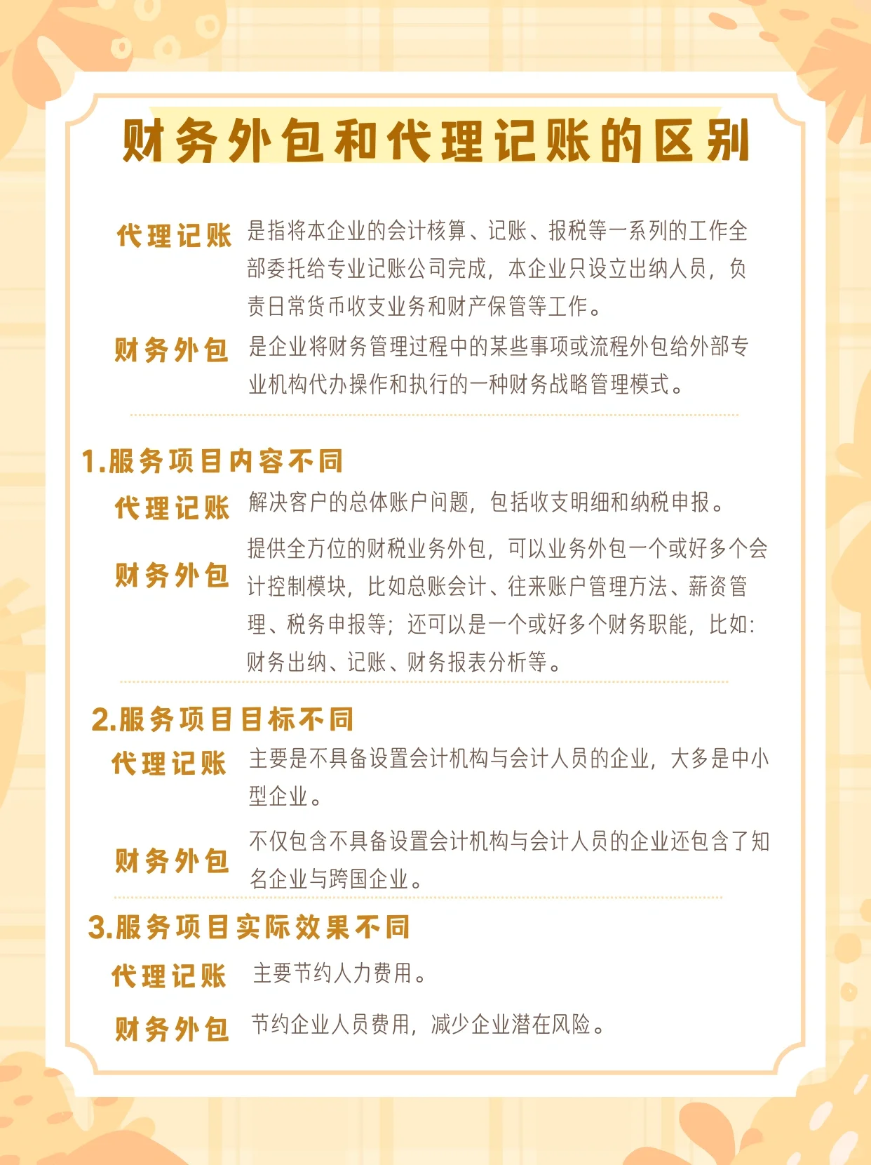 今天,我就和大家分享一下財務外包和外包記賬的區(qū)別 代理記賬 是指委托專業(yè)的會計公司為我公司完成會計、記賬、納稅申報等一系列工作。我們公司只設立出納,負責日常的貨幣交易和物業(yè)管理。 金融外包 它是企業(yè)將財務管理過程中的某些事項或過程外包給外部專業(yè)組織進行運營和執(zhí)行的財務戰(zhàn)略管理模式。 財務外包和外包會計主要在服務項目、服務目標和服務目標方面有所不同 1.不同的服務項目 代理記賬 解決客戶的整體賬戶問題,包括收入和支出明細以及納稅申報。 金融外包 全面的財稅外包可以涉及外包一個或多個會計控制模塊,如總賬核算、活期賬戶管理方法、薪資管理、納稅申報等;它也可以是一個或多個財務功能,如財務出納、記賬、財務報表分析等。 2.不同的服務項目目標 代理記賬 主要針對沒有能力建立會計機構和人員的企業(yè),其中大多數(shù)是中小企業(yè)。 金融外包 它不僅包括沒有能力建立會計機構和人員的企業(yè),還包括知名企業(yè)和跨國公司。 3.服務項目的實際效果不同 代理記賬 主要節(jié)省人工成本。 金融外包 為企業(yè)節(jié)省人員成本,降低潛在風險。