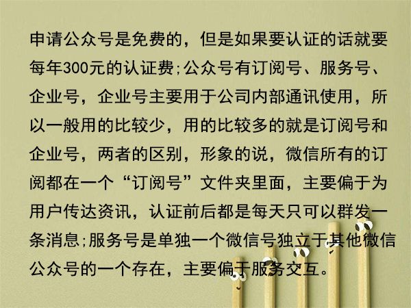 申請公眾號是免費的,但是如果要認證的話就要每年300元的認證費;公眾號有訂閱號、服務號、企業(yè)號,企業(yè)號主要用于公司內(nèi)部通訊使用,所以一般用的比較少,用的比較多的就是訂閱號和企業(yè)號,兩者的區(qū)別,形象的說,微信所有的訂閱都在一個“訂閱號”文件夾里面,主要偏于為用戶傳達資訊,認證前后都是每天只可以群發(fā)一條消息;服務號是單獨一個微信號獨立于其他微信公眾號的一個存在,主要偏于服務交互。