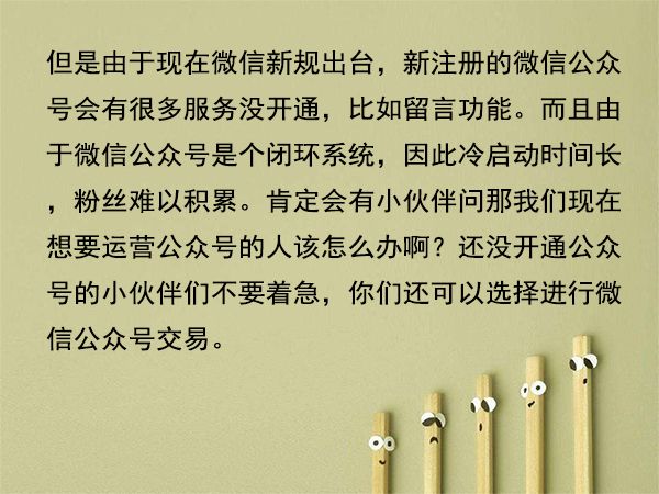 但是由于現(xiàn)在微信新規(guī)出臺,新注冊的微信公眾號會有很多服務沒開通,比如留言功能。而且由于微信公眾號是個閉環(huán)系統(tǒng),因此冷啟動時間長,粉絲難以積累??隙〞行』锇閱柲俏覀儸F(xiàn)在想要運營公眾號的人該怎么辦?。窟€沒開通公眾號的小伙伴們不要著急,你們還可以選擇進行微信公眾號交易。