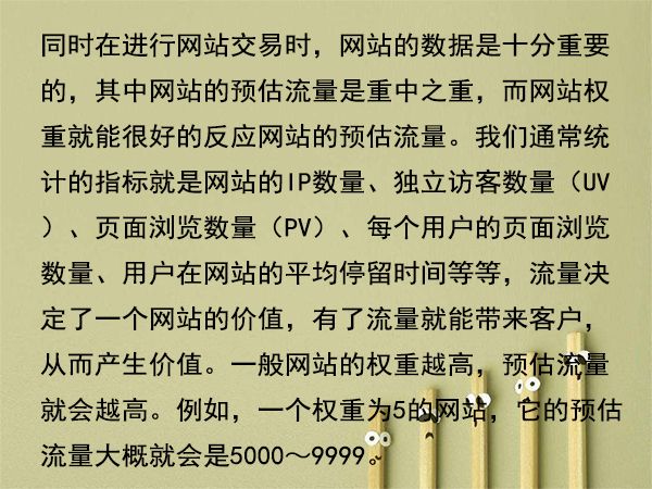 同時(shí)在進(jìn)行網(wǎng)站交易時(shí),網(wǎng)站的數(shù)據(jù)是十分重要的,其中網(wǎng)站的預(yù)估流量是重中之重,而網(wǎng)站權(quán)重就能很好的反應(yīng)網(wǎng)站的預(yù)估流量。我們通常統(tǒng)計(jì)的指標(biāo)就是網(wǎng)站的IP數(shù)量、獨(dú)立訪客數(shù)量(UV)、頁面瀏覽數(shù)量(PV)、每個(gè)用戶的頁面瀏覽數(shù)量、用戶在網(wǎng)站的平均停留時(shí)間等等,流量決定了一個(gè)網(wǎng)站的價(jià)值,有了流量就能帶來客戶,從而產(chǎn)生價(jià)值。一般網(wǎng)站的權(quán)重越高,預(yù)估流量就會(huì)越高。例如,一個(gè)權(quán)重為5的網(wǎng)站,它的預(yù)估流量大概就會(huì)是5000~9999。