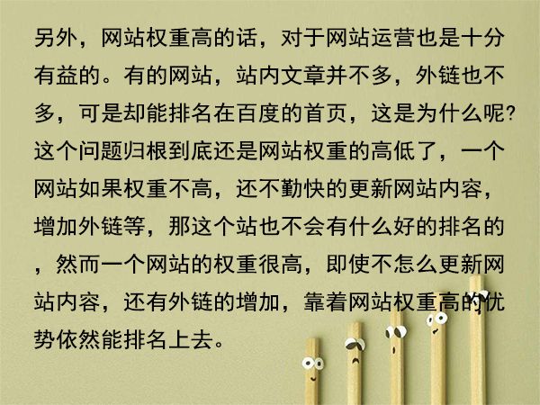 另外,網(wǎng)站權(quán)重高的話,對(duì)于網(wǎng)站運(yùn)營(yíng)也是十分有益的。有的網(wǎng)站,站內(nèi)文章并不多,外鏈也不多,可是卻能排名在百度的首頁,這是為什么呢?這個(gè)問題歸根到底還是網(wǎng)站權(quán)重的高低了,一個(gè)網(wǎng)站如果權(quán)重不高,還不勤快的更新網(wǎng)站內(nèi)容,增加外鏈等,那這個(gè)站也不會(huì)有什么好的排名的,然而一個(gè)網(wǎng)站的權(quán)重很高,即使不怎么更新網(wǎng)站內(nèi)容,還有外鏈的增加,靠著網(wǎng)站權(quán)重高的優(yōu)勢(shì)依然能排名上去。