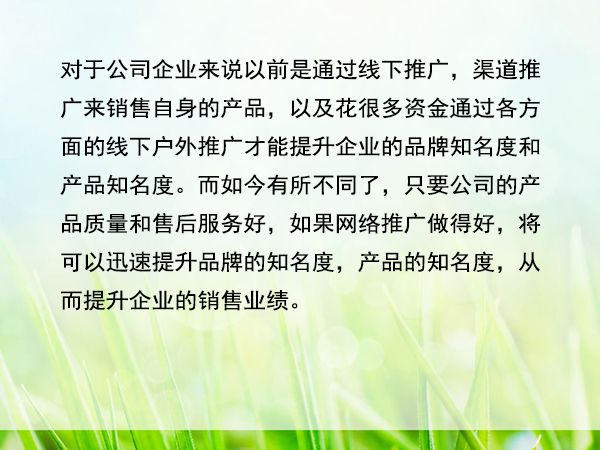 對于公司企業(yè)來說以前是通過線下推廣,渠道推廣來銷售自身的產(chǎn)品,以及花很多資金通過各方面的線下戶外推廣才能提升企業(yè)的品牌知名度和產(chǎn)品知名度。而如今有所不同了,只要公司的產(chǎn)品質(zhì)量和售后服務(wù)好,如果通過建設(shè)網(wǎng)站,從而網(wǎng)絡(luò)推廣做得好,將可以迅速提升品牌的知名度,產(chǎn)品的知名度,從而提升企業(yè)的銷售業(yè)績。
