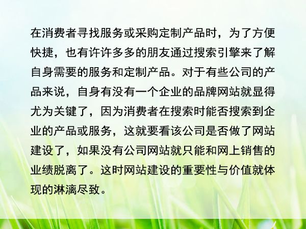 在消費(fèi)者尋找服務(wù)或采購定制產(chǎn)品時,為了方便快捷,也有許許多多的朋友通過搜索引擎來了解自身需要的服務(wù)和定制產(chǎn)品。對于有些公司的產(chǎn)品來說,自身有沒有一個企業(yè)的品牌網(wǎng)站就顯得尤為關(guān)鍵了,因?yàn)橄M(fèi)者在搜索時能否搜索到企業(yè)的產(chǎn)品或服務(wù),這就要看該公司是否做了網(wǎng)站建設(shè)了,如果沒有公司網(wǎng)站就只能和網(wǎng)上銷售的業(yè)績脫離了。這時網(wǎng)站建設(shè)的重要性與價值就體現(xiàn)的淋漓盡致。